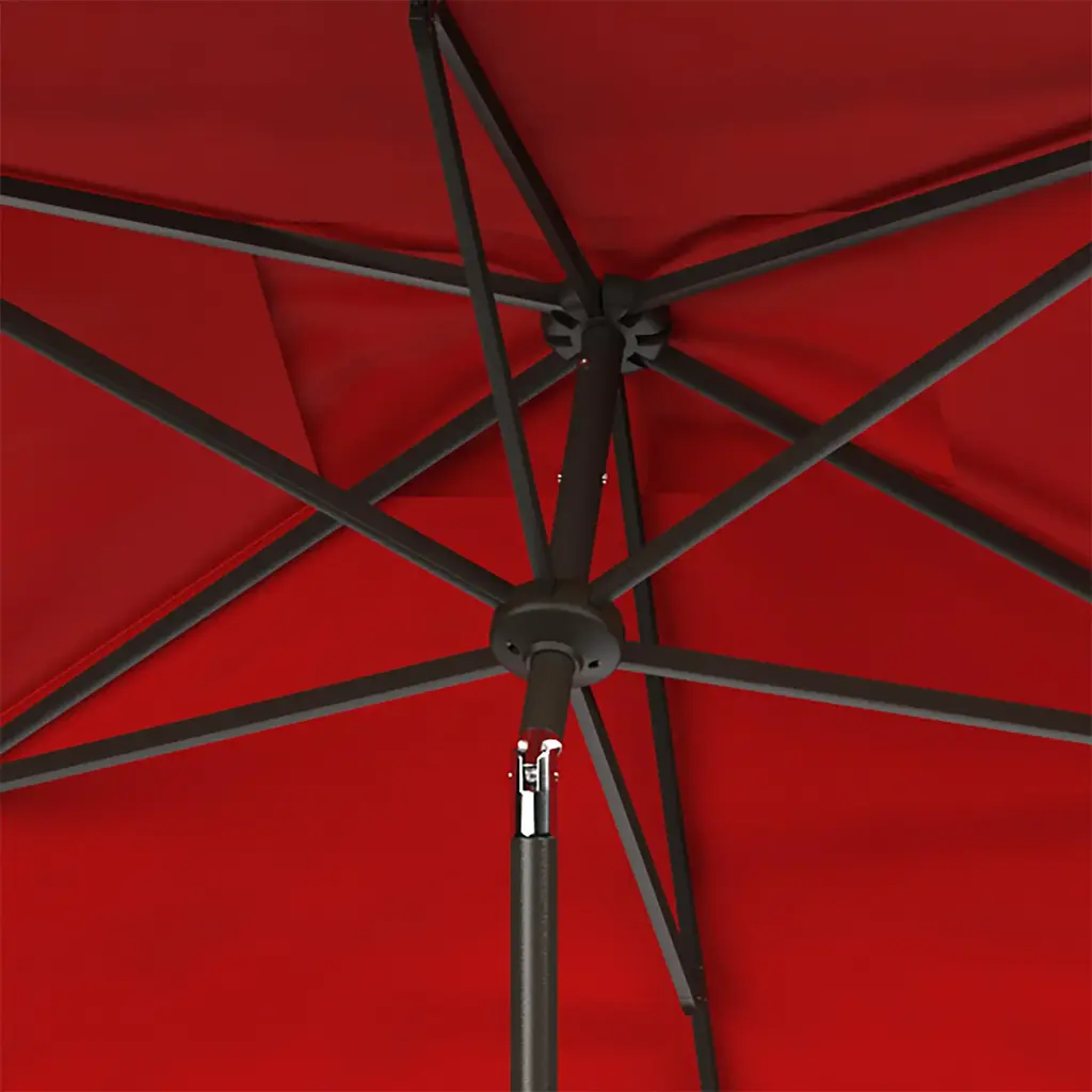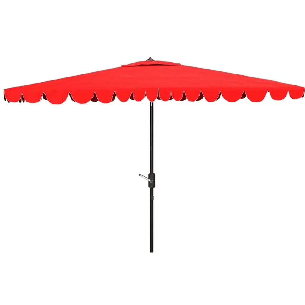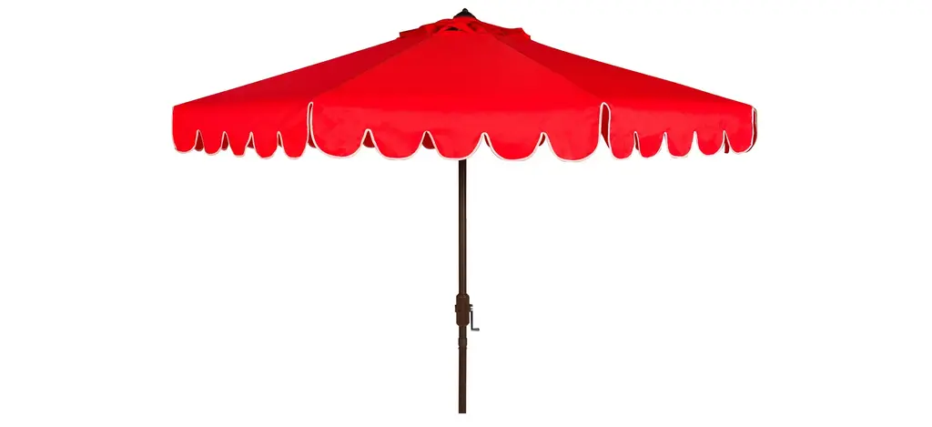 The signature white and red coloration of Santorini’s lush legendary resort inspired this rectangleangular market umbrella. Its sophisticated red hue features a scalloped white trim to create an outdoor retreat for the modern tastemaker. Open Dimensions: 118.11" x 78.74" x 106.3" Closed Dimensions: 6.1" x 106.3" Care Instructions: Store outdoor furniture indoors or cover well when not in use. Remove wooden furniture from standing water. Dust regularly with small brush or vacuum. Spills should be taken care of immediately before they harden or stain with a slightly dampened sponge. Do not use bleach solutions.