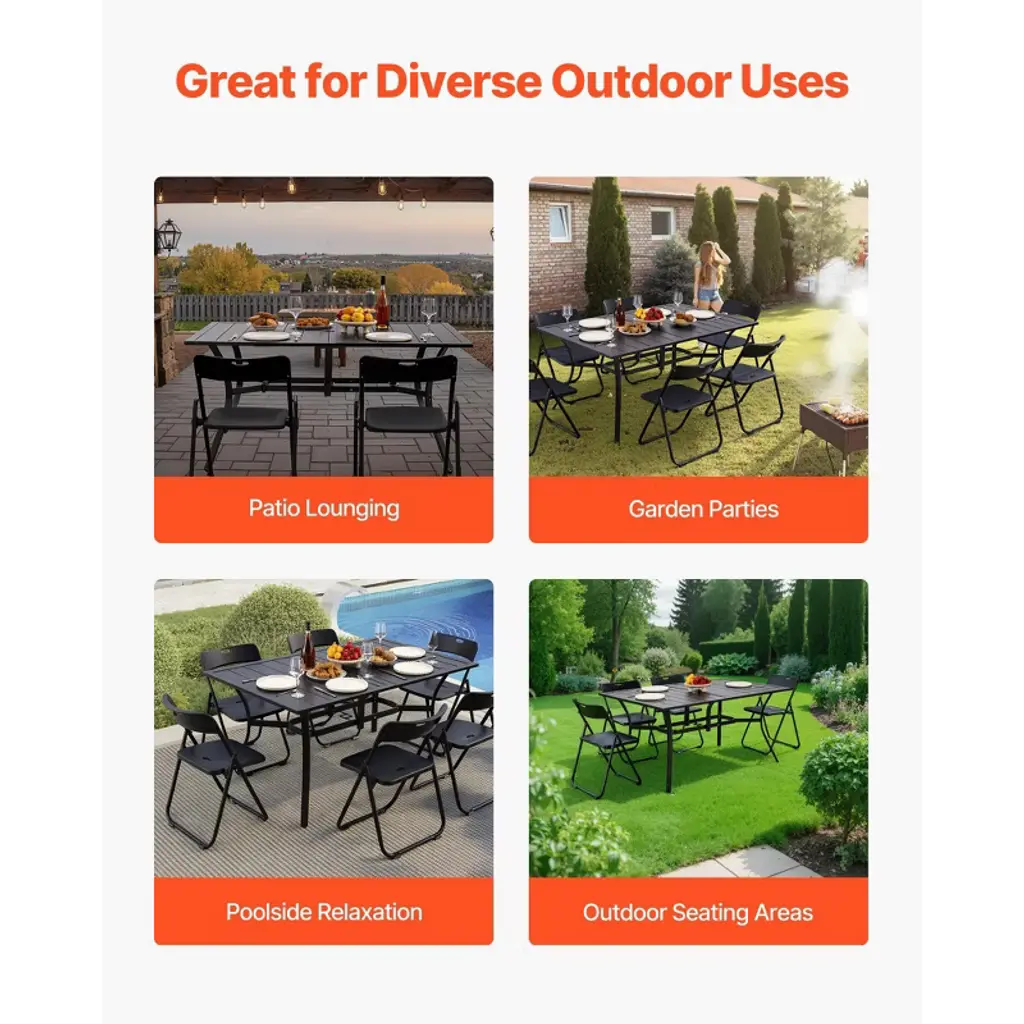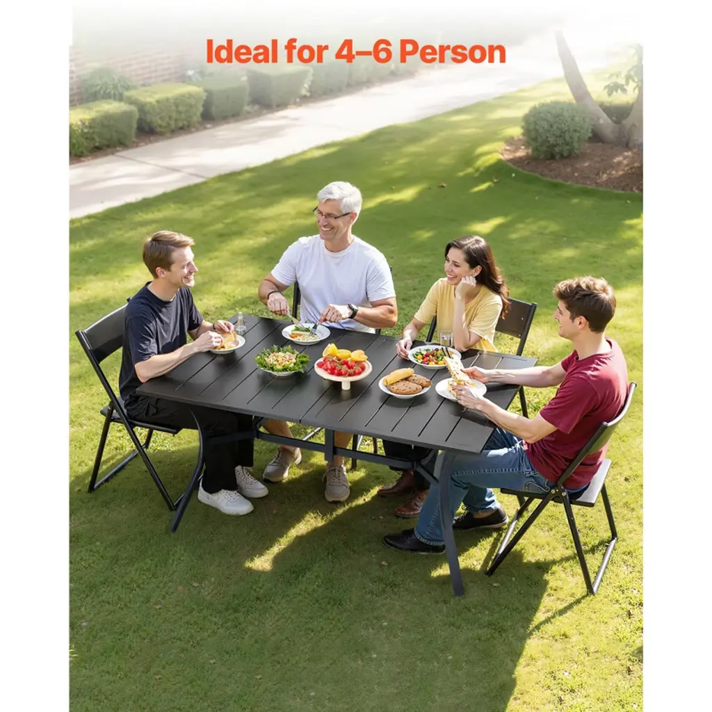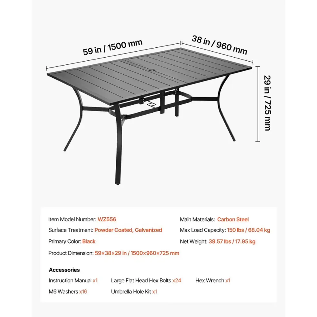 Feature: Seats 4–6 People: This patio dining table features a 59x38 in (1500x960 mm) tabletop, large enough for family meals or small gatherings. The table comes with easy-to-follow assembly instructions and all necessary hardware, making setup a breeze Rust and Weather Resistant: Crafted with galvanized carbon steel, the patio table's tabletop is built for longevity and stands up to harsh outdoor conditions. Simply wipe away grease or spills with a damp cloth—no special maintenance required Sturdy and Durable: With 150 lbs/68kg weight capacity, this backyard bistro table features heavy-duty legs that remain stable even in strong winds or heavy rain. Equipped with non-slip feet, so you don't have to worry about tipping Umbrella Hole Design: This patio table for outside includes a 1.5in/38mm umbrella hole. If you prefer not to use the umbrella ring, you can fit a patio umbrella with a handle diameter up to 1.89in/48mm, providing comfort in both sun and rain Wide Applications: Our outdoor patio dining table is ideal for patio, garden, balcony, porch, or front and backyard. Versatile and practical, it's suitable for barbecues, gatherings, and parties—a great addition to any outdoor space Package Content 1 x Outdoor Patio Dining Table 1 x Set of Accessories