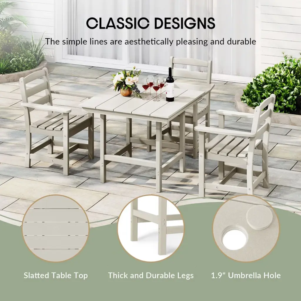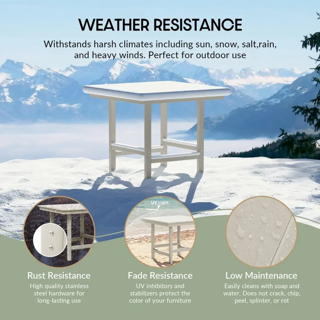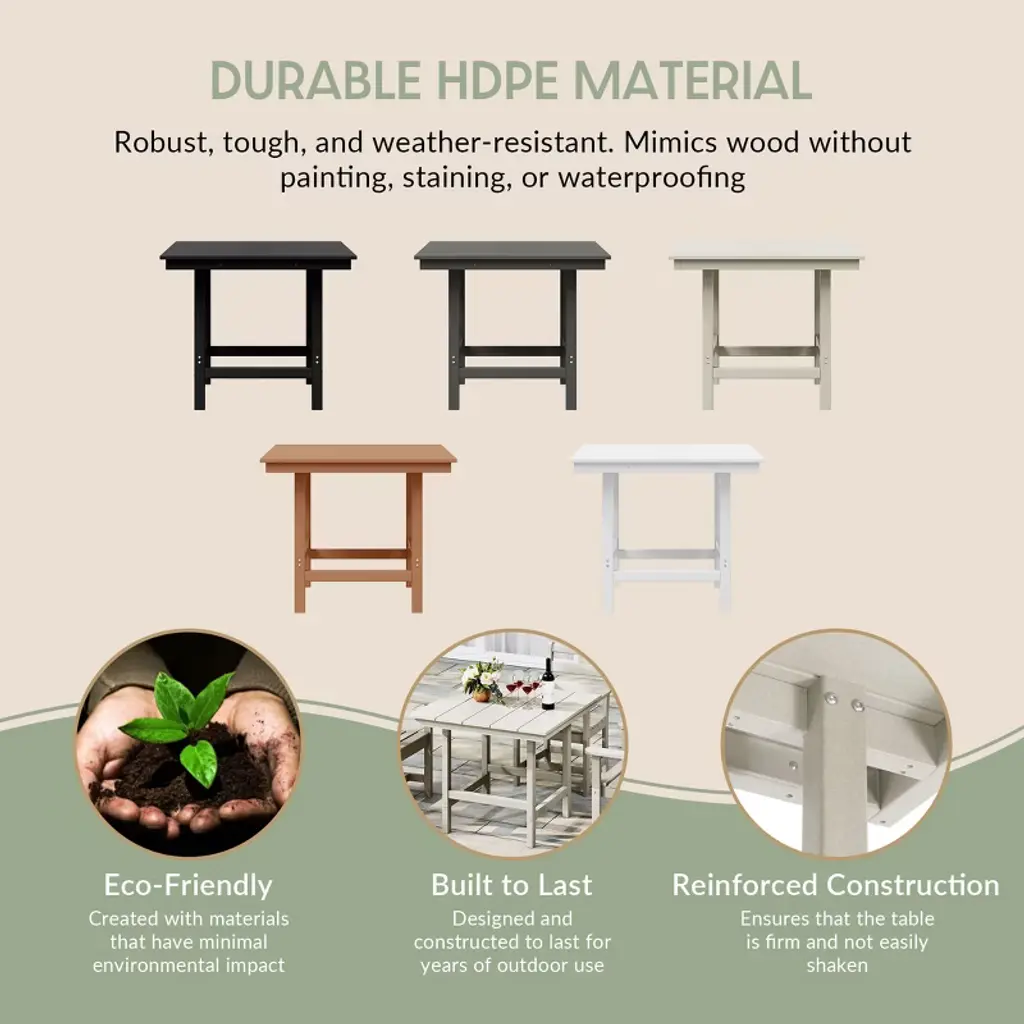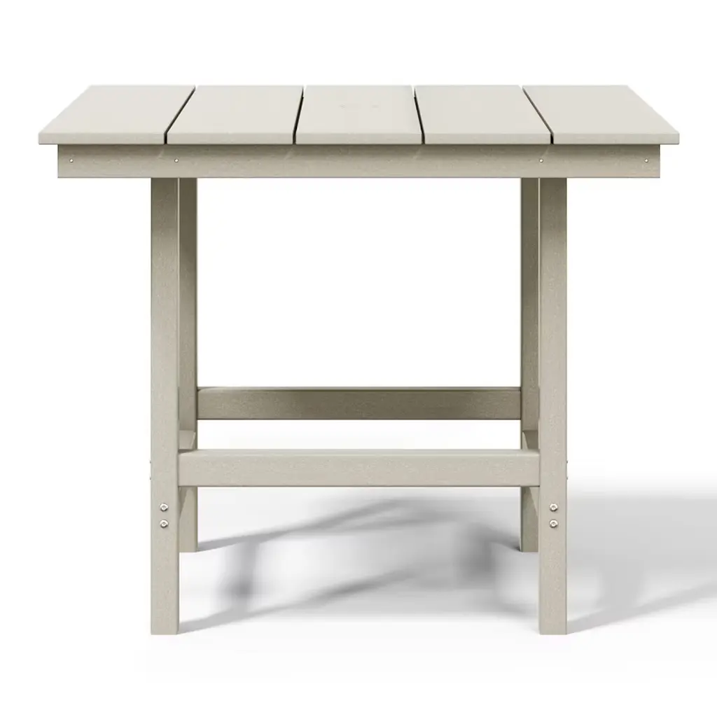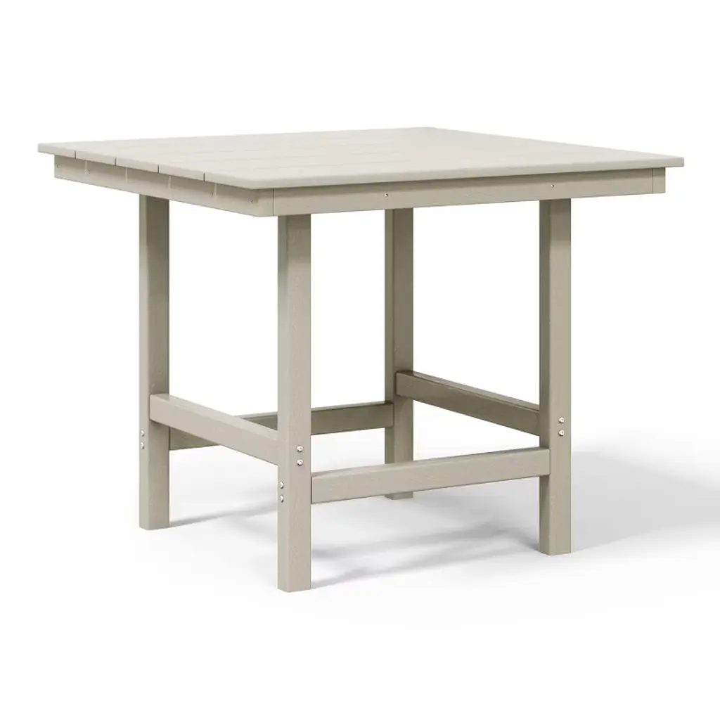 Gather around and make lasting memories with loved ones at our timeless 36" wide square patio dining table. Made from premium, all-weather HDPE material, this table is designed to resist fading and UV damage, making it perfect for outdoor living. Embrace sun-filled days with ease, thanks to a thoughtfully designed 1.9" umbrella hole—ideal for adding your favorite patio umbrella. Crafted with a reinforced frame, this table is built to last, providing stability and reducing the risk of warping or wobbling for years of effortless enjoyment.While we strive to accurately represent product colors, please be aware that actual colors may vary slightly due to individual screen settings and lighting conditions. FeaturesConstructed from Durable HDPE Material and Designed to be Stable and SturdyWeather Resistant to Protect Against the Harsh Outdoor ElementsFade and UV Resistant to Protect Against the SunReinforced Design with a Support Beam Construction and Stainless Steel Plates that Run Along the Side Skirts for Added Durability and Help Prevent WarpingThick and Sturdy Legs with a Beam Connection to Help Reduce Wobbling and Distributes WeightDurable and Tough with the All-Weather Material that is Resistant to Splinters, Cracking, or Peeling and Simple to Clean with Lukewarm Water, Mild Soap, and a Soft Bristle BrushSeats Up to 4 Guest Comfortably with the Spacious 36" Wide Table Top and has a 300Lbs Weight CapacityDetails:Product Type: Patio Dining TablesWhat's Included: (1) Dining TableDining TableDimensions: 35.75" W x 35.75" D x 29.5" HWeight: 52.75 lbs.Weight Capacity: 300 lbs.