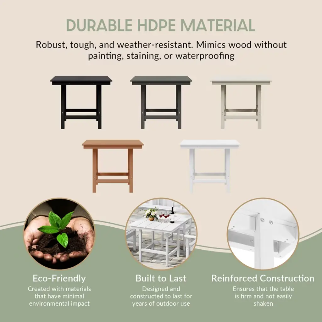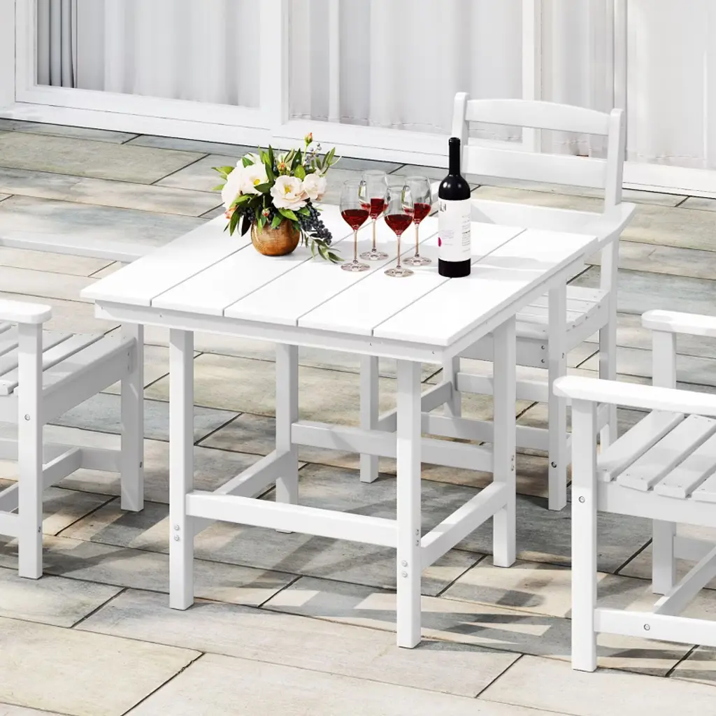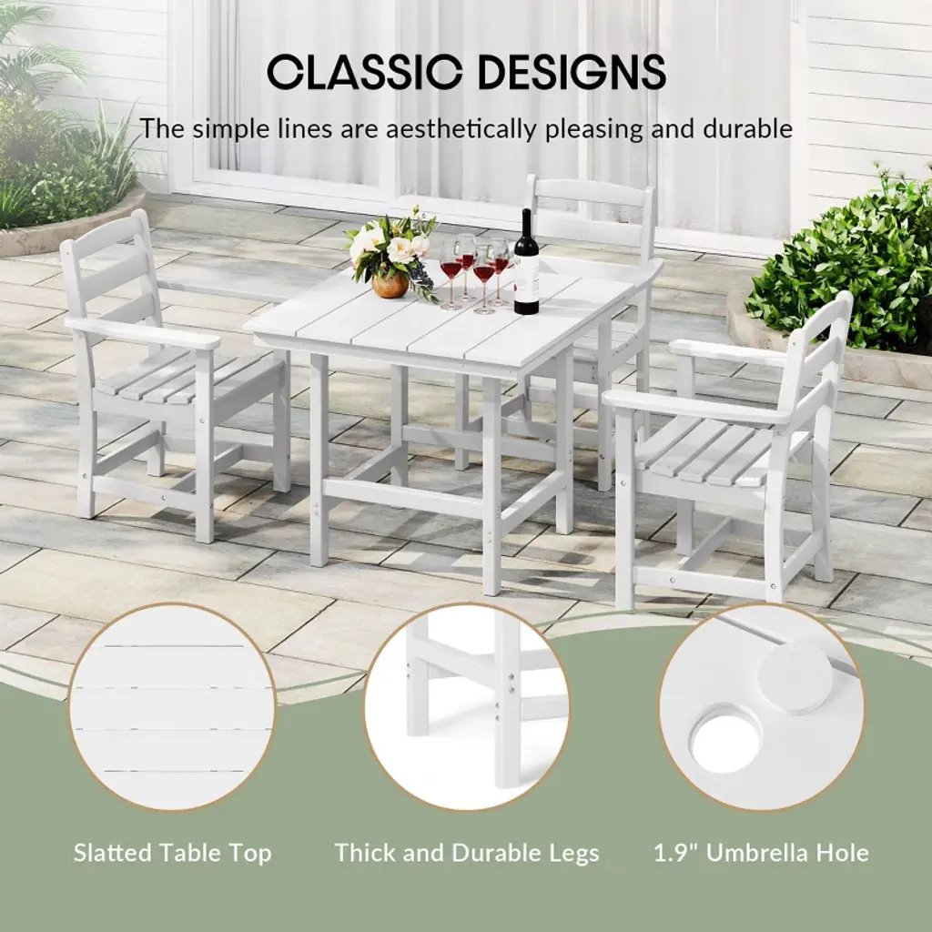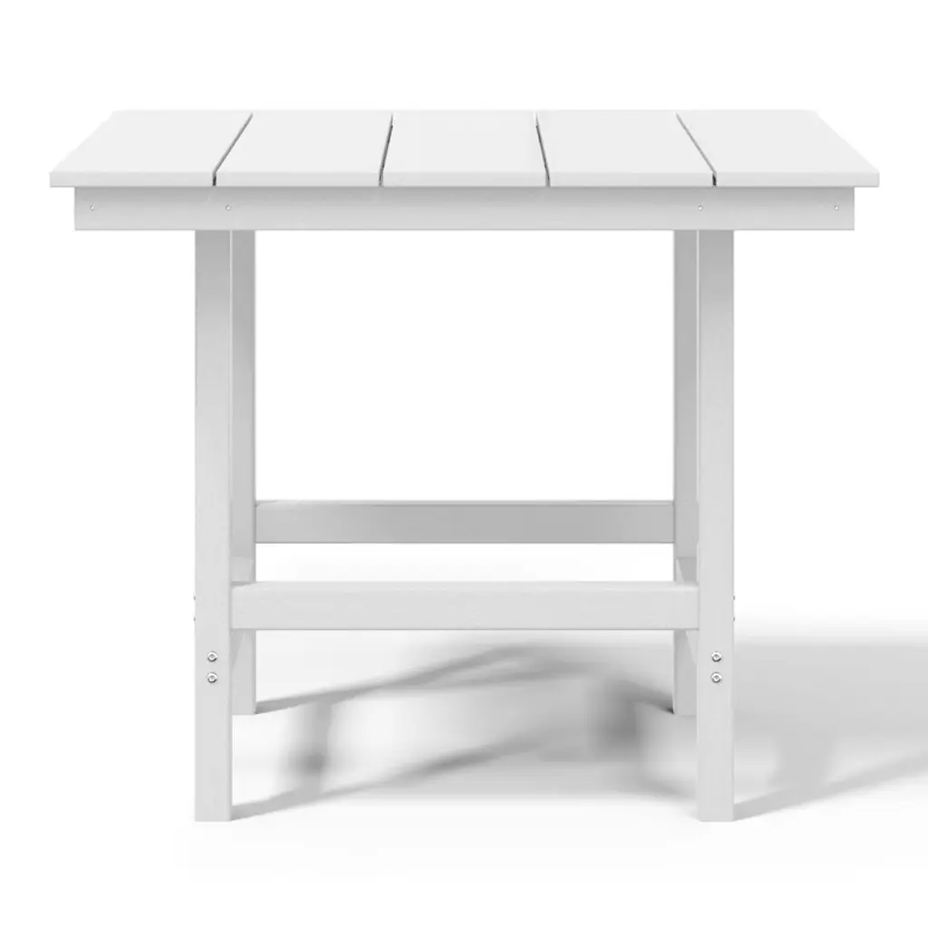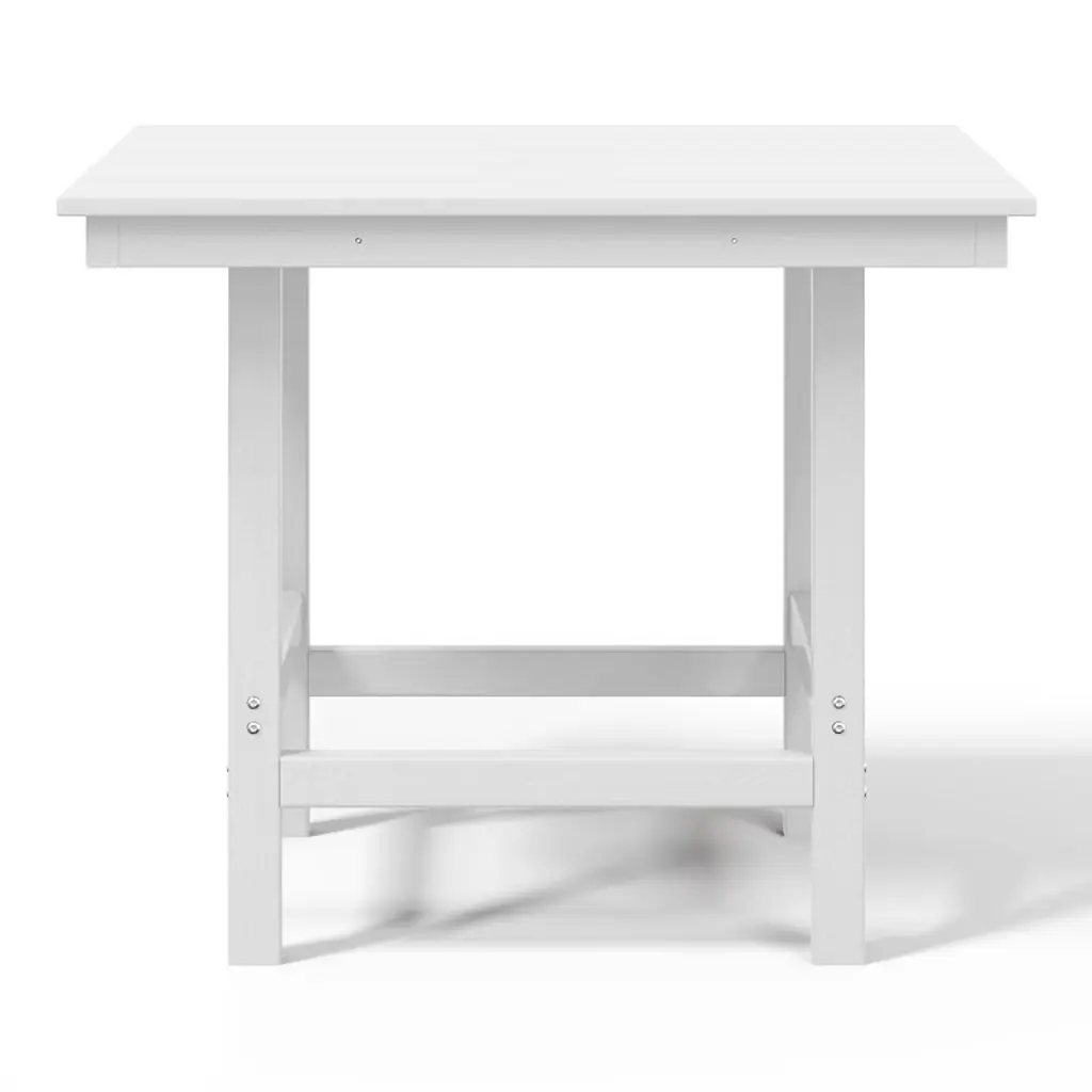 Gather around and make lasting memories with loved ones at our timeless 36" wide square patio dining table. Made from premium, all-weather HDPE material, this table is designed to resist fading and UV damage, making it perfect for outdoor living. Embrace sun-filled days with ease, thanks to a thoughtfully designed 1.9" umbrella hole—ideal for adding your favorite patio umbrella. Crafted with a reinforced frame, this table is built to last, providing stability and reducing the risk of warping or wobbling for years of effortless enjoyment.While we strive to accurately represent product colors, please be aware that actual colors may vary slightly due to individual screen settings and lighting conditions. FeaturesConstructed from Durable HDPE Material and Designed to be Stable and SturdyWeather Resistant to Protect Against the Harsh Outdoor ElementsFade and UV Resistant to Protect Against the SunReinforced Design with a Support Beam Construction and Stainless Steel Plates that Run Along the Side Skirts for Added Durability and Help Prevent WarpingThick and Sturdy Legs with a Beam Connection to Help Reduce Wobbling and Distributes WeightDurable and Tough with the All-Weather Material that is Resistant to Splinters, Cracking, or Peeling and Simple to Clean with Lukewarm Water, Mild Soap, and a Soft Bristle BrushSeats Up to 4 Guest Comfortably with the Spacious 36" Wide Table Top and has a 300Lbs Weight CapacityDetails:Product Type: Patio Dining TablesWhat's Included: (1) Dining TableDining TableDimensions: 35.75" W x 35.75" D x 29.5" HWeight: 52.75 lbs.Weight Capacity: 300 lbs.