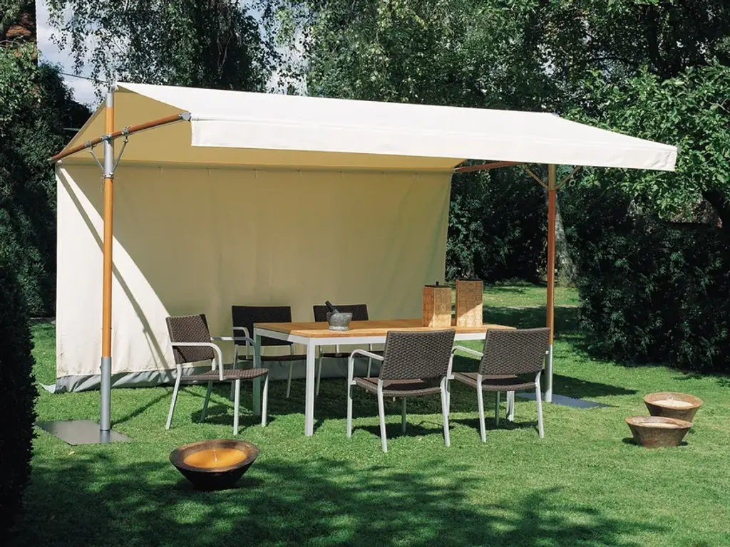 Woodline Piuma is a large sun canopy with which there are also side walls. This sun canopy can be opened and closed by means of a crank. There are 2 sizes offered.
