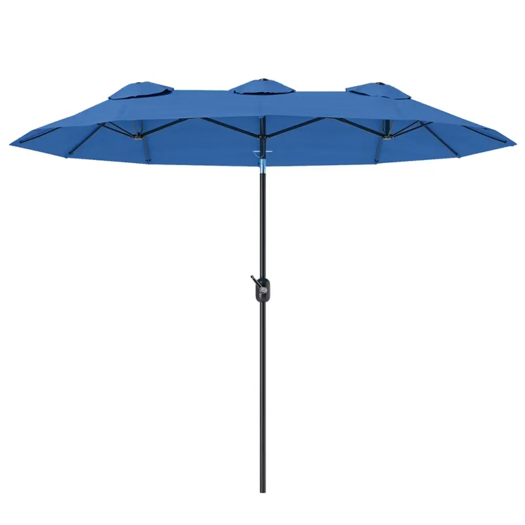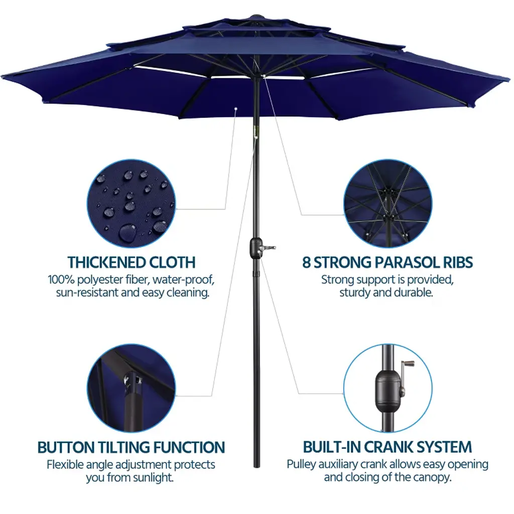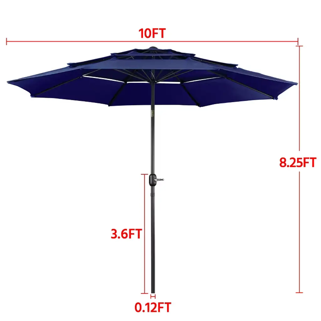 An outdoor umbrella is one of the most worth-investing additions for the patio, garden, deck, poolside, café and restaurant. Take our 11ft patio umbrella as an example. It can provide you with a generous shade over a patio furniture set of a 60" round, square or rectangle table and 6 to 8 chairs or 3 to 4 pool loungers, protecting you from the unrelenting sun and unbearable heat. Made of durable 180g polyester canopy and rust-resistant powder-coated metal frame, this sturdy outdoor umbrella also features user-friendly designs like convenient hand-crank lift and push-button tilt adjustment to maximize your enjoyment. Easy setup is required for this garden umbrella. Specifications: Colour: Tan, Sky Blue, Navy Blue, Blue, Red, BurgandyMaterials: Iron, Aluminum, 220g PolyesterOverall Dimensions: 10ft × 10ft × 8.25 ft(Dia.× Dia.× H)Center Pole (Dia.): 0.12 ftLower Center Pole Length: 3.6 ft Note: 1. Please see the image for exact measurements.2. Please note that the umbrella stand/base is not included in this item.3. Please allow errors due to manual measurement.4. A 65-75 lb base is recommended.
