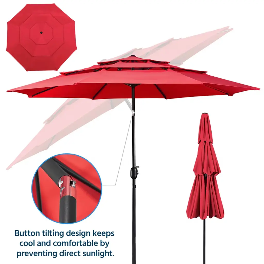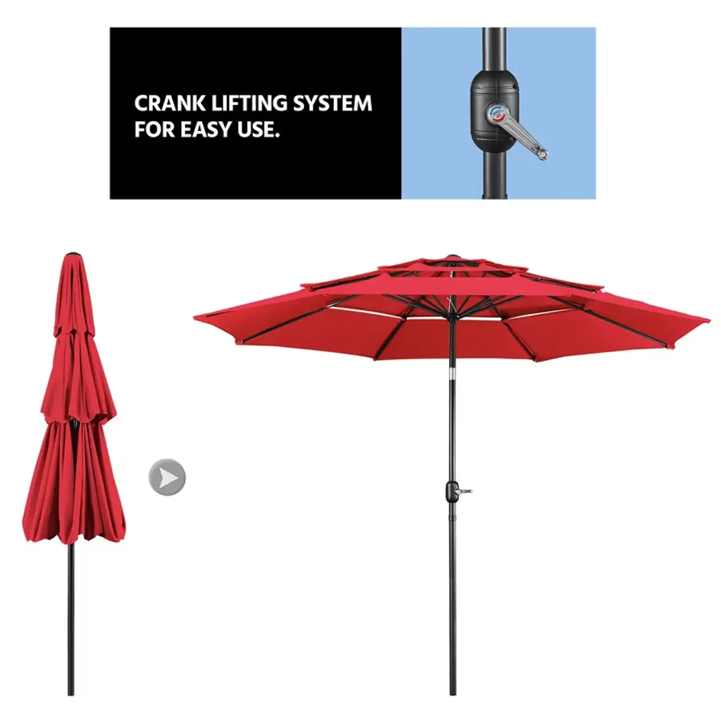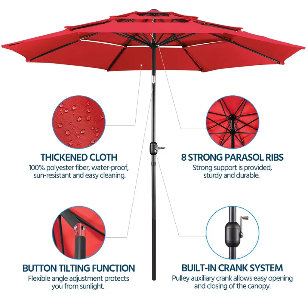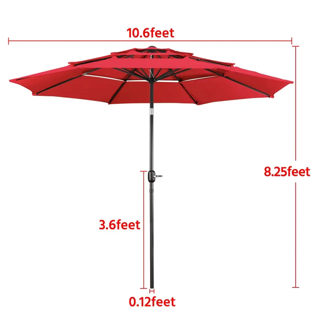 An outdoor umbrella is one of the most worth-investing additions for the patio, garden, deck, poolside, café and restaurant. Take our 11ft patio umbrella as an example. It can provide you with a generous shade over a patio furniture set of a 60" round, square or rectangle table and 6 to 8 chairs or 3 to 4 pool loungers, protecting you from the unrelenting sun and unbearable heat. Made of durable 180g polyester canopy and rust-resistant powder-coated metal frame, this sturdy outdoor umbrella also features user-friendly designs like convenient hand-crank lift and push-button tilt adjustment to maximize your enjoyment. Easy setup is required for this garden umbrella. Specifications: Colour: Tan, Sky Blue, Navy Blue, Blue, Red, BurgandyMaterials: Iron, Aluminum, 220g PolyesterOverall Dimensions: 10ft × 10ft × 8.25 ft(Dia.× Dia.× H)Center Pole (Dia.): 0.12 ftLower Center Pole Length: 3.6 ft Note: 1. Please see the image for exact measurements.2. Please note that the umbrella stand/base is not included in this item.3. Please allow errors due to manual measurement.4. A 65-75 lb base is recommended.