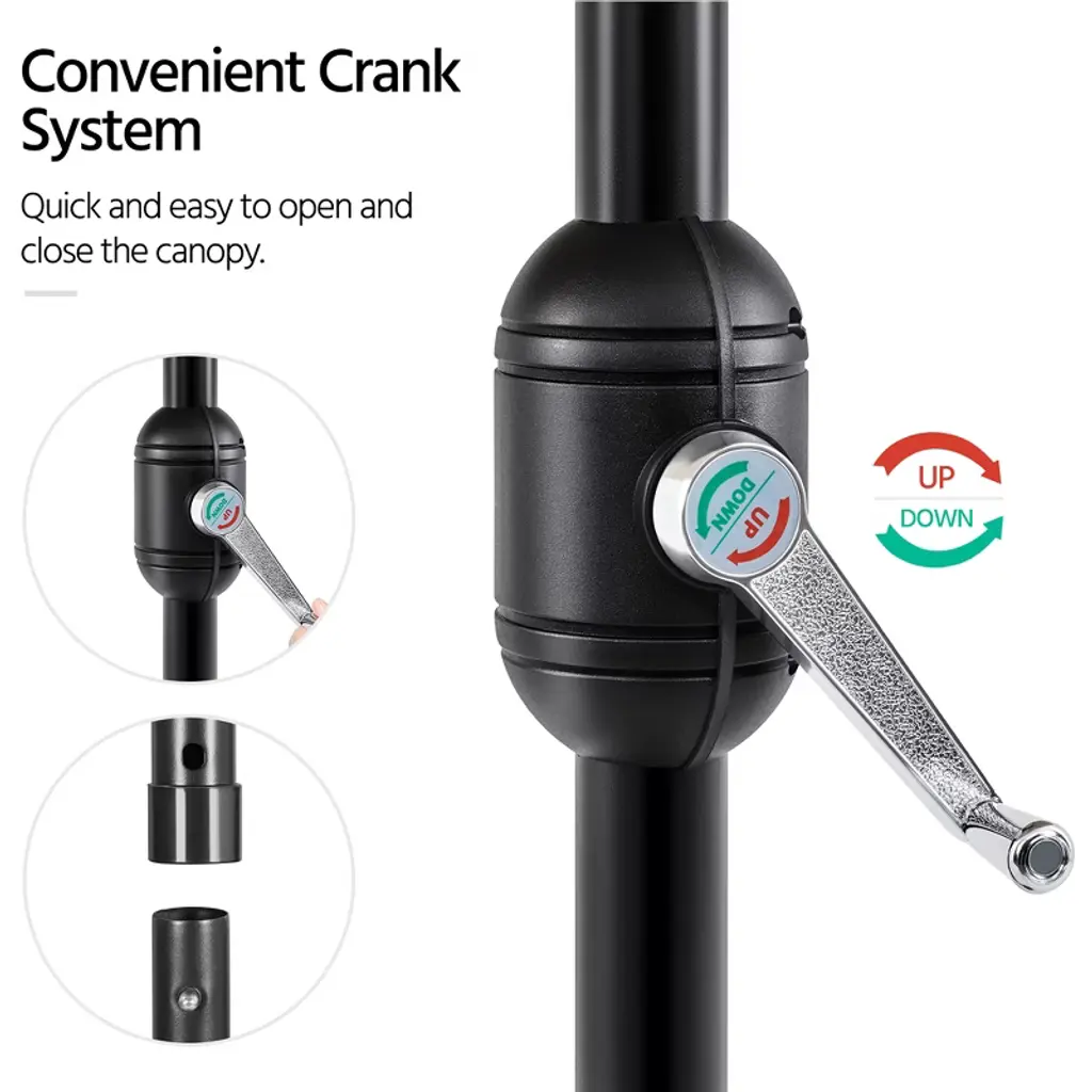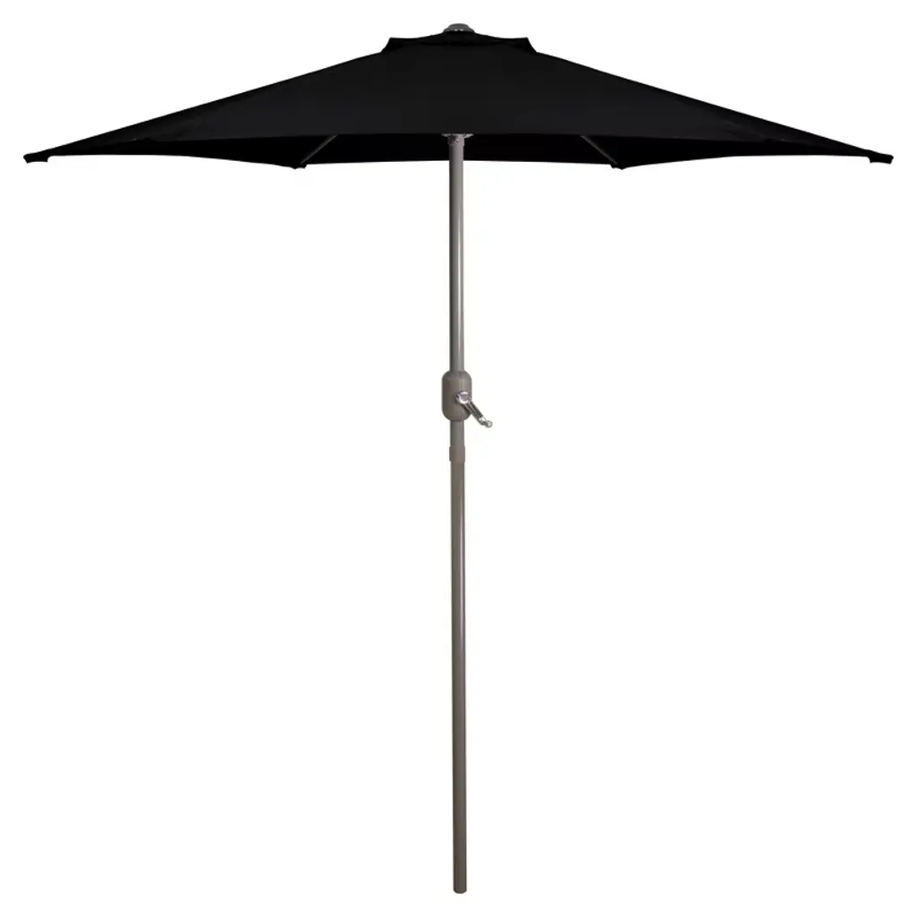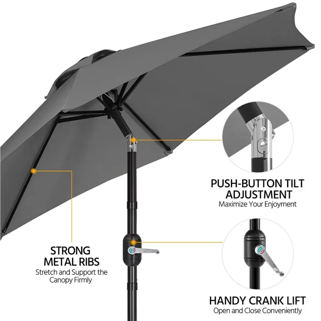 The garden umbrella is made of water-resistant 180g polyester and supported by 6 strong metal ribs. The durable canopy is mounted on an anti-rust powder-coated metal pole. It can be effortlessly operated with a hand-crank and easily tilted in 2 directions with a push at a button to ensure consistent shade. This basic outdoor umbrella is a functional addition to the patio, garden, deck, poolside, café and restaurant. Easy setup is required for this outdoor umbrella. Specifications: Canopy color: Tan, Red, Gray, Navy BlueMaterial: 160g Polyester, Powder-coated IronUmbrella Rib Qty.: 6Fully Open Dimension: 7.5ft L × 7.5ft W × 8ft H Please see the image for exact measurements.Please note that the umbrella stand/base is not included in this item.Please allow ± 1.2in measurement tolerance.