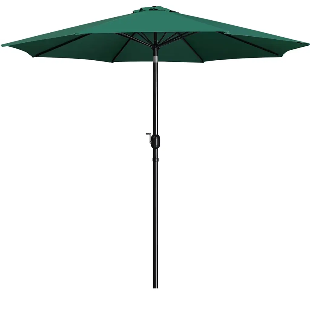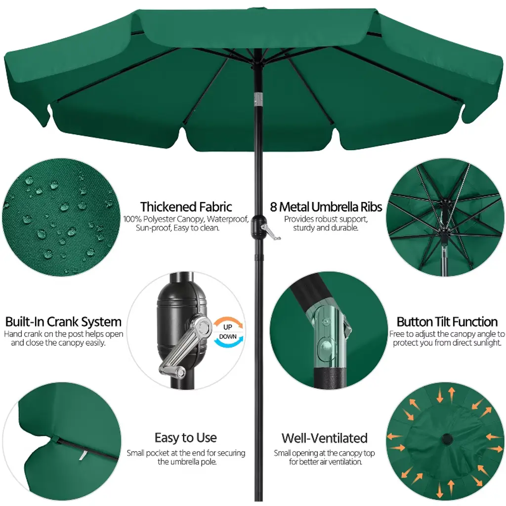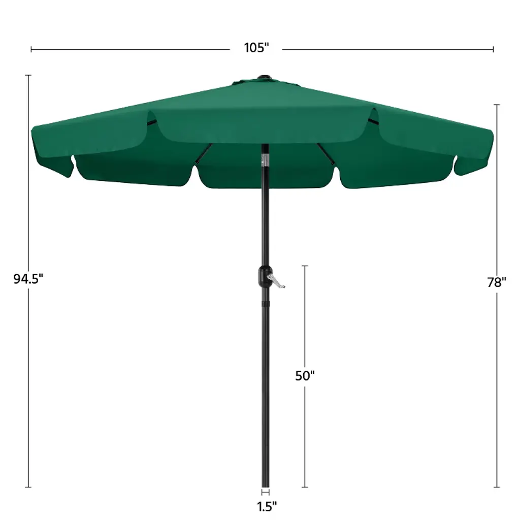 The 9ft canopy offers a cool shade for a 42" to 54" table, covering 4 to 6 chairs or 2 pool loungers. The crank on the pole allows you to open or close the canopy independently. The push button allows the canopy to tilt according to the different angles of the sunshine in the day. Compared with our classic minimal design, this upgraded vacation style umbrella comes with a sagging surrounding rim on the edge of this canopy, adding a touch of the beauty of ease and a relaxed atmosphere to the umbrella, making it extra fitted for the romantic garden, eyeful beach, or deck, poolside, cafe and restaurant. * Specifications: Canopy color: Tan, Sky Blue, Dark GreenMaterial: 180g Polyester, powder-coated ironUmbrella rib qty.: 8Canopy diameter: 9ftOverall height: 7.9ftUmbrella pole diameter: 1.5" Please see the image for exact measurements.Please note that the umbrella stand/base is not included in this item.Please allow ±1/2" measurement tolerance.