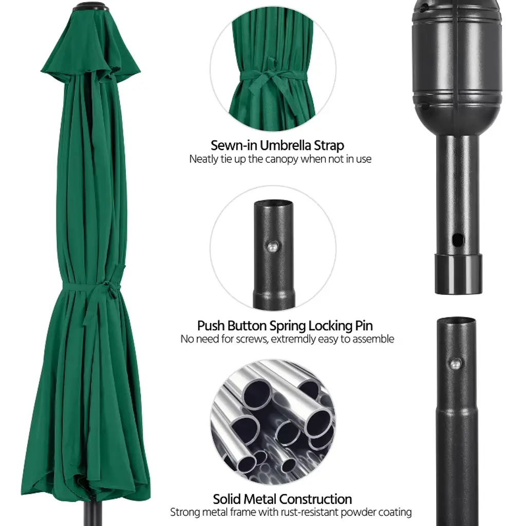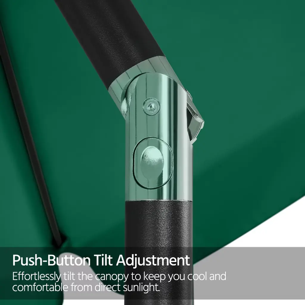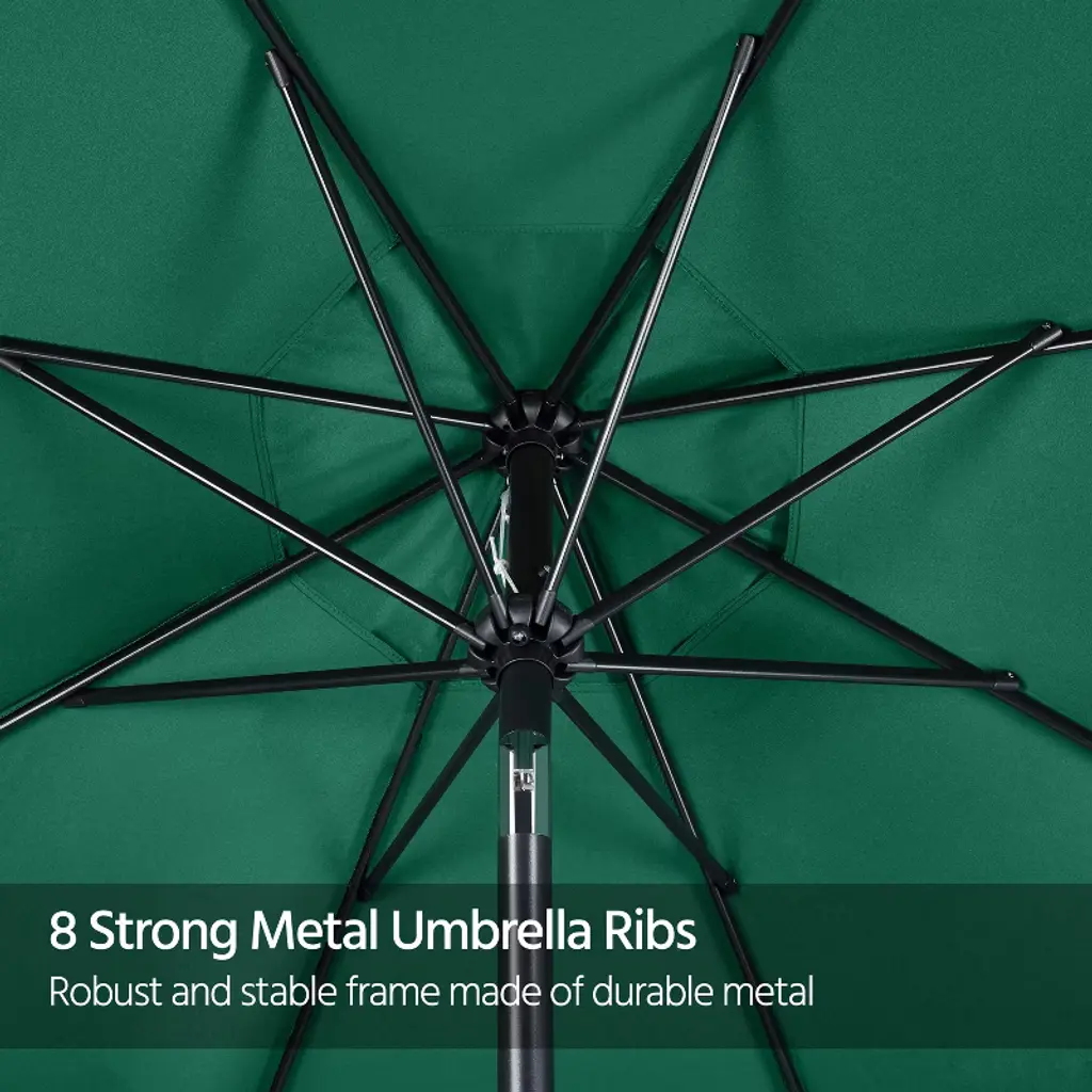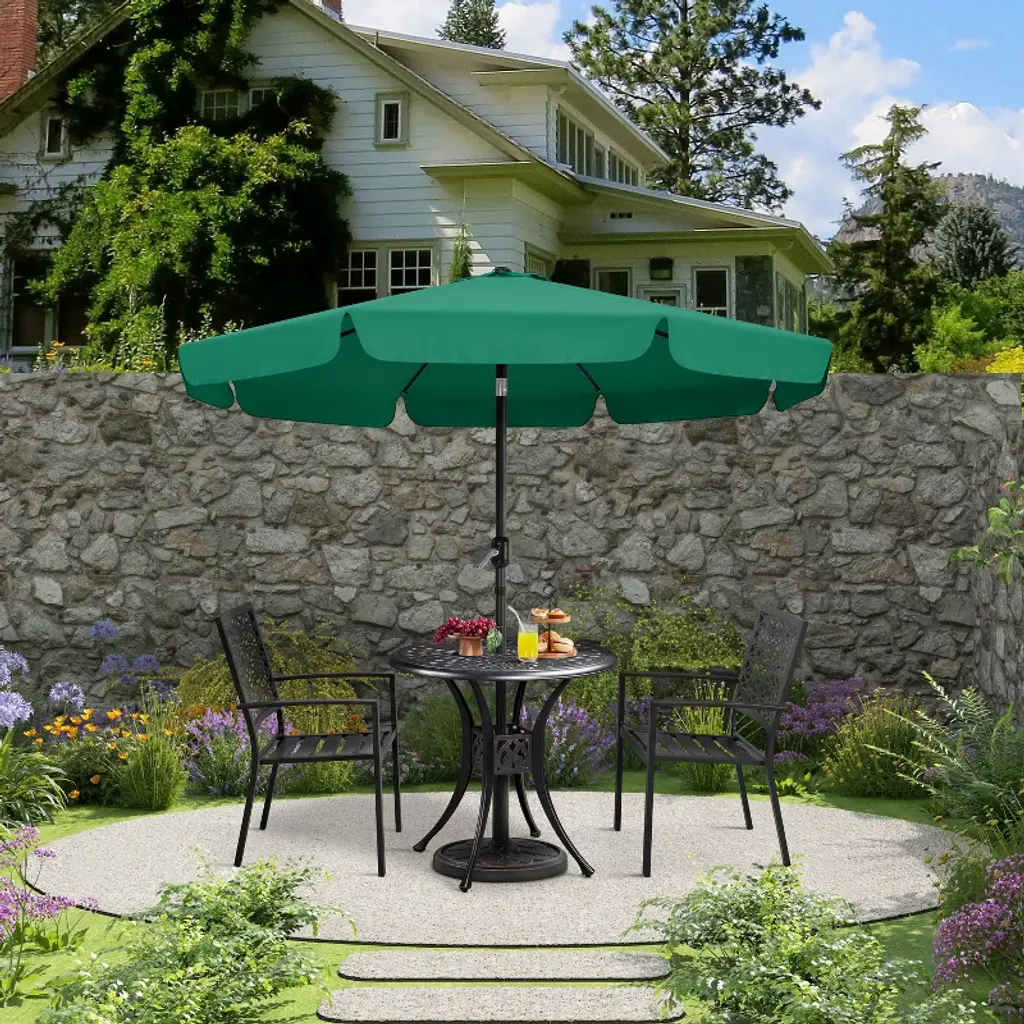 The 9ft canopy offers a cool shade for a 42" to 54" table, covering 4 to 6 chairs or 2 pool loungers. The crank on the pole allows you to open or close the canopy independently. The push button allows the canopy to tilt according to the different angles of the sunshine in the day. Compared with our classic minimal design, this upgraded vacation style umbrella comes with a sagging surrounding rim on the edge of this canopy, adding a touch of the beauty of ease and a relaxed atmosphere to the umbrella, making it extra fitted for the romantic garden, eyeful beach, or deck, poolside, cafe and restaurant. * Specifications: Canopy color: Tan, Sky Blue, Dark GreenMaterial: 180g Polyester, powder-coated ironUmbrella rib qty.: 8Canopy diameter: 9ftOverall height: 7.9ftUmbrella pole diameter: 1.5" Please see the image for exact measurements.Please note that the umbrella stand/base is not included in this item.Please allow ±1/2" measurement tolerance.