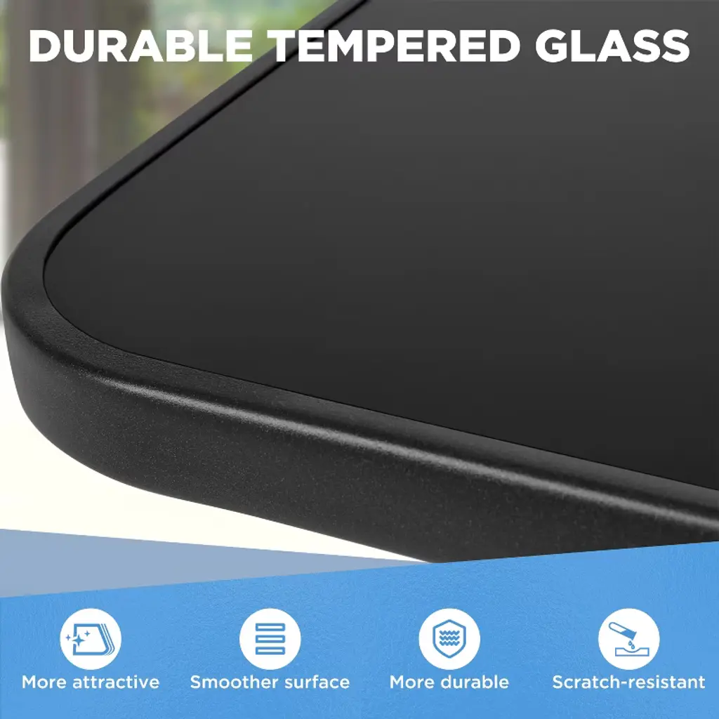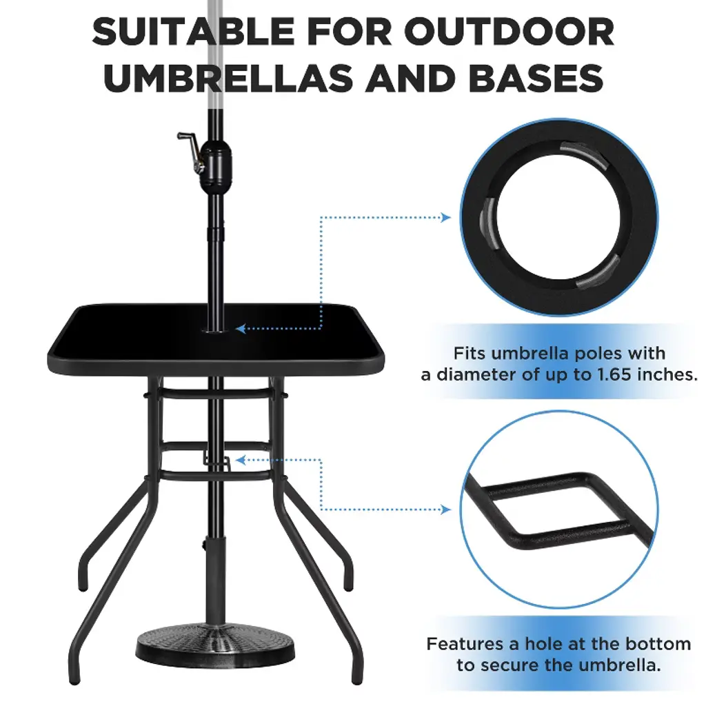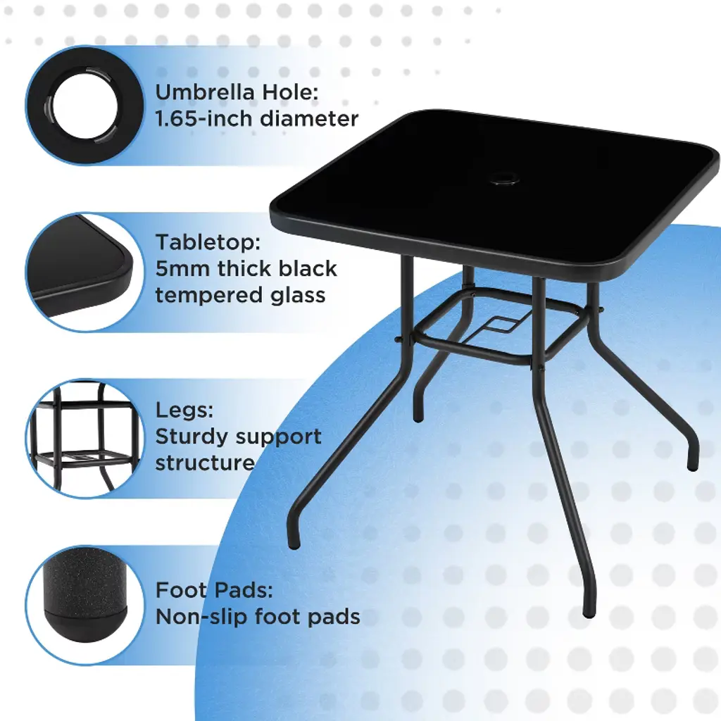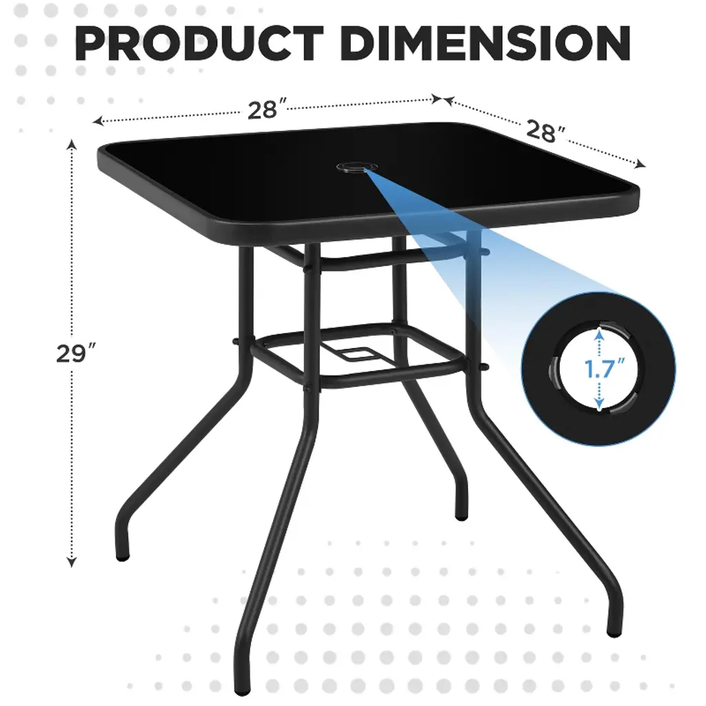 This square patio bistro table combines sleek black silk-printed tempered glass with a matte metal frame for a simple yet elegant look. Designed for two to four people, it’s ideal for afternoon tea, snacks, or casual brunches. The table features rounded edges and a central umbrella hole for easy shade. With strong materials and a three-layered structure for stability, it complements any outdoor space and requires minimal upkeep. *Specifications: Color: Black Material: Iron, Silk-printing Tempered GlassAssembled Dimension: 28" L x 28" W × 29" HUmbrella Hole: 1.7in Dia.Thickness of glass: 0.2" Max. loading capacity: 99 lb Please see the image for exact measurement. Please allow 0.4in measurement tolerance.Please do not stand on the table for your safety.