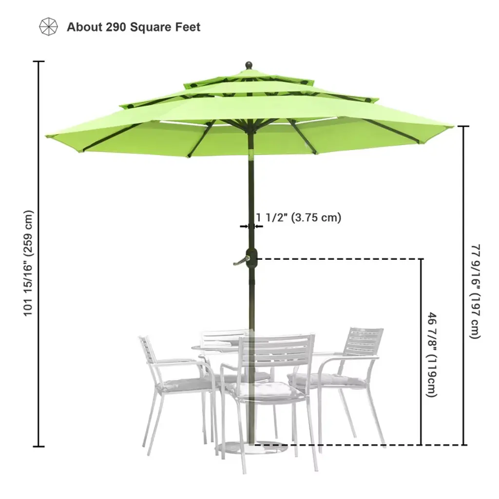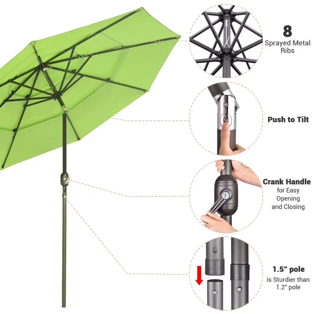 Features:- Great Ventilation &; Stylish Appearance - 10 ft 3 Tier Patio Umbrella, 3 layers for great ventilation, keeps air flowing to offer better stability; Unique layered umbrella shows leisure style, to enjoy your 3rd space leisure time with outdoor view on every sunny day - UV &; Fade Resistant Canopy - 220g yarn-dyed fabric features UV70+ to effectively block more than 90% of UV light, offers protection up to 2 years; Color fastness is up to US standard level 4 for keeping original beauty for a long time; PU coating for water resistance, durable for years - Durable &; Stable Construction - Rust-free iron pole and rust-resistant 8 sprayed metal ribs, enhanced wind resistance,resisting corrosion for great durability; - Crank &; Tilt Button for Easy Operation - Crank handle for opening and closing the umbrella easily; Push button on the pole for tilting umbrella to shade you from different angle sunlight- Wide Use - Can cover 38" to 48" round table or square table that is up to 48" long, perfect for offering shade at your patio, garden, backyard and pool, also great for café, market, villa, hotel, resort and so onSpecifications:- Overall Dimension(Dia.xH): 114 3/4" x 97 5/8" (291.5 x 248 cm) - Long Rib Size(LxWxH): 57 7/8" x 11/16" x 1/2" (147 x 1.8 x 1.2 cm) - Short Rib Size(LxWxH): 19 11/16" x 11/16" x 1/2" (50 x 1.8 x 1.2 cm) - Shading Coverage: About 289.5 Square Feet - Bare Umbrella Pole Length After Closing: 40 9/16" (103 cm) - Net Weight: 15.4 Lbs (7 kg)Package Contents:- 1x Umbrella Frame &; Canopy - 1x Pole - 1x Top Finial - 1x Strap - 1x ManualNotice: - This umbrella will perfectly fit our umbrella replacement cover model YES0344 and Our umbrella also applicable to our stand: YES0360,YES0363,YES0364,YES0362,YES0515,YES0516, , any inquiry is welcome.