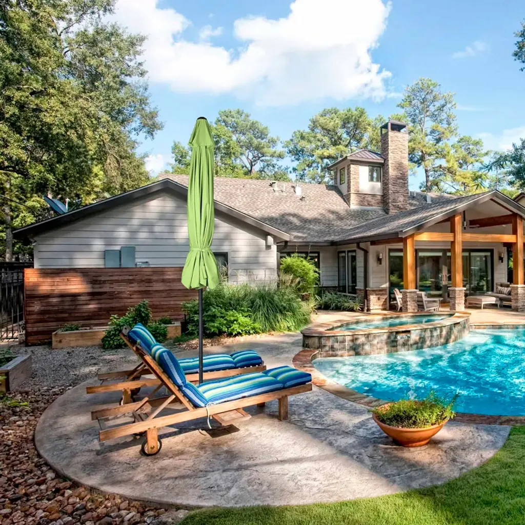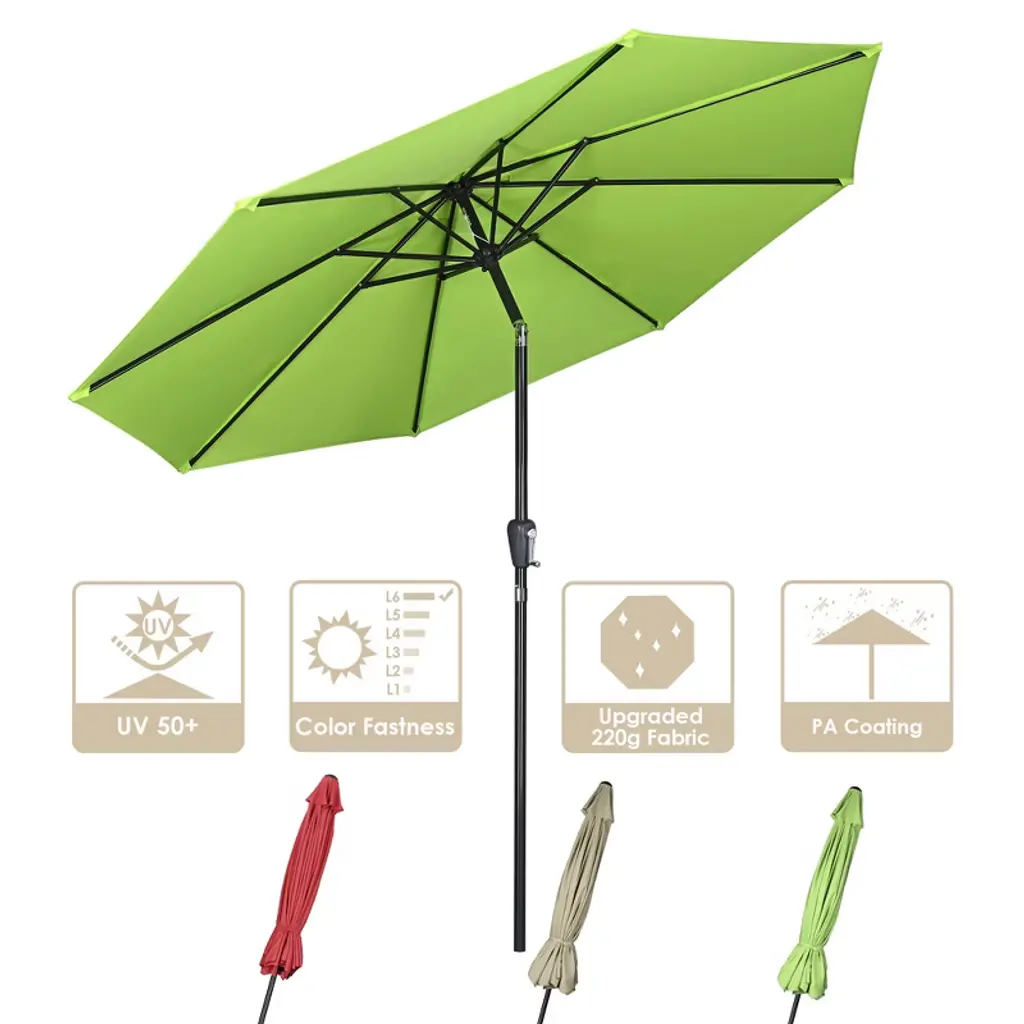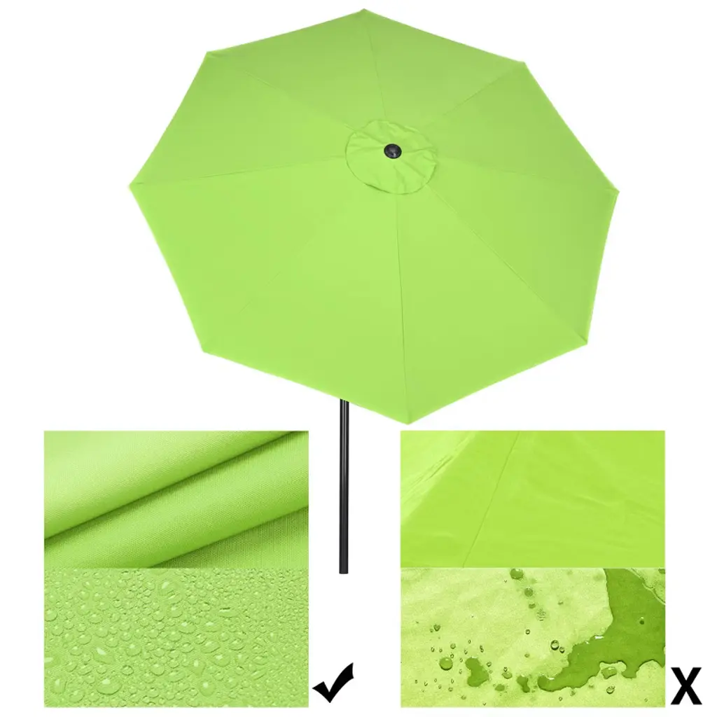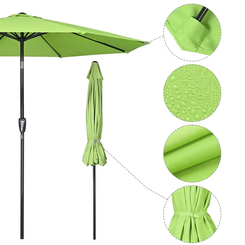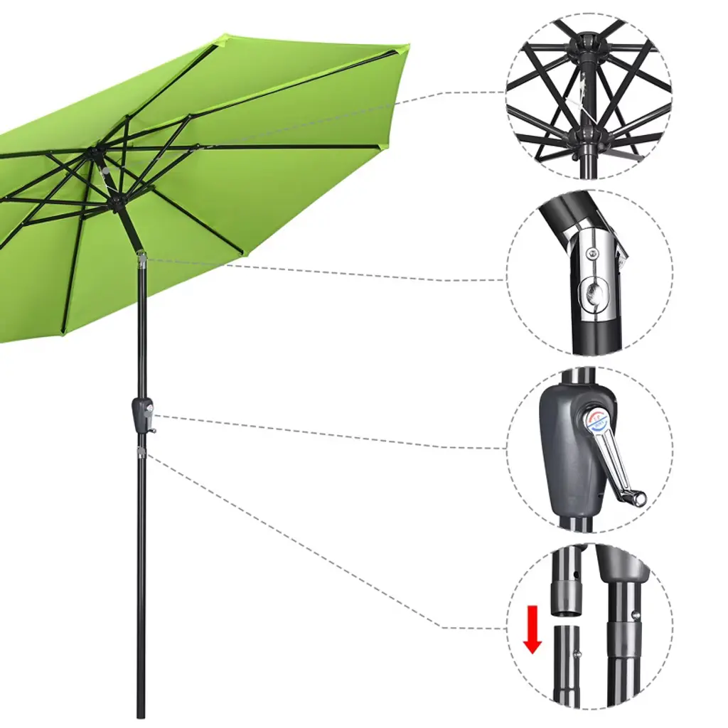 Features:- UV50+ & Fade Resistance - 10 ft Patio Umbrella features UV50+ protection to block 98% UV ray for effectively protecting you from harmful sunlight; Color fastness of European Standard level 6, keeping original color for twice as much time as umbrellas with level 4 under sun exposure- Durable in Use - Canopy made of 220g yarn-dyed fabric which features durability for long lifespan, with PA coating for water resistance to withstand drizzling; Aluminum pole to resist rust; Air vent design to offer great stability in outdoor space- Crank to Open & Push to Tilt - With crank handle, you can effortlessly open or close the umbrella, make operation easy as a breeze; Push button for tilting umbrella to block sunlight from different angles- Space-saving Storage - Detachable pole and binding strap allow you to disconnect the pole for space-saving storage, also easy to take it outside for vacation, ideally shading at deck, yard, balcony, lawn, terrace and so on- Wide Application - Can shade 38" to 48" round table or square table which is up to 48" long; A delightful sunshade with bright color to decorate your place, enjoy your cheerful summertime without worrying blazing sunlight, perfect for patio, garden, pool side, villa, hotel and caféSpecifications:- Overall Dimension(Dia.xH): 116 1/8" x 98 5/8" (295 x 250.5 cm)- Long Rib Dimension(LxWxH): 56 11/16" x 11/16" x 1/2" (144 x 1.78 x 1.22 cm)- Short Rib Dimension(LxWxH): 18 1/8" x 11/16" x 1/2" (46 x 1.78 x 1.27 cm)- Bare Umbrella Pole Length After Closing: 41 5/16" (105 cm)- Pole Diameter: 1 1/2" (38 mm)- Rib Quantity: 8 - Net Weight: 11.7 Lbs (5.3 kg)Package Contents:- 1x Umbrella Canopy & Frame- 1x Top Finial- 1x Pole- 1x Strap- 1x ManualNotice: - Please close the umbrella for protection in extreme weather.- Our umbrella also applicable to our stand: YES0360,YES0363,YES0364,YES0515,YES0516,YES0362, any inquiry is welcome