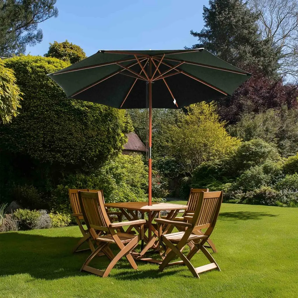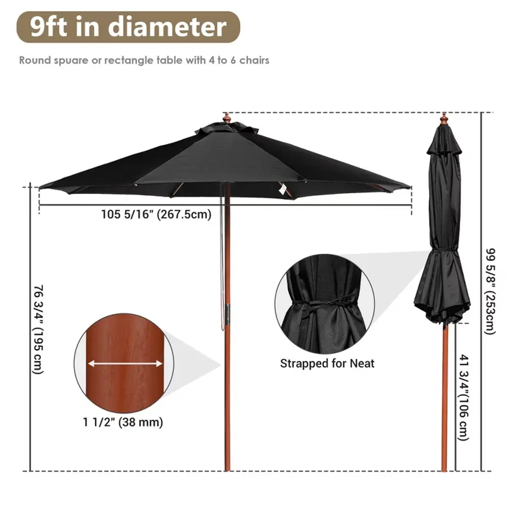 Features:- Stylish Wooden Umbrella - 9 ft Wooden Patio Umbrella features wooden ribs & pole to show the beauty of nature, brightening the place with country style, enjoy the leisure time under the umbrella, feels like in a vacation- UV Protection & Fade Resistance - UV30+ Protection, effectively protect you from being harmful sunlight; Color fastness of European Standard level 4 for keeping original color under sun exposure- Durable in Use - Canopy made of water repellent 100% PFAS-free polyester fabric which features durability for long lifespan; Air vent design for airflow to offer great stability in outdoor space- Easy to Operate & Store - With the rope pulley mechanism, you can effortlessly open or close the umbrella by pulling the rope; Detachable pole with strap allow you to disconnect the pole for space-saving storage- Wide Application - 9ft umbrella can shade 38" to 48" round table or square table which is up to 48" long; for patio, garden, pool side, villa, hotel and cafeSpecifications:- Overall Dimension(Dia.xH): 105 5/16" x 99 5/8" (267.5 x 253 cm)- Bare Umbrella Pole Length After Closing: 41 3/4"(106 cm)- Pole Diameter: 1 1/2"(38 mm)- Material: Wooden Frame, 180g Polyester Cover- Net Weight: 12.5 Lbs (5.65 kg)Package Contents:- 1x Umbrella Frame & Canopy- 1x Top Finial- 1x Pole- 1x ManualNotice: - Please close the umbrella for protection in extreme weather.- This umbrella will fit our 9 FT umbrella replacement cover model YES0337. Our umbrella also applicable to our stand: YES0363,YES0360,YES0364,YES0362, any inquiry is welcome.