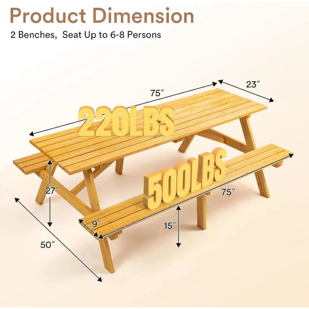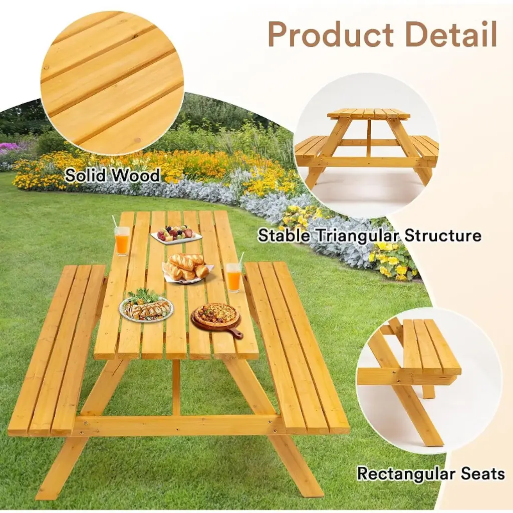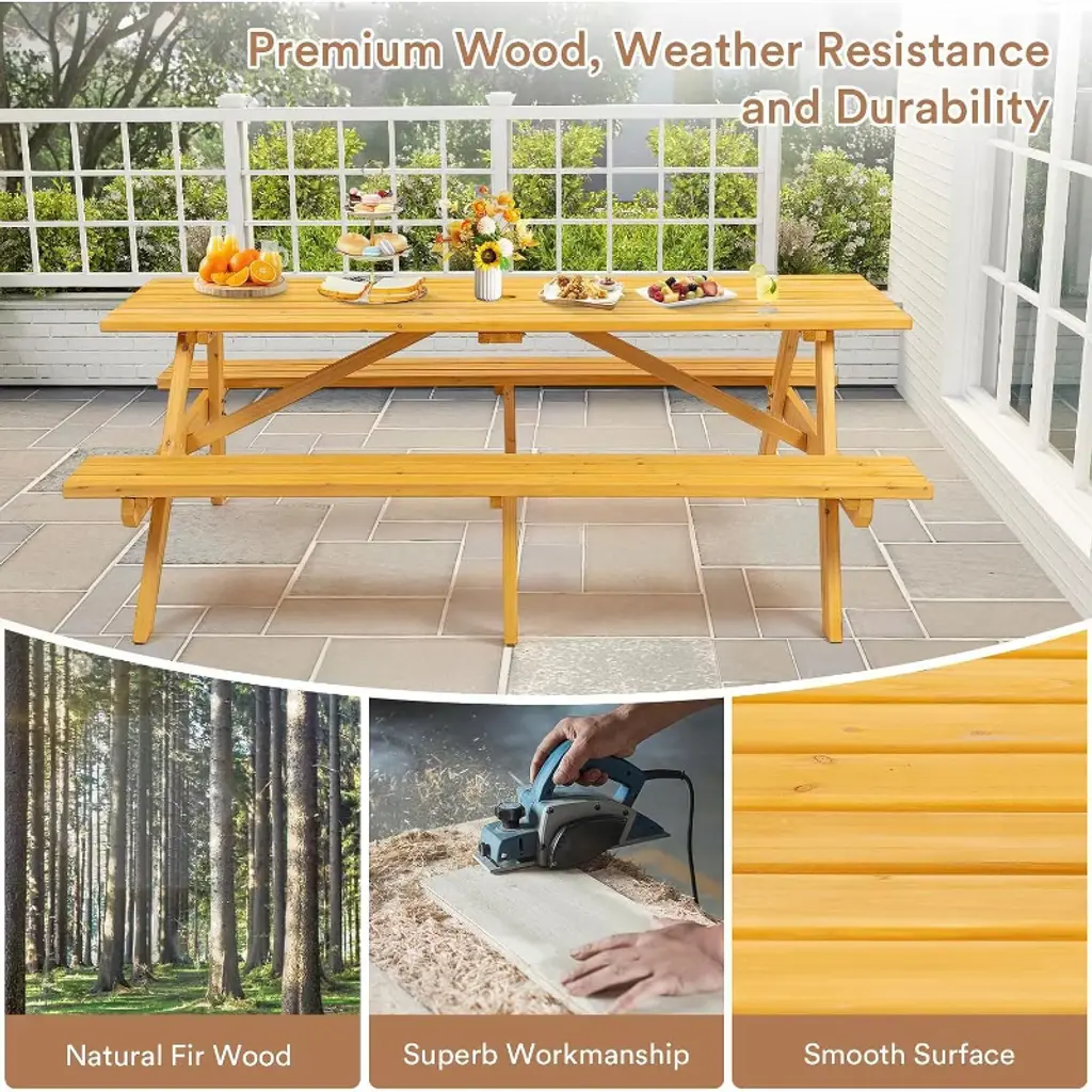 Crafted from solid fir wood, this rustic picnic table comfortably seats 8 people on two built-in benches with a total weight capacity of 2220lbs. It features a convenient umbrella hole for shade and is designed for easy assembly, making it perfect for outdoor gatherings in gardens, patios, or poolside areas.