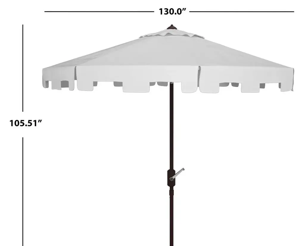 A classic market umbrella gets a chic makeover in tone on tone shades of white with a stylish valance for extra sun protection and European flair. Its round eleven foot polyester canopy and brown aluminum post make it ideal for the veranda or pool deck. Includes easy crank and tilt mechanism. Open Dimensions: 130" x 105.51" Closed Dimensions: 6.1" x 105.51" Care Instructions: Store outdoor furniture indoors or cover well when not in use. Remove wooden furniture from standing water. Dust regularly with small brush or vacuum. Spills should be taken care of immediately before they harden or stain with a slightly dampened sponge. Do not use bleach solutions.