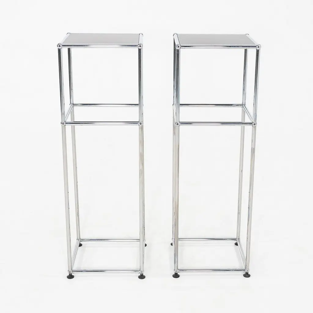 These are USM Haller Pedestals that were produced by USM in the 2010s. USM's modular furniture system was originally designed by Fritz Haller and Paul Schaerer in 1963. The pedestals are comprised of black powder coated steel panels and a chromed steel frame. The listed price includes one pedestal and there are six available to purchase. Each pedestal measures 14 inches deep, 14 inches wide, and 46 inches high. Overall, these pieces are in very good condition. Please see photos.