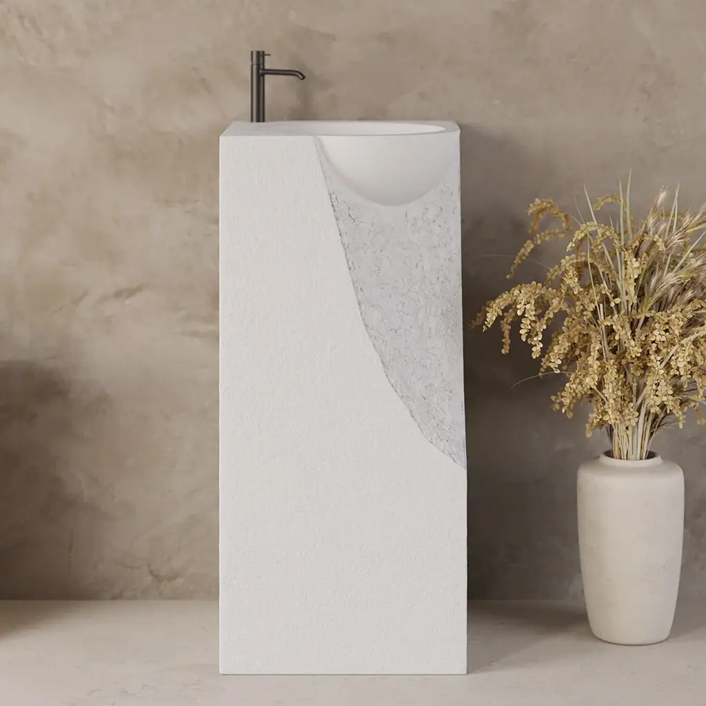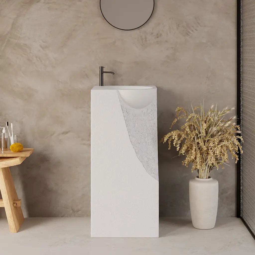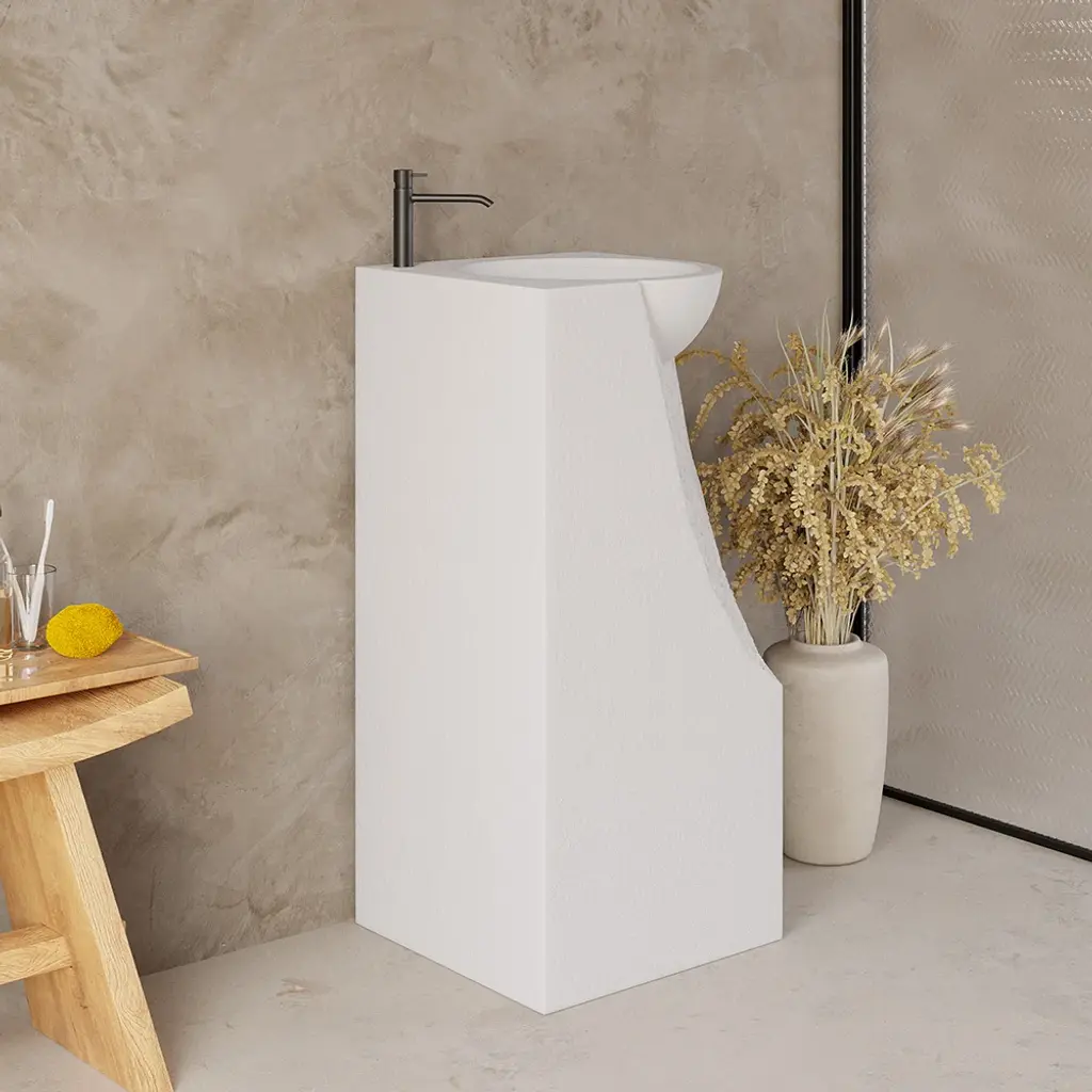 This 34" tall stone resin pedestal bathroom sink represents a Japandi style with a sublime one-piece design to enhance your bathroom with individual flair. Constructed from strong stone resin to bring long-lasting use.