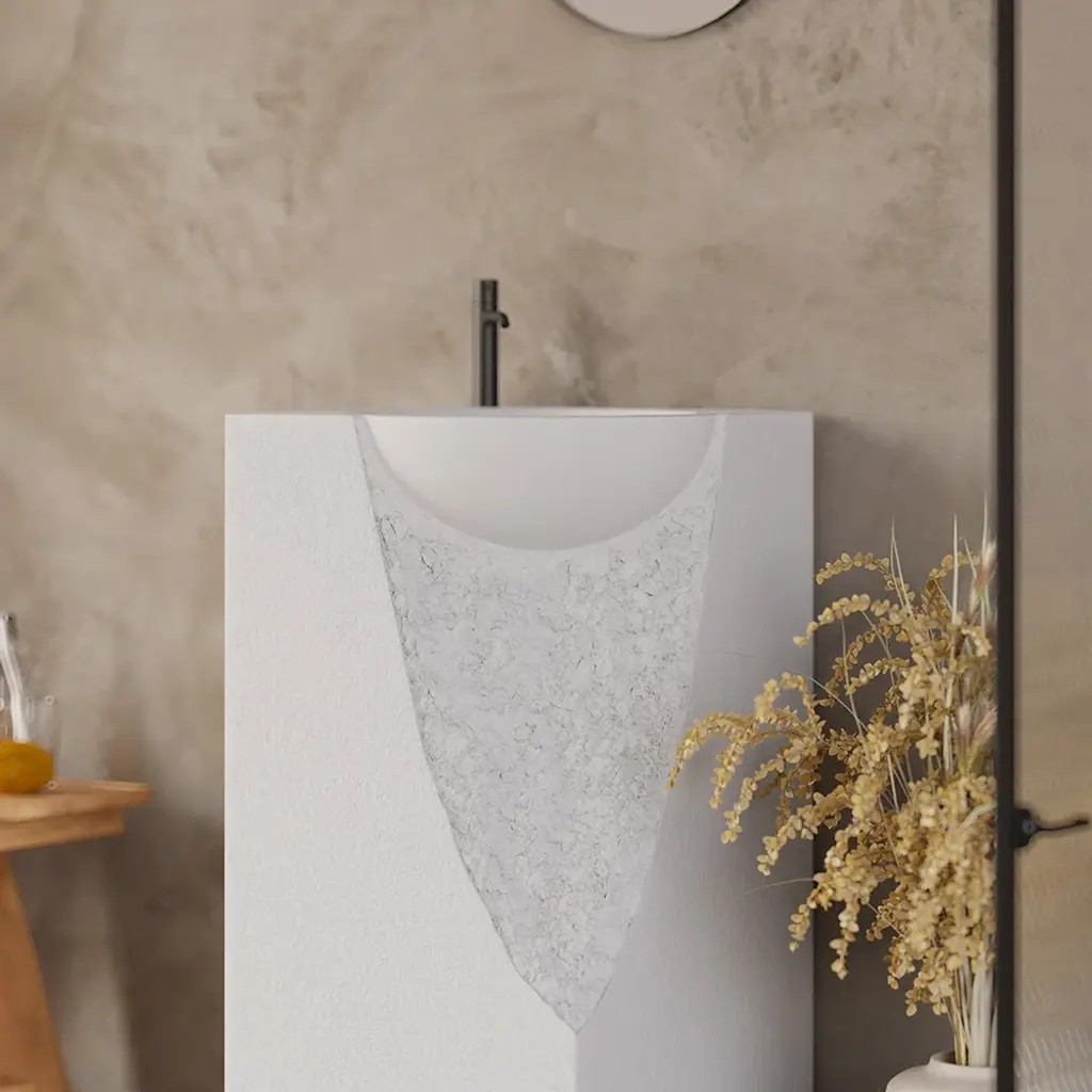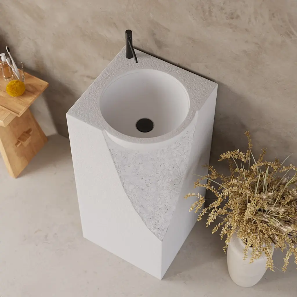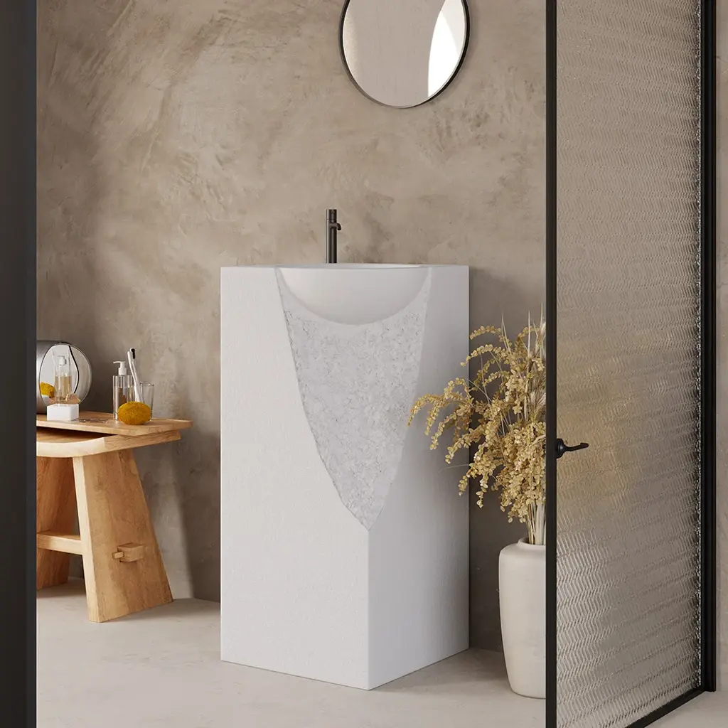 This 34" tall stone resin pedestal bathroom sink represents a Japandi style with a sublime one-piece design to enhance your bathroom with individual flair. Constructed from strong stone resin to bring long-lasting use.