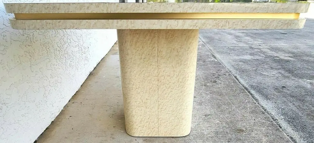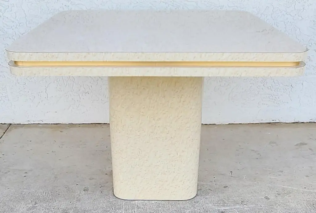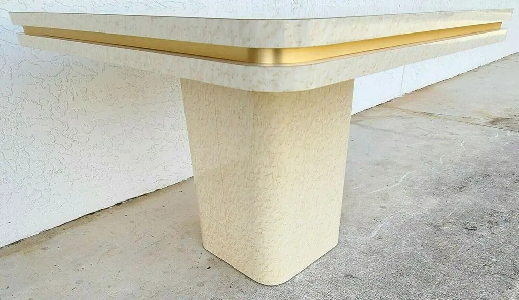 For FULL item description click on More Details below.Shipping Quote InformationThe shipping quote stated in the listing was from 1st Dibs and they normally set all the costs and handle all the shipping details. However, if you let us know what 1st Dibs is quoting you and give us your zip code, we can sometimes ship it for less and get it to you faster. For a shipping quote, click on "ASK THE SELLER" under the purchase button and provide your zip code.Offering One Of Our Recent Palm Beach Estate Fine Furniture Acquisitions Of A 1960's Mid Century Modern Formica Pedestal Dining Game Table With Recessed Gold Trim around the side rims.We had 2 of these at the time we made the listing. One of them has some minor damage as described below and that one will be the last one shipped.Coloration: Light Green and Light Brown highlights.Approximate Measurements in Inches30" high 39" wide 39" deep26.75" chair arm clearance ConditionIn structurally sound and sturdy condition with no notable damage to 1 table. The other table has 2 small imperfections at the very bottom of the base which is visible upon close inspection and shown in pics 7 & 8 and this will be the last table sold/shipped. The photos are an important part of the item description and condition so please use the zoom feature to view them closely.We have many other similarly styled furniture pieces listed. To see them, scroll down and click on VIEW ALL FROM SELLER, where you can see them and follow us to be notified whenever we post new items.We appreciate your business and will do everything possible to make sure you are a happy customer. Local pickup and delivery are available for all our items.