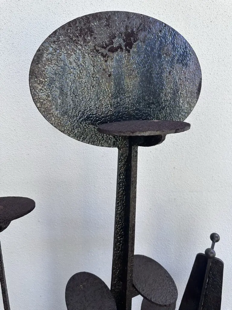 This abstract iron sculpture is a striking piece of art that showcases a unique blend of brutalist and mid-century postmodern style. Standing at 5 feet tall, this large statue is designed to catch the eye with its bold shapes and sleek material. Can be displayed as is or used as a pedestal for more art. The abstract subject matter adds an extra layer of interest and contemplation to the viewer, making it a standout display piece for any art lover or collector. Made from durable very heavy iron, this sculpture is sure to be a stylish and conversation-starting addition to any space. Metal shows character with oxidation and wear.