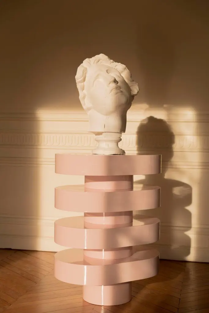 Named for the Greek Goddess of beauty, the Aglaé pedestal by up-and-coming French designer Joris Poggioli is constructed from tiers of lacquered MDF wood.Custom colors available.Available with 2 plates at 16.5 inches high ($2820)Available with 3 plates in gloss lacquer at 23.5 inches high ($3540)All sizes also available in marble or wood.