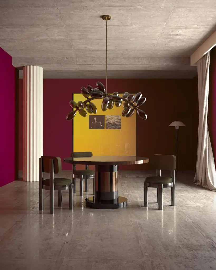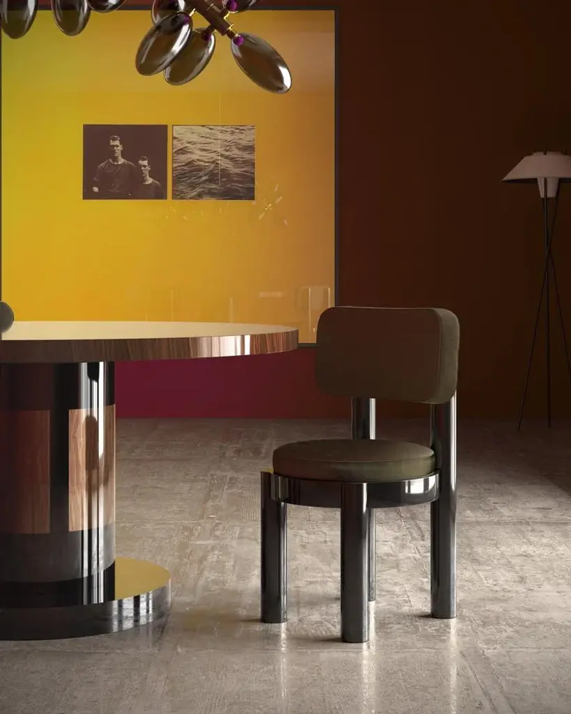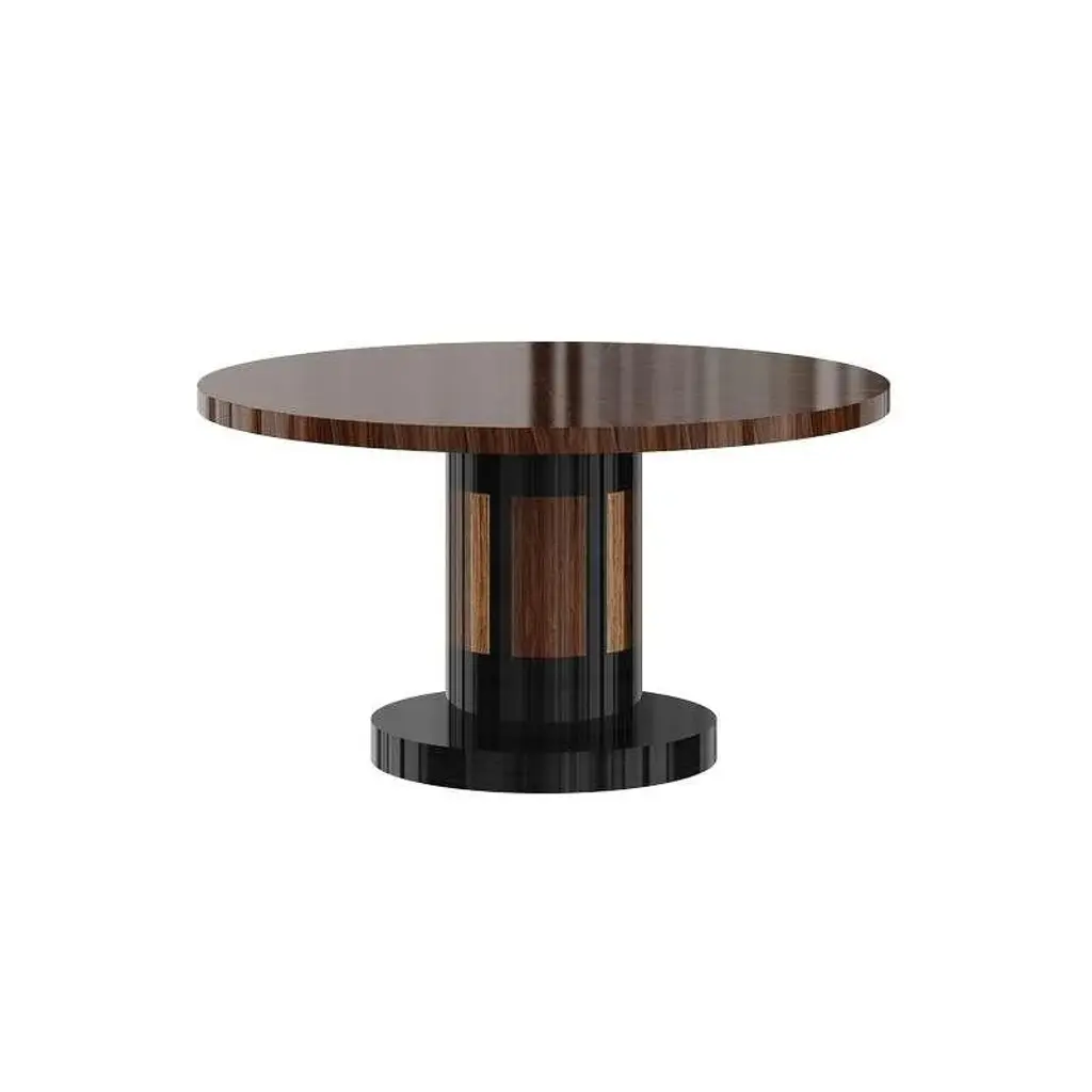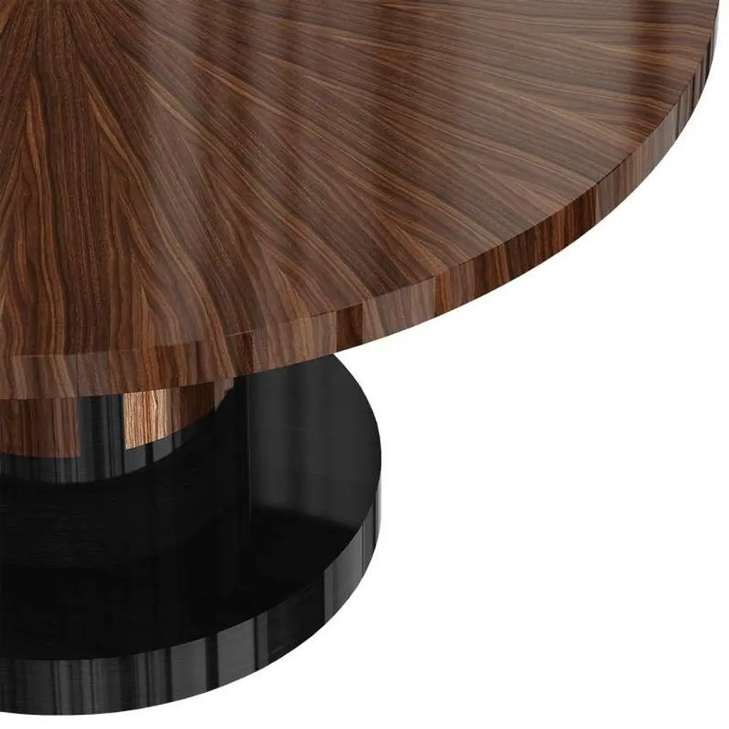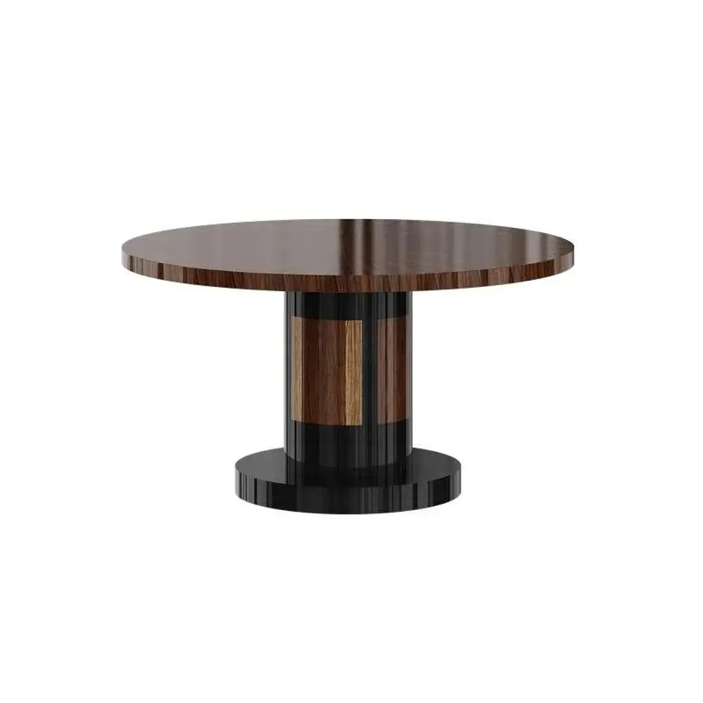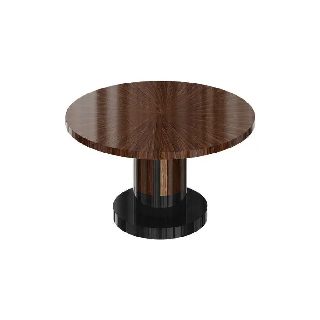 The Almada Dining Table is a stunning round dining table that effortlessly blends Art Deco-inspired elegance with a touch of Mid-Century Modern charm. This contemporary reinterpretation of a timeless design features a finely crafted wooden structure that brings warmth, sophistication, and style to any dining space. Its clean lines, balanced proportions, and impeccable finish make it a standout addition to any luxury dining room. Whether you’re designing a bold, modern aesthetic or a more classic space, the Almada Dining Table adapts seamlessly, becoming the focal point of your space. Dimensions:Width: 140 cm | 55.1 in – Depth: 140 cm | 55.1 in – Height: 75 cm | 29.5 in Materials:Body in Marquetry Gloss Zebrano Wood Veneer; Walnut Wood Veneer; Wengue Black Wood