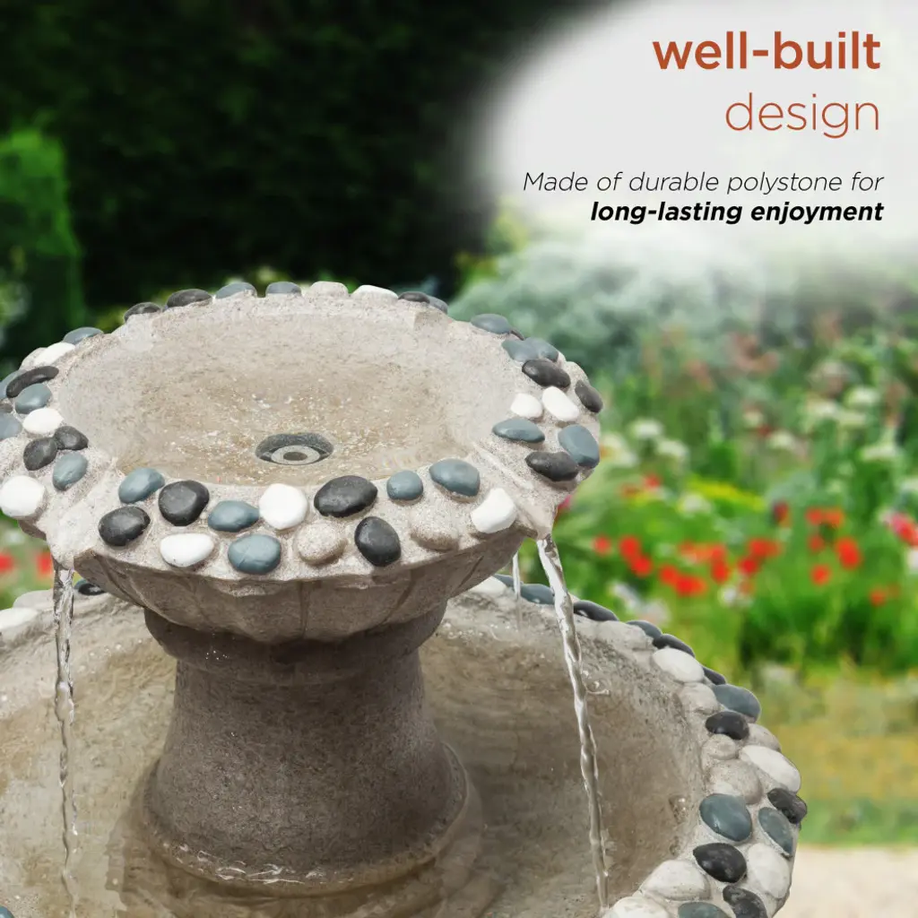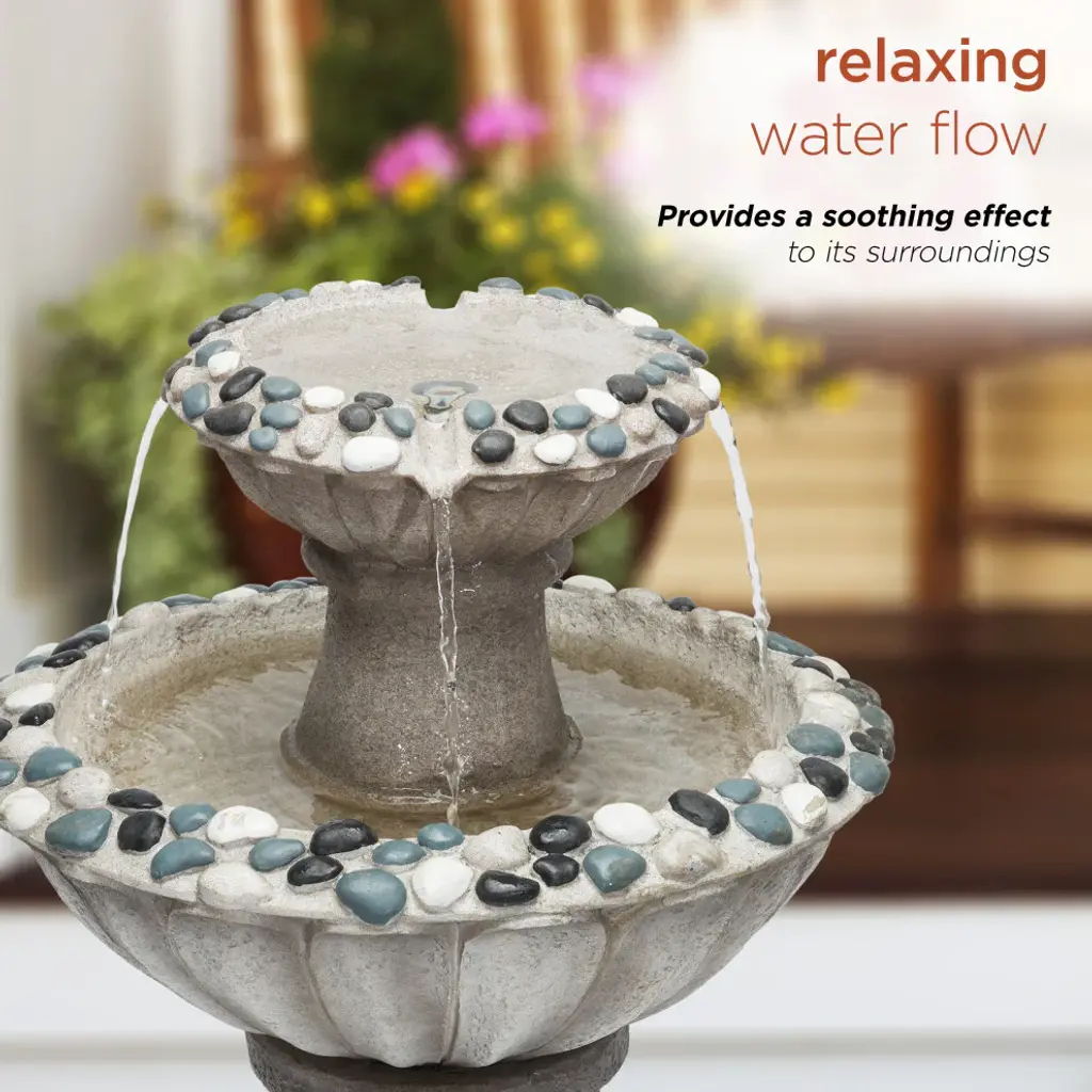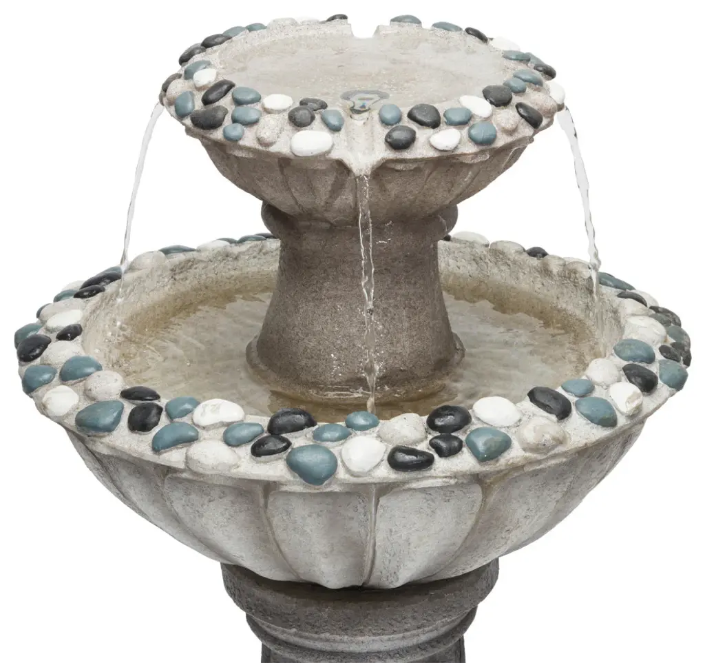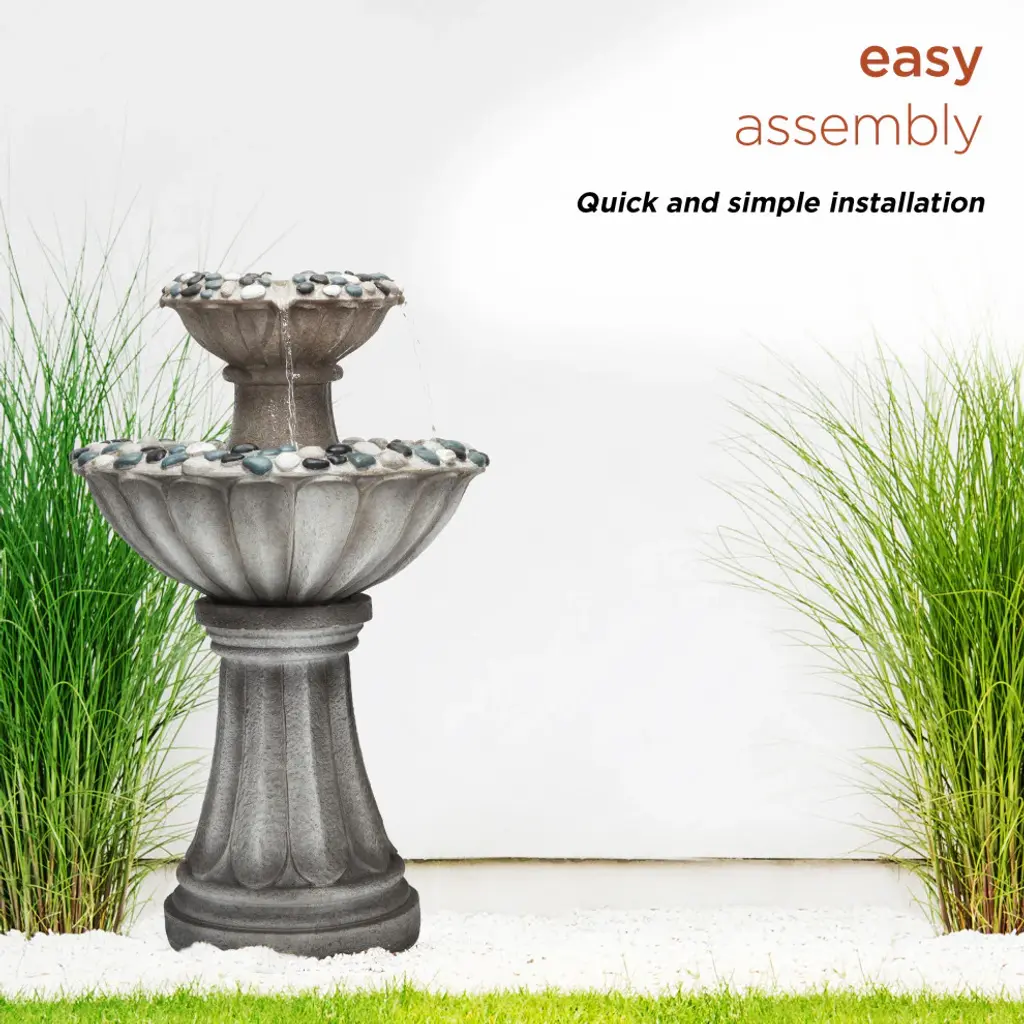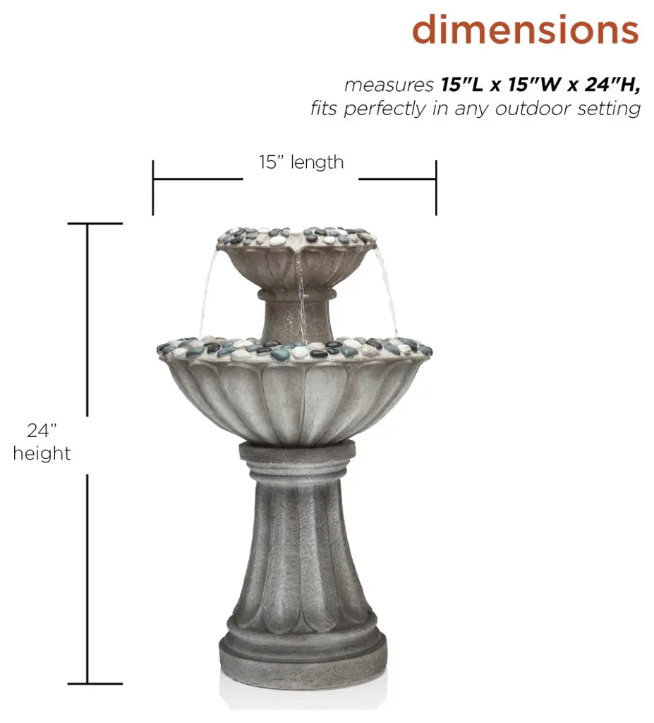 Add classic charm and elegance to your garden, patio or yard with this beautiful traditional water fountain by Alpine. This classic and timeless fountain will be the centerpiece of your formal garden or courtyard as the soothing water sounds surrounds the atmosphere while you sit around with your loved ones. Be the envy of everyone with this classic water fountain by Alpine.15"W x 15"L x 24"H, made of polyresinClassic looking, two tier gray stone finish fountain with a rippled design and textureMade of durable materials that will perfect your home, yard, and garden decorThe design adds a formal classic look, while the relaxing, gentle water falling helps to bring in a natural elementIncludes a 1-year manufacturer''s warranty for worry-free operation
