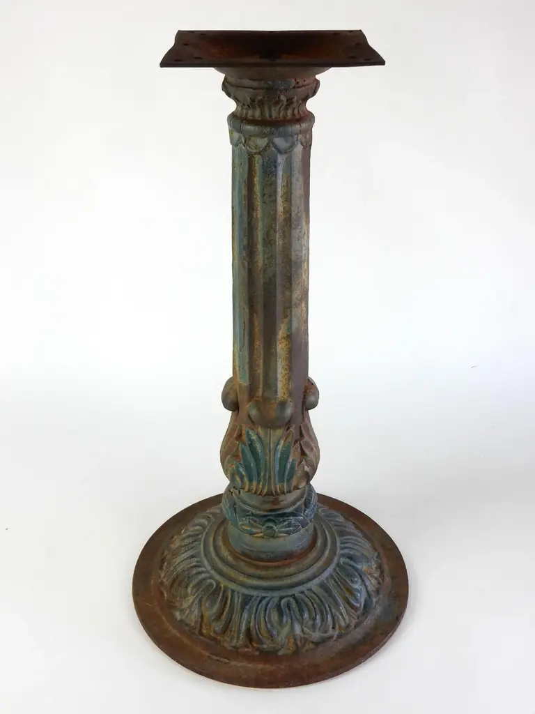 Solid cast iron bistro table base. (6 available at start of listing, priced per item). By Haasbrock-Sonderguard. Once painted a blueish green color but now with a marvelous true aged patina. It's weight allows for a 36" wide or less top. After a close inspection we find no chips, cracks or damage. Shipped via UPS ground.