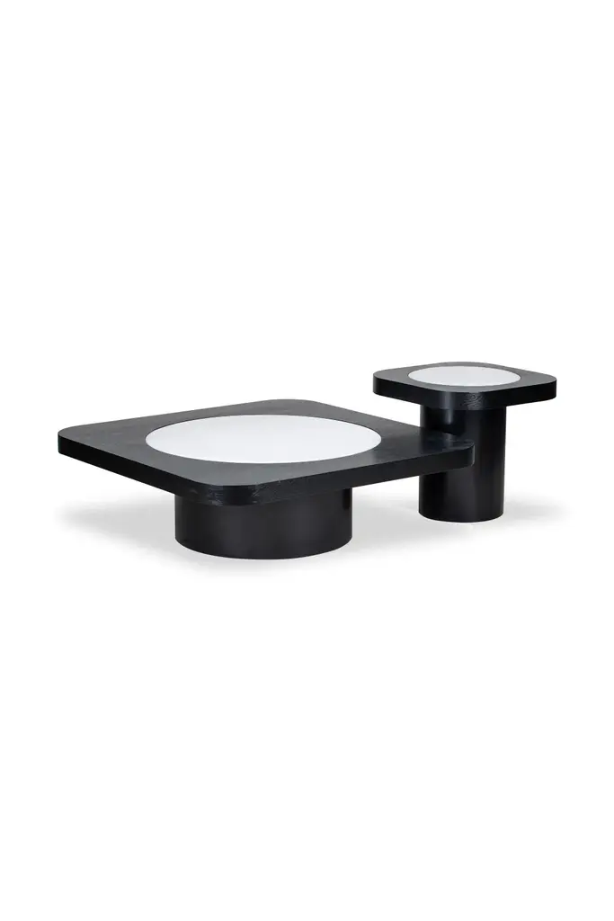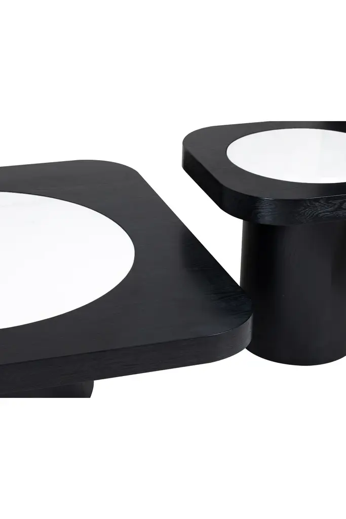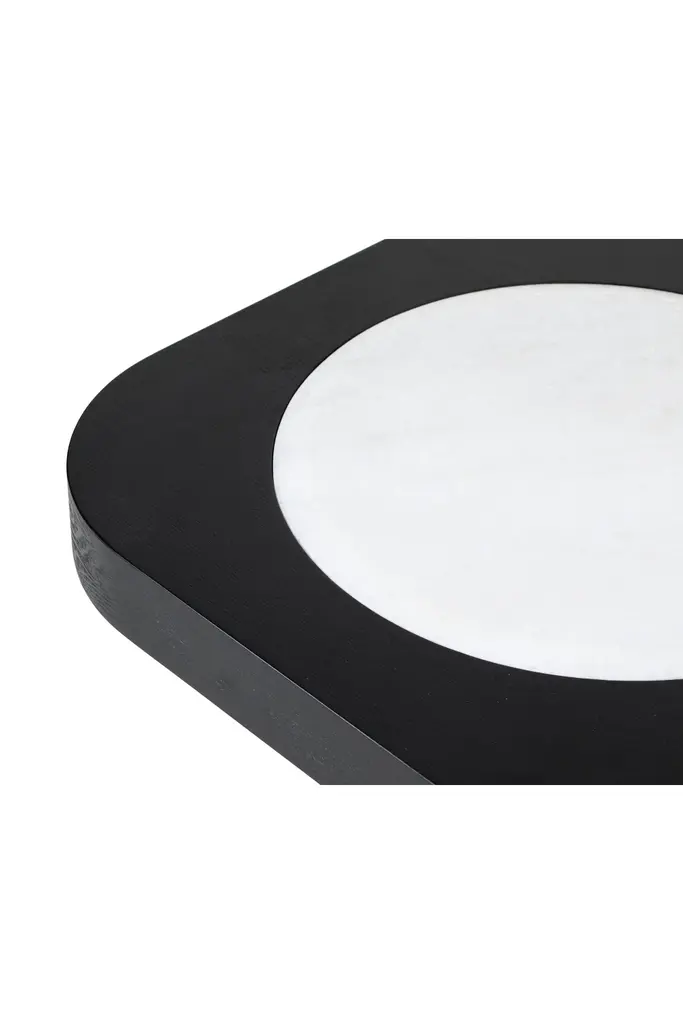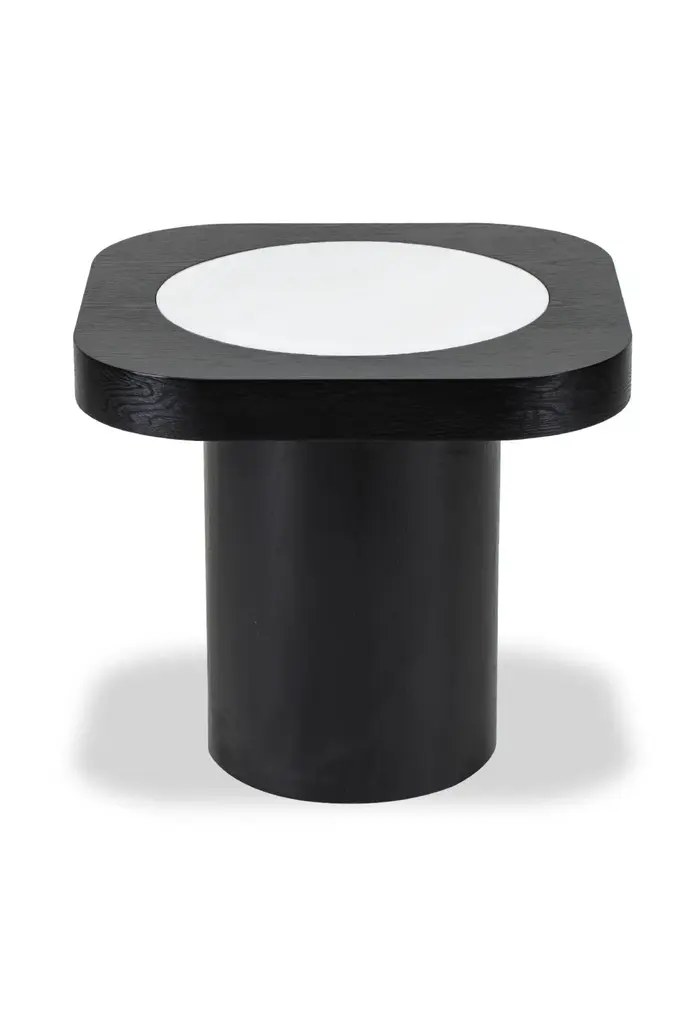 Designed for the sleek modernity, the Mythos Side Table creates an attractive aesthetic. A must-have for the modern living room, this table is a luxurious combination of a circular white marble center with a figured black ash veneer surround. A balance of squares and circles on the top and base of the table is a marvel of contrasts in form and finish. With its matching coffee table, this is an impressive interior statement.
