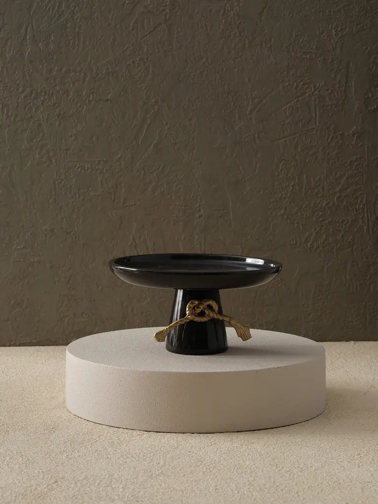 Rustic meets refined in the Black Pedestal Serving Stand With Rope Accent — a unique piece that balances natural charm with sleek sophistication. Crafted from polished black stone, this elevated stand features a smooth, circular top supported by a sturdy conical base. A knotted rope detail wraps around the base, adding a tactile and nautical-inspired touch that softens its bold silhouette.Perfect for serving desserts, cheeses, or appetisers, it also works beautifully as a decorative object on coffee tables or consoles. This stand is ideal for those who appreciate contrast and character in their tableware.