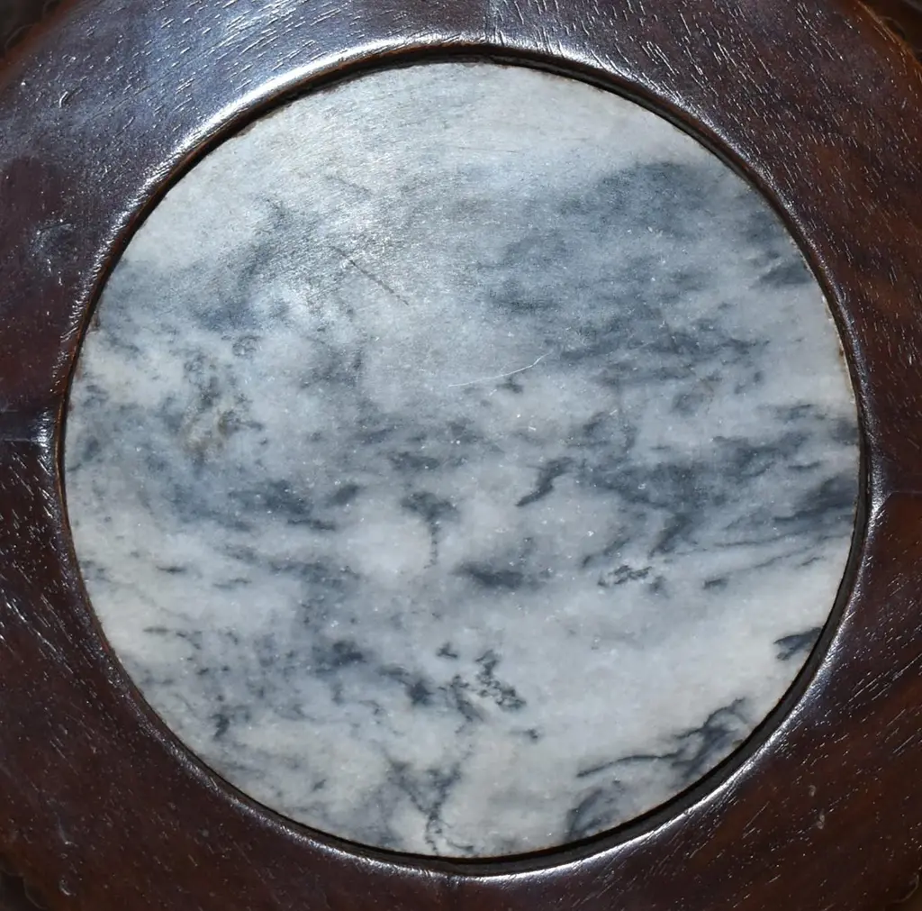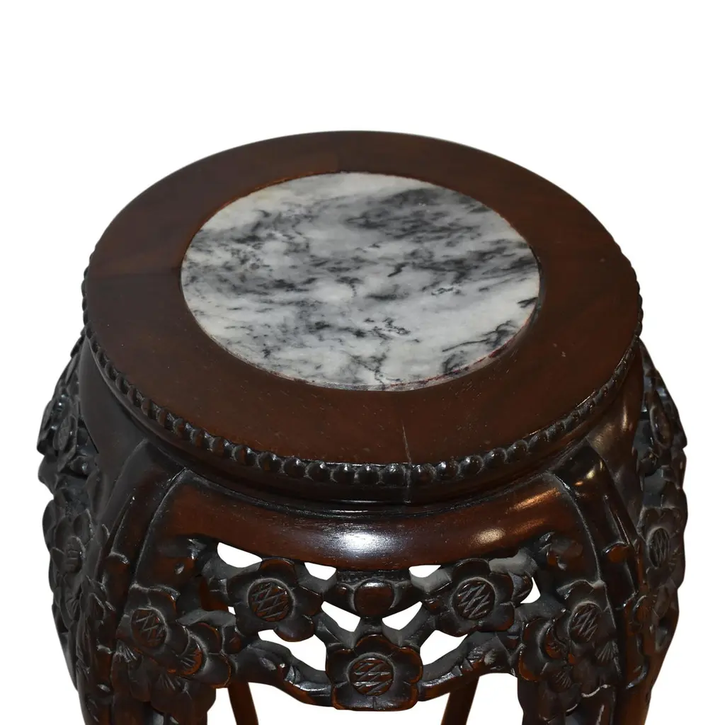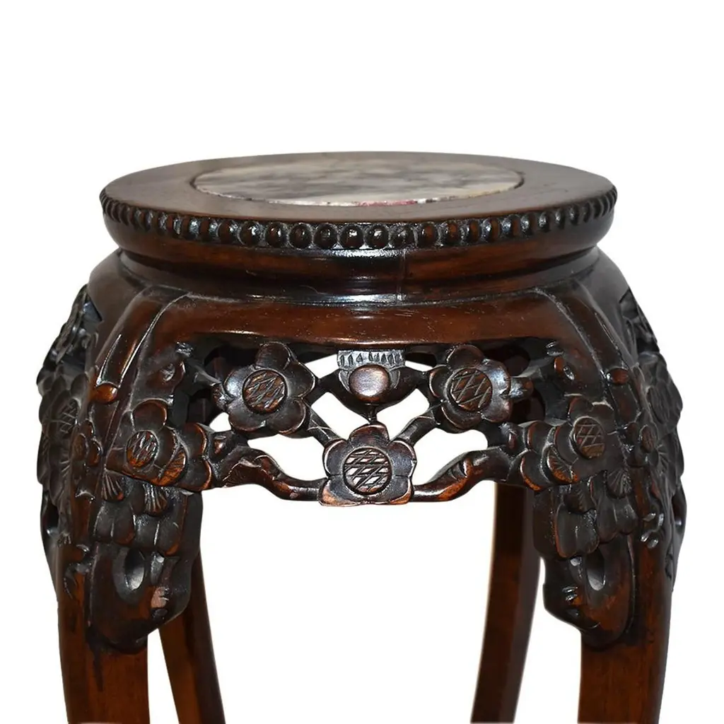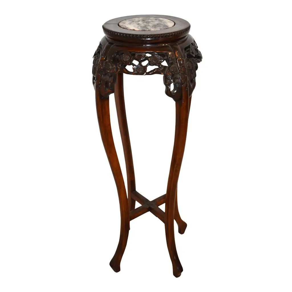 Stunning from every angle, this elegant carved pedestal is crafted from walnut and finished with a rich, dark stain. A 10.5 inch removable, circular piece of marble is inset into the pedestal's top. The pedestal's frame features a beaded edge around the top; an eleborate, pierced carved floral apron; and sleek, long cabriole legs united by stretchers for additional style and stability. The pedestal is three feet tall and makes an ideal plant stand or small side table.