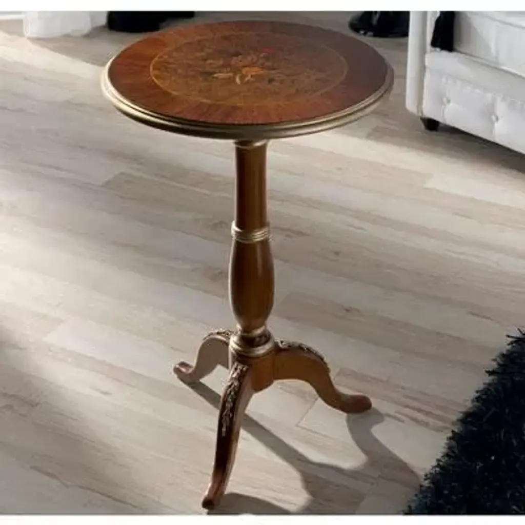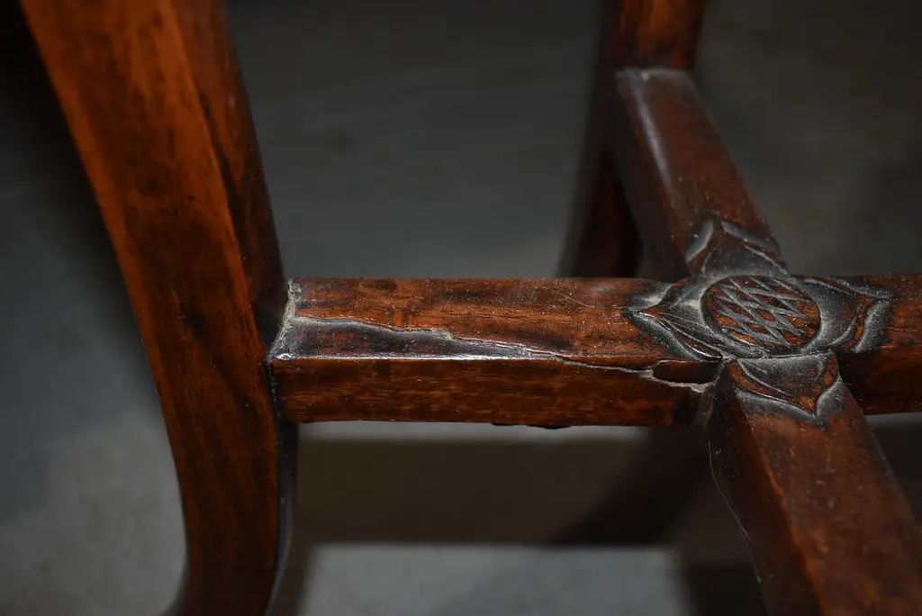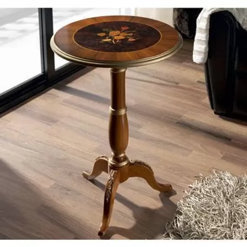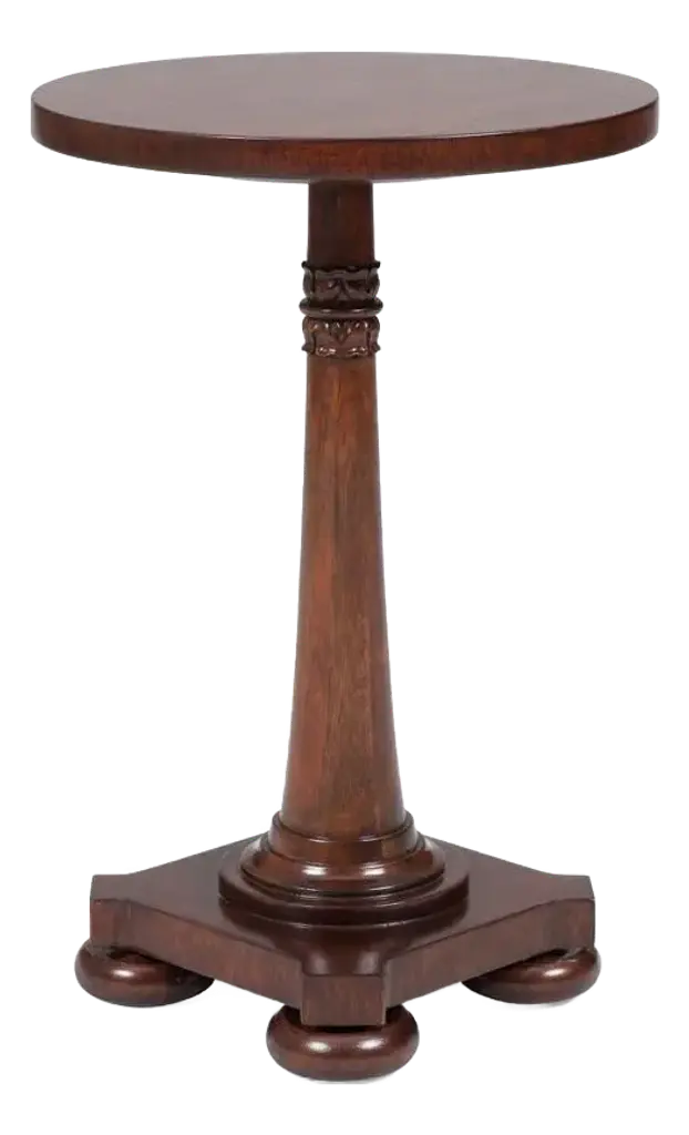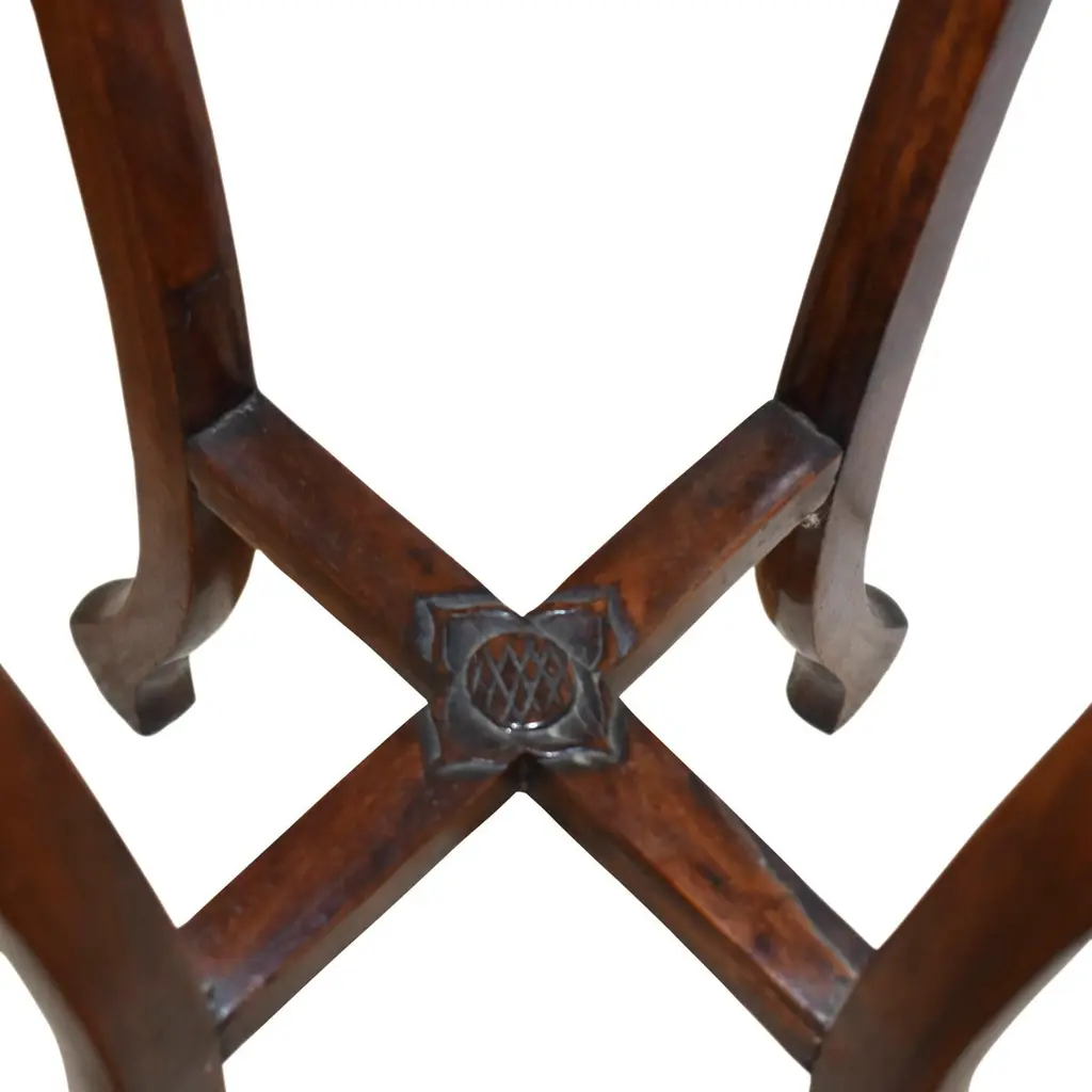 Stunning from every angle, this elegant carved pedestal is crafted from walnut and finished with a rich, dark stain. A 10.5 inch removable, circular piece of marble is inset into the pedestal's top. The pedestal's frame features a beaded edge around the top; an eleborate, pierced carved floral apron; and sleek, long cabriole legs united by stretchers for additional style and stability. The pedestal is three feet tall and makes an ideal plant stand or small side table.