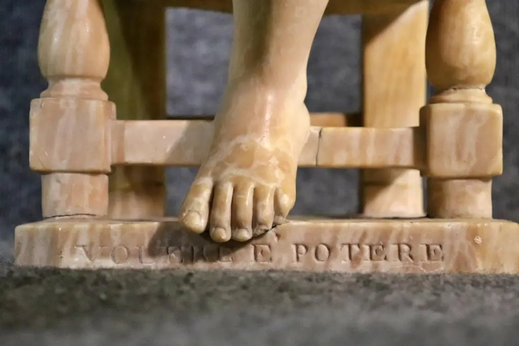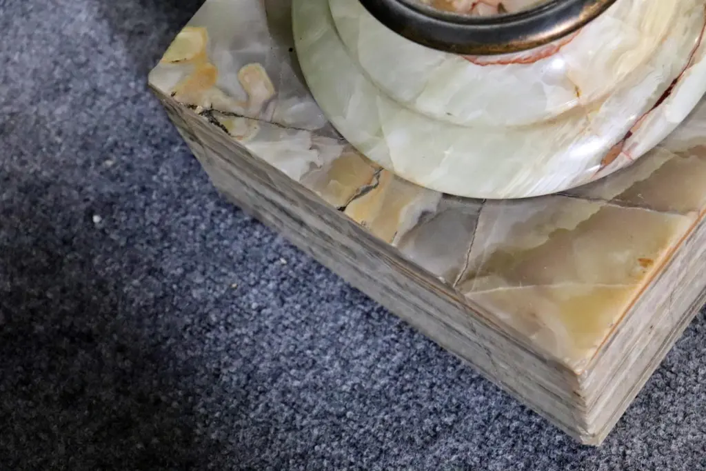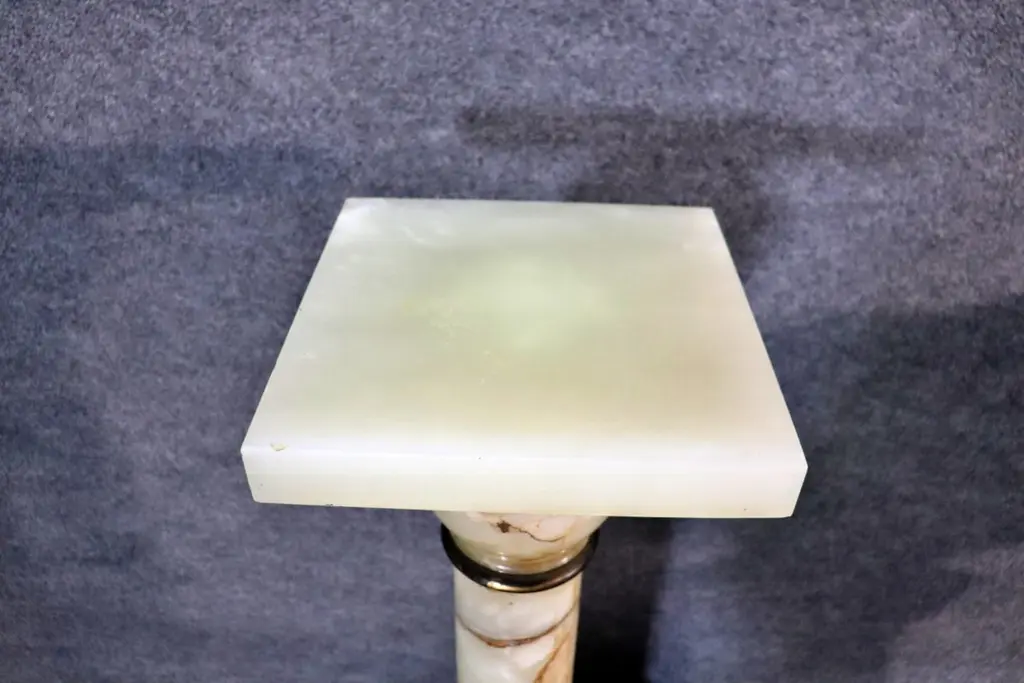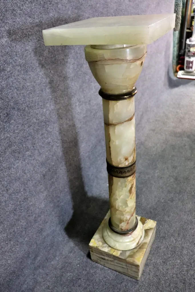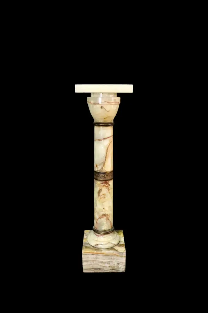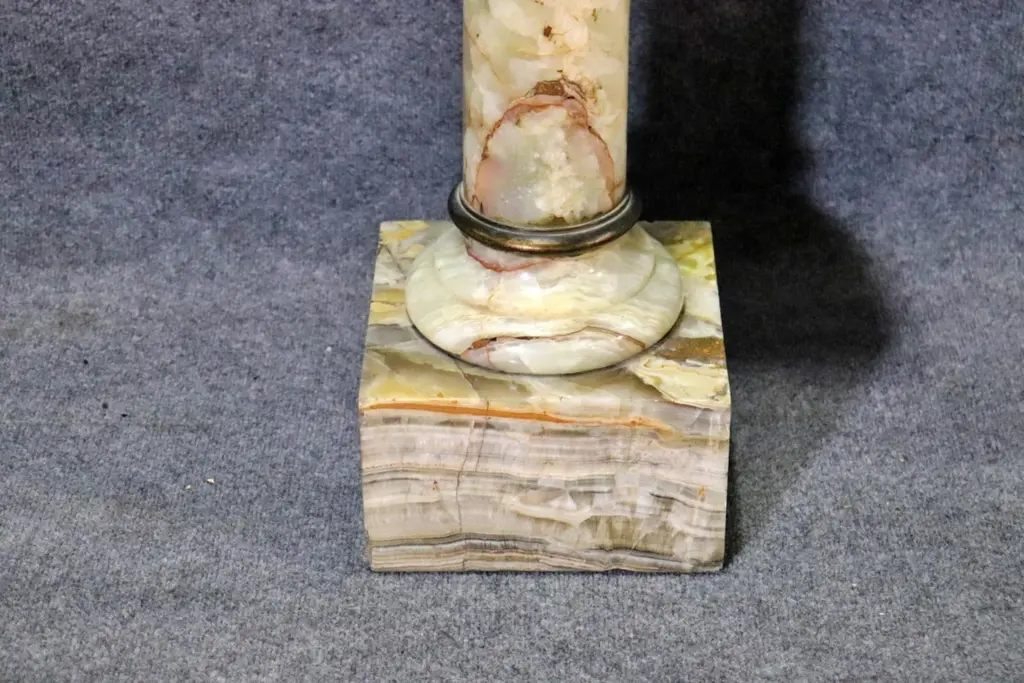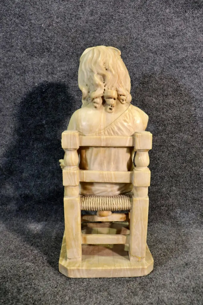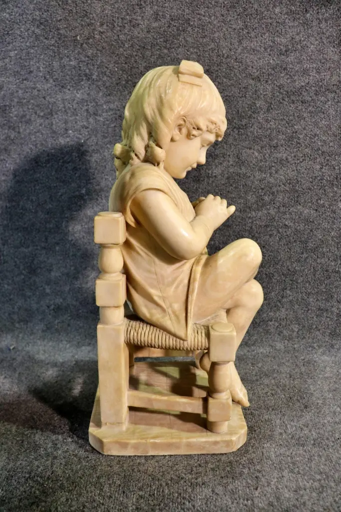 This Cesare Lapini alabaster sculpture of a young girl, presented on a green onyx pedestal, is a fine example of 19th century Italian craftsmanship. Renowned for his delicate and emotive marble and alabaster figures, Cesare Lapini (1848–1893) was an acclaimed Florentine sculptor whose works capture innocence, grace, and realism. This charming piece depicts a seated girl in a contemplative pose, rendered with exquisite detail from her hair to the folds of her dress, showcasing Lapini’s ability to breathe life into stone.The alabaster figure is elevated on a striking green onyx pedestal, accented with bronze banding for a refined and classical presentation. The warm tones of the onyx beautifully complement the milky translucence of the alabaster, enhancing the sculpture’s elegance and visual impact. Standing as both a work of art and a decorative statement, this sculpture and pedestal ensemble would make a stunning focal point in a formal living room, library, or grand entryway.A collectible piece of Italian sculpture, this Cesare Lapini alabaster figure with its original pedestal represents timeless artistry, perfect for connoisseurs of fine antiques and European decorative arts.Dimensions:Sculpture measures: 22 1/2" h x 9 5/8" w x 11" dPedestal measures. 36 1/4" h x 11" w x 11" d.