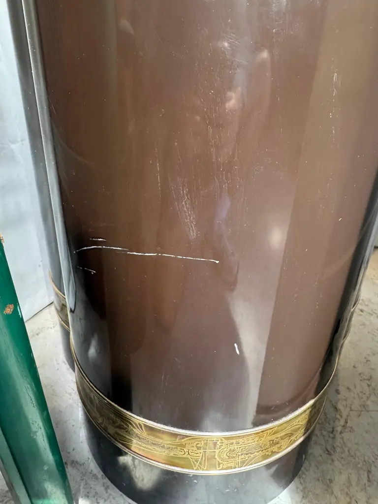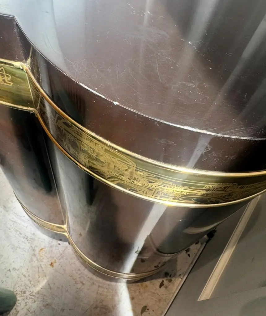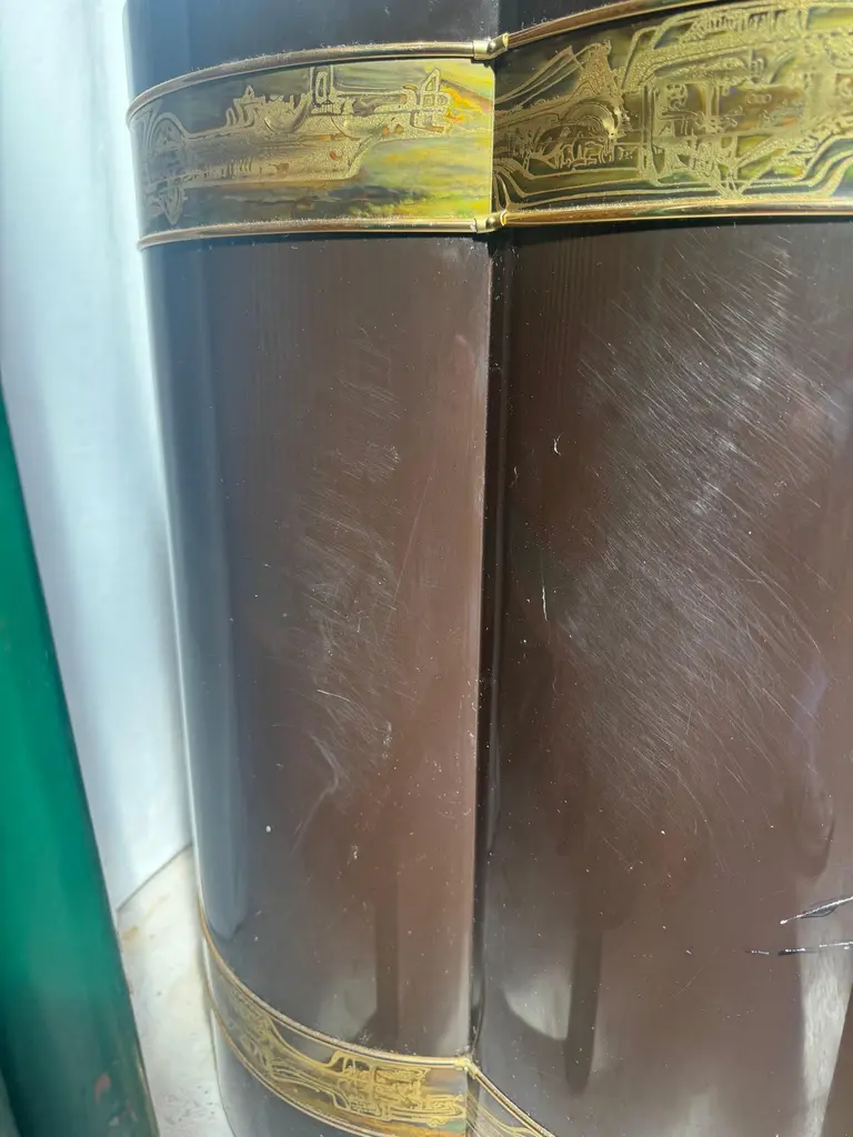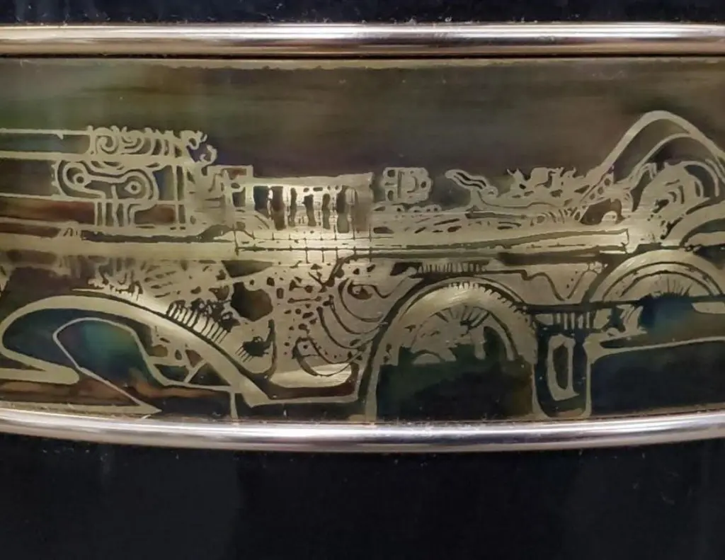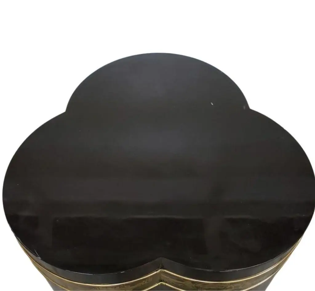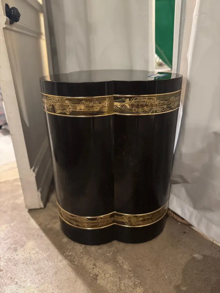 A rare circa 1970s Bernhard Rohne for Mastercraft trefoil pedestal table, featuring a luxurious black lacquered finish with signature oxidized brass etching. This sculptural piece exemplifies the opulence and craftsmanship of the Mid-Century Modern and Hollywood Regency movements, blending artistic abstraction with refined materials.The trefoil shape, a defining characteristic of this design, adds fluidity and organic symmetry to its presence, making it a perfect statement piece for interior designers, collectors, and enthusiasts of vintage luxury furniture. The etched brass bands, wrapping around the top and base, display Rohne’s unmistakable artistic hand, depicting abstract, architectural motifs that enhance the table’s modern aesthetic.Perfectly suited as a pedestal for sculptures or vases, a unique side table, or an elegant display stand, this piece effortlessly bridges function and fine art. Whether placed in a living room, foyer, or office, its timeless allure and sophisticated detailing will elevate any space.