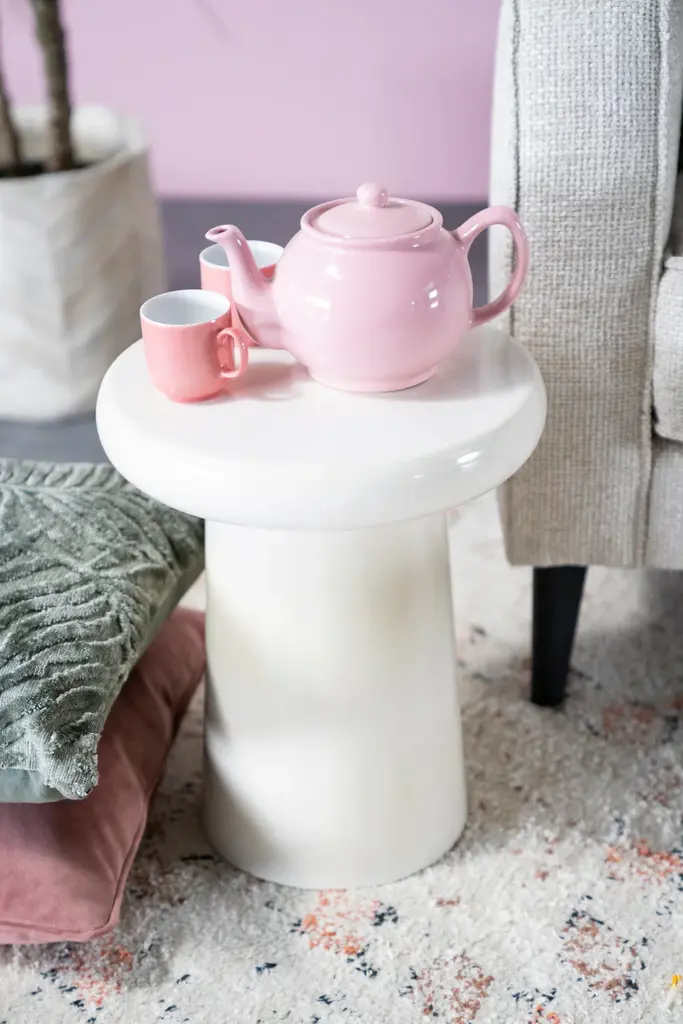 Glaze spells out a modern minimalist interior design. Made with glossy cream ceramics, this round side table inspires a clean and sophisticated atmosphere to any living space.