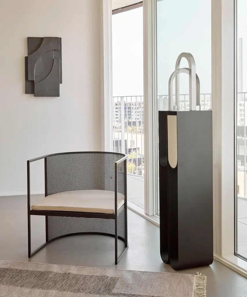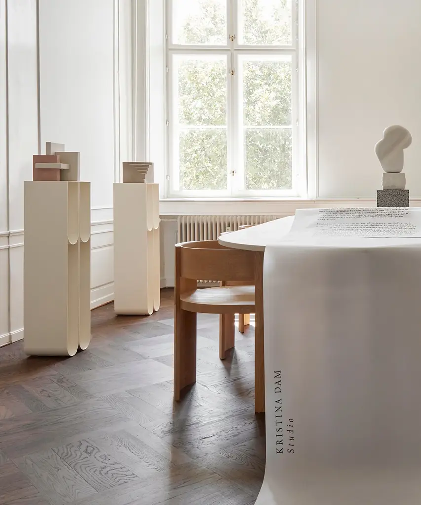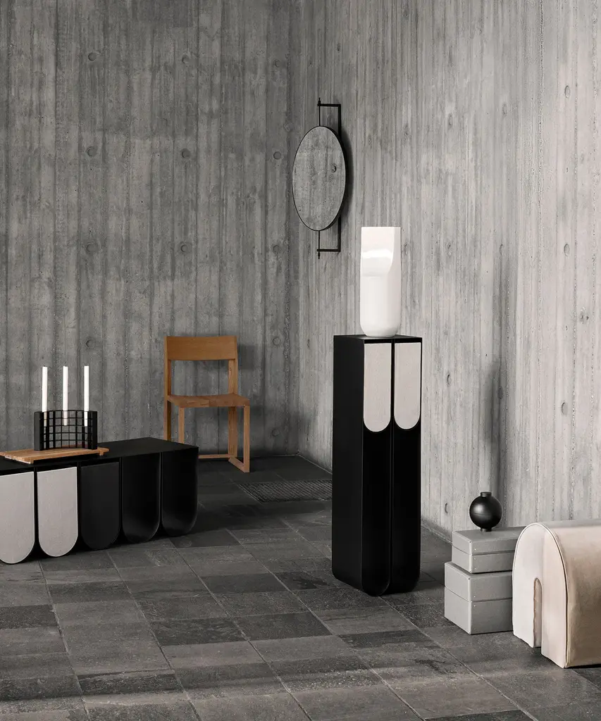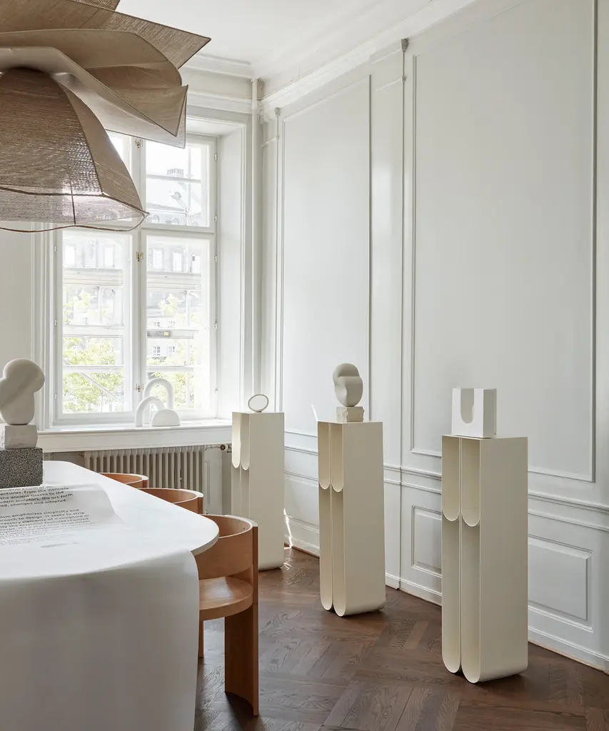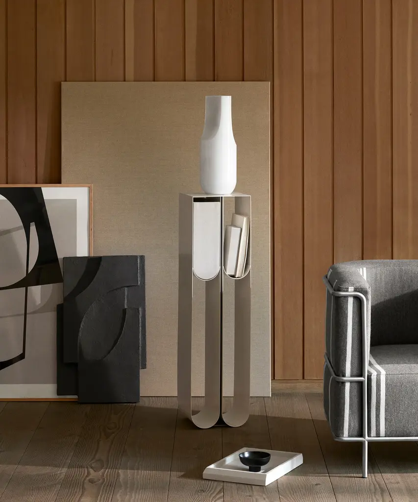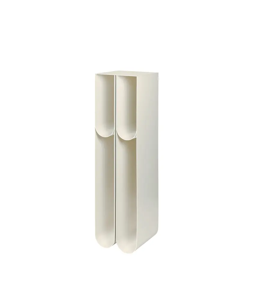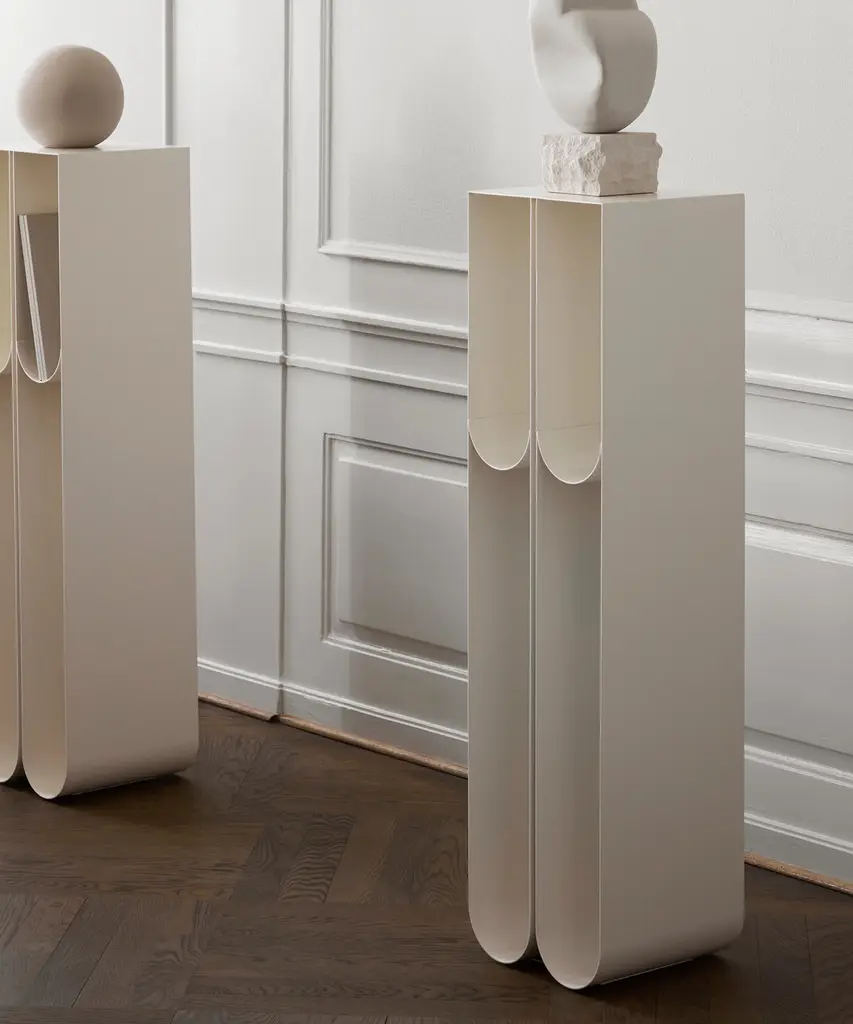 Nothing sets off a treasured art piece like a stand-alone pedestal. The Curved Pedestal has a graphic and minimalistic expression that underlines the displayed objects while subtly claiming its space. The Curved Pedestal is made of thin powder-coated metal with four storing frames where separately sold boxes fit elegantly. Curved Pedestal is a part of the Curved series that consists of sculptural timeless signature designs, paying tribute to simplicity.Designed by Kristina Dam Studio in Copenhagen, Denmark.