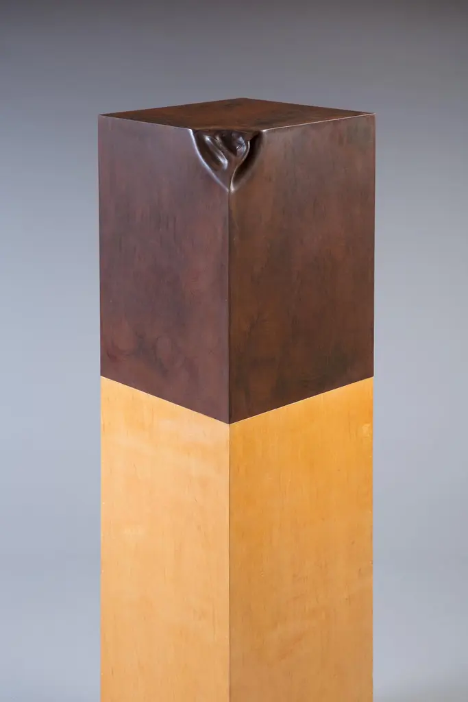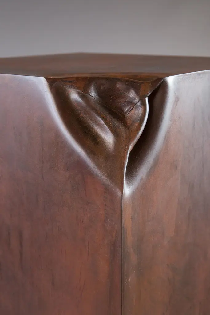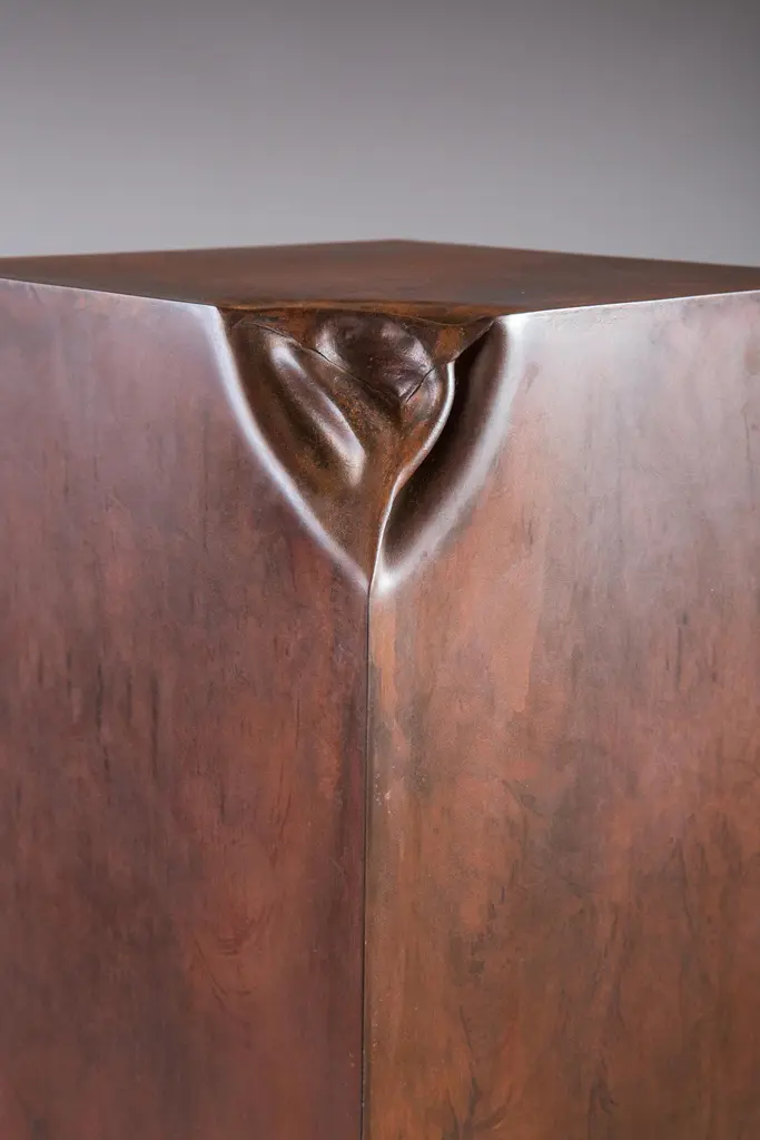 Welded steel cube atop wooden mount completing this one of a kind sculpture.Antique rusted patina with clear coat finishLacquered wooden pedestal mount.