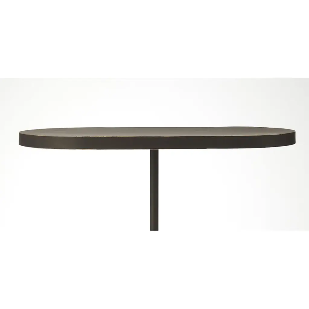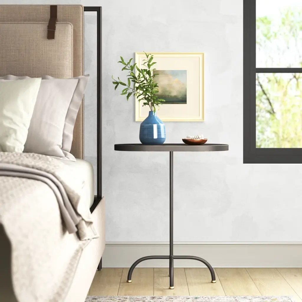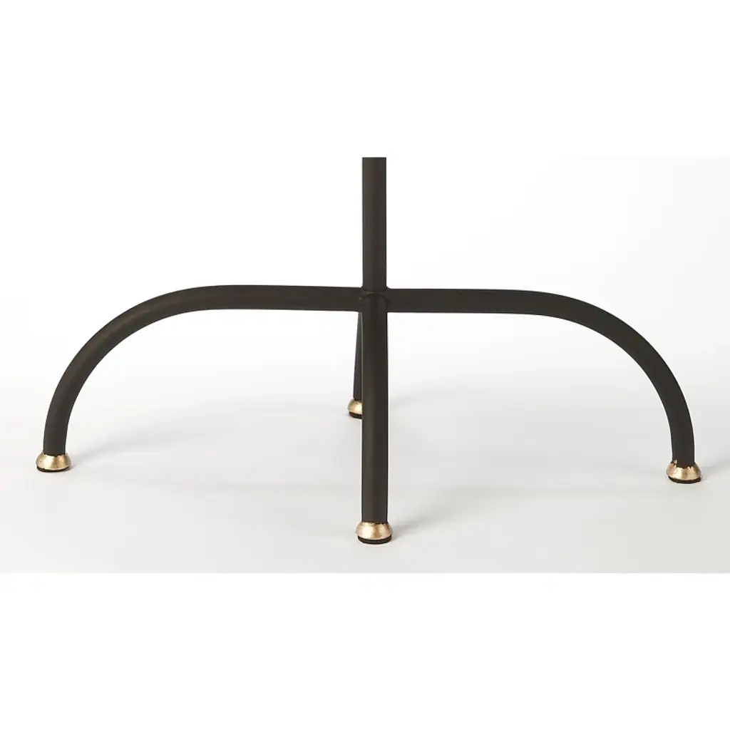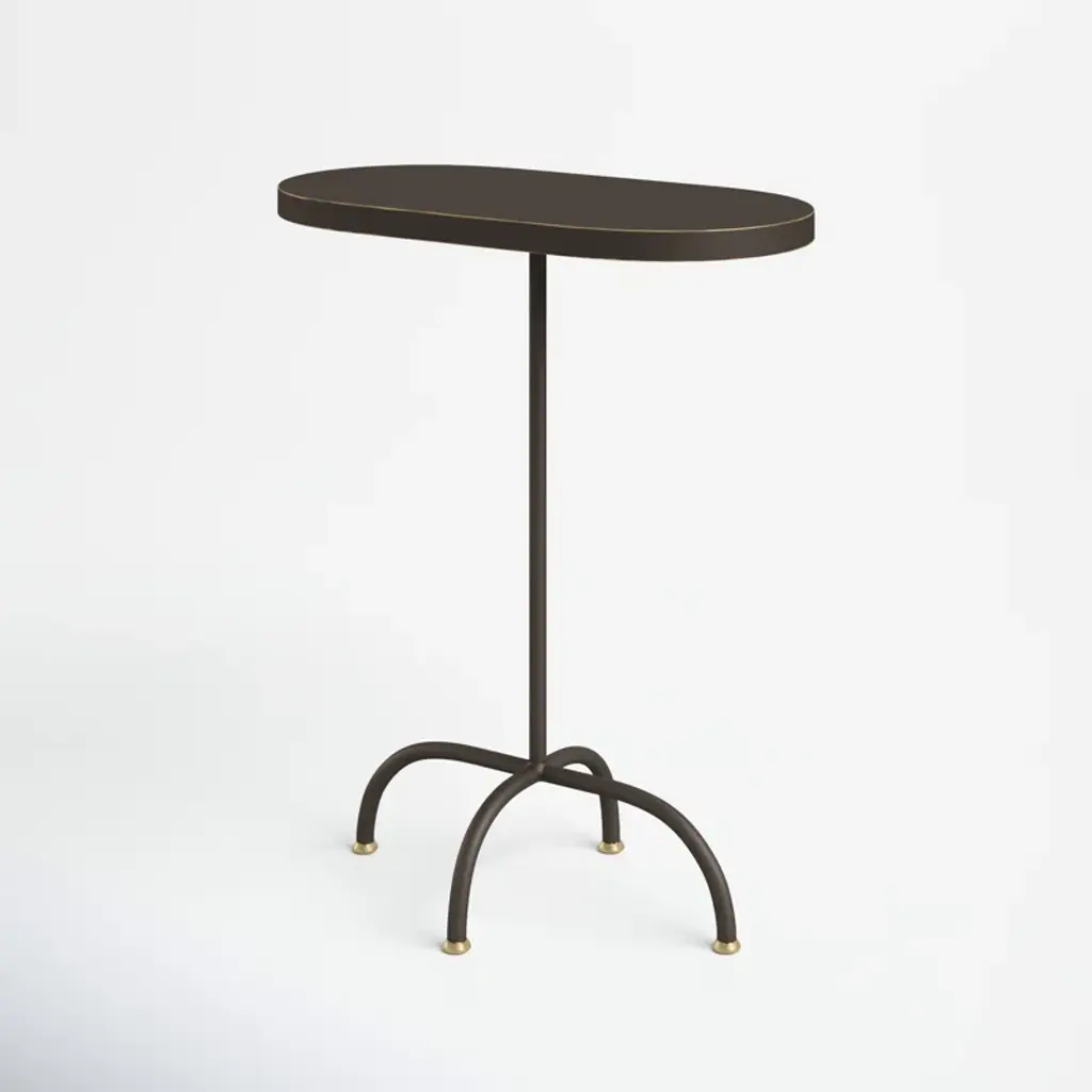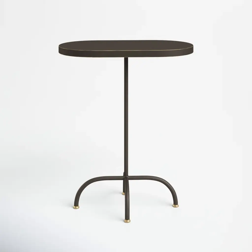 This simple and modern end table will look great in virtually any space. It is crafted from black finished metal and wood with gold edge details and a pedestal base.