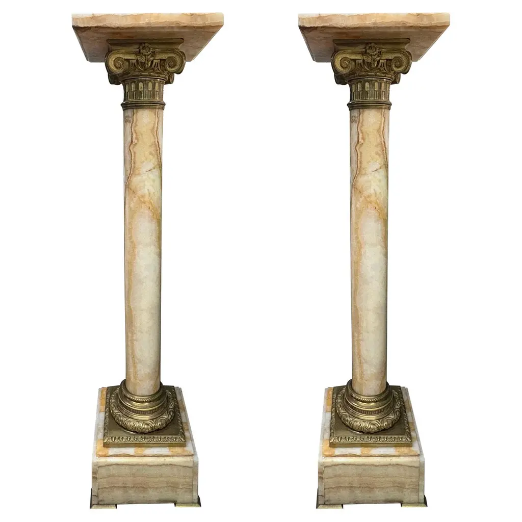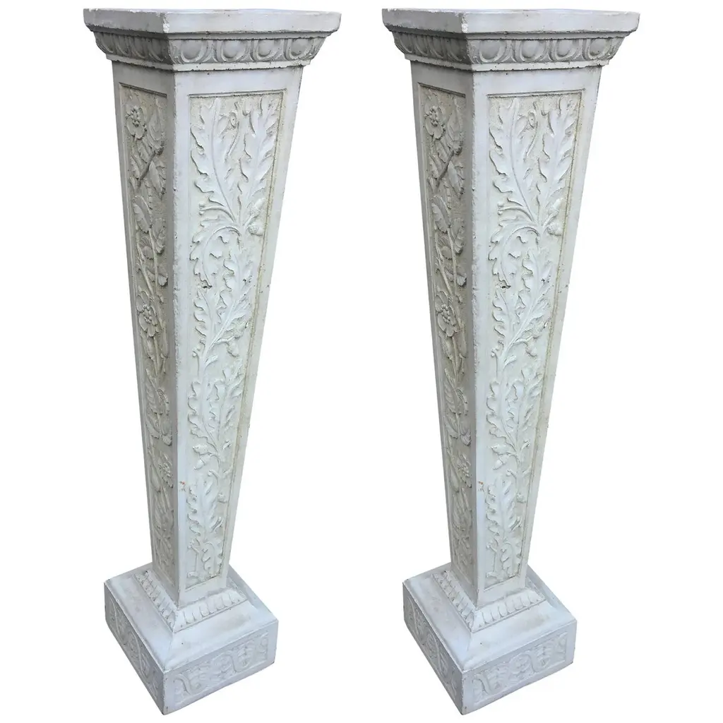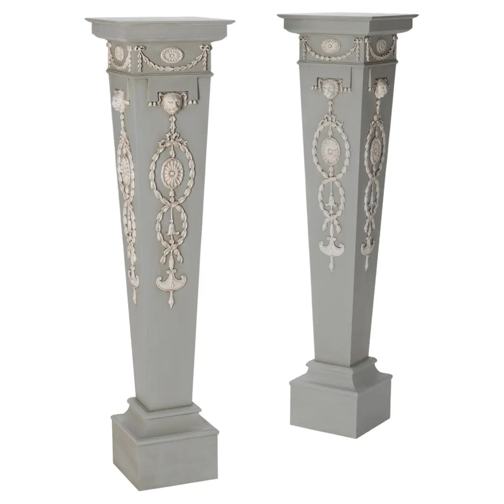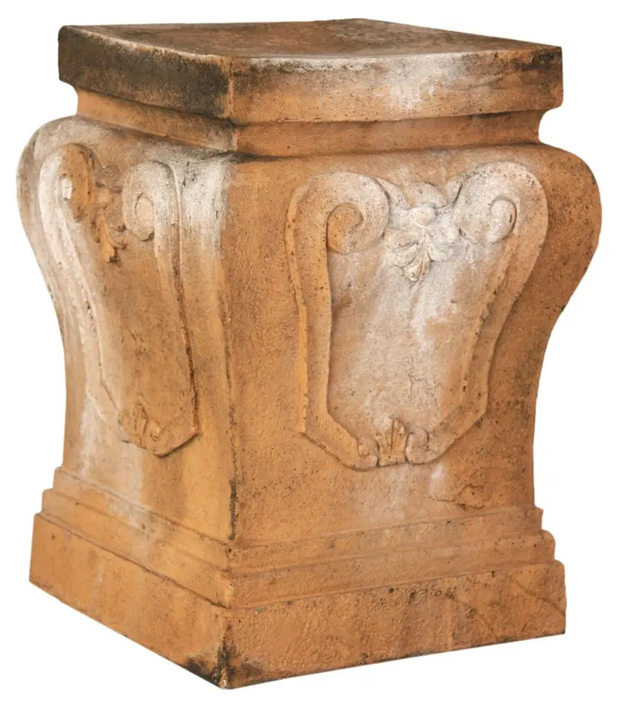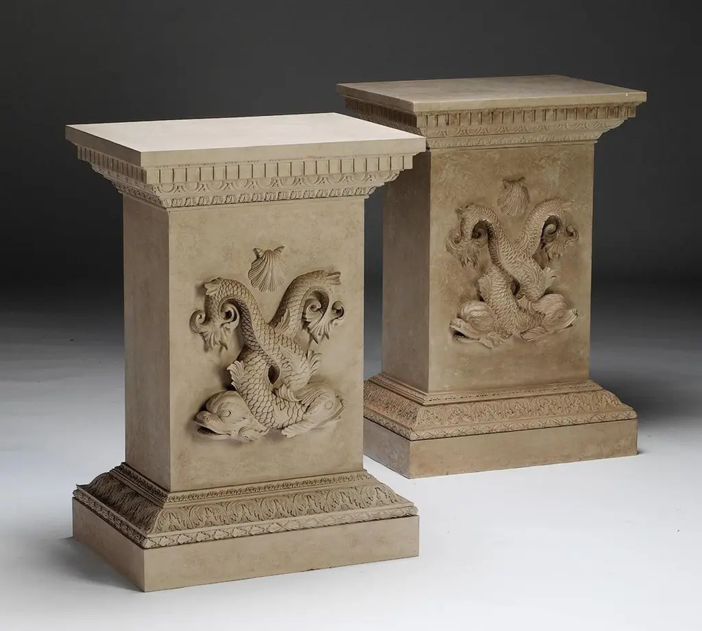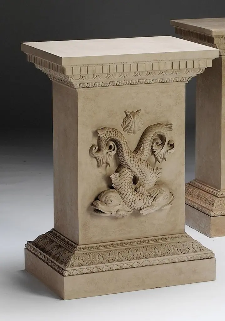 This handsome carved pedestal has a square, carved and dentil-moulded top. Finely carved with entwined dolphins below scallop shells. The base of complex carved leaf compound moulded plinths.This item is made to order. Note that the price is for each pedestal / end table.We are currently working to a 30-36 week lead time.