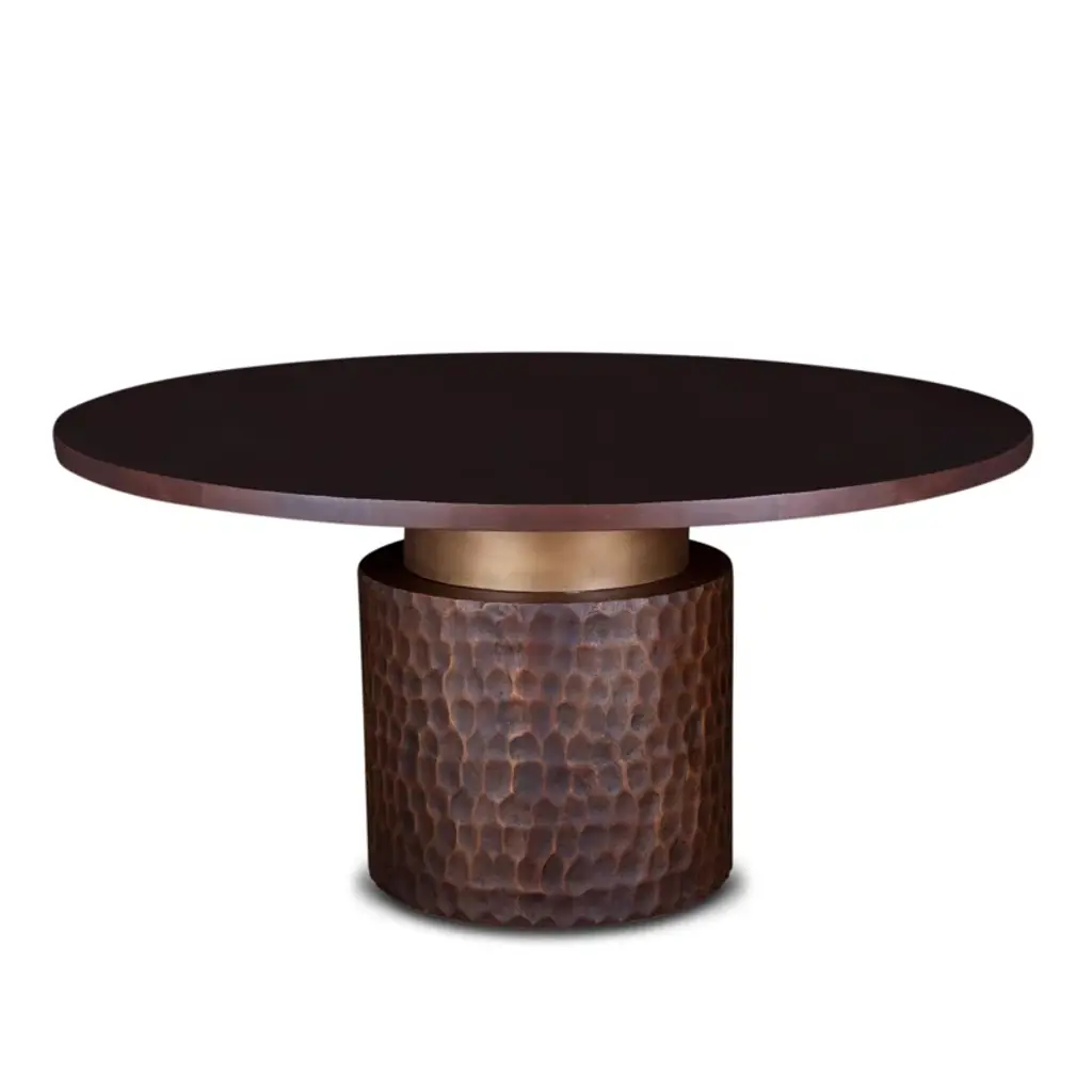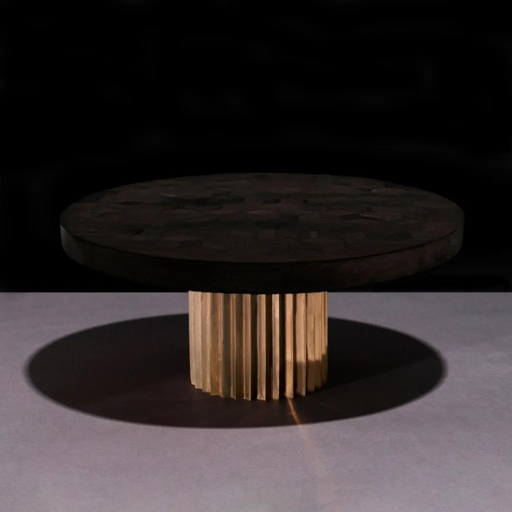 Dining or entrance table with marquetry top in ebonized Oak and multifaceted pedestal in cast bronze. The marquetry tabletop in reclaimed Oak contains 222 rhombi cut from old Italian wine barrels. Inspired by Doric columns in archaic architecture, the extruded multi-point star pedestal has a different finish on each vertical face: the cast metal is polished on one side but left raw on the other. The shading is amplified by the different finishes resulting in a dramatic effect. The pedestal(s) can be combined with any kind of top in any shape or dimension. Crafted in Tuscany, Italy, in a foundry specialized in bronze sculptures, serving artists among the most renowned in the world.Top material: ebonized reclaimed Oak from old wine barrels.Pedestal material: bronze (polished and coarse).Standard sizes:top 160 cm / 5'3" dia (seats 8)top thickness 10 cm / 3.9" (height underneath 68 cm / 26.8")pedestal 60 cm / 25.2" diaAbout Fred&Juul:Fred&Juul renew traditions by making customs and techniques reappear from the past while applying fine Italian craftsmanship to contemporary design. Founded by Italian-Dutch architects’ duo Federico Minarelli and Julie Janssen, the brand explores the possibilities of producing designs that are versatile and elegant while being exclusively handcrafted by local artisans from traditional materials like brass and solid wood. Fred&Juul’s design philosophy is aimed at sustainability and contrasting the throw-away society by creating pieces that will last, both for their exceptional quality and for their timeless appearance.Every piece is manufactured in small specialized workshops scattered around Tuscany. The designers manage the entire production process and have a direct relationship with the craftsmen and women, who are involved in the design process from the early stages. The result is contemporary collection that conjures up the refined artistry of centuries old craftsmanship.