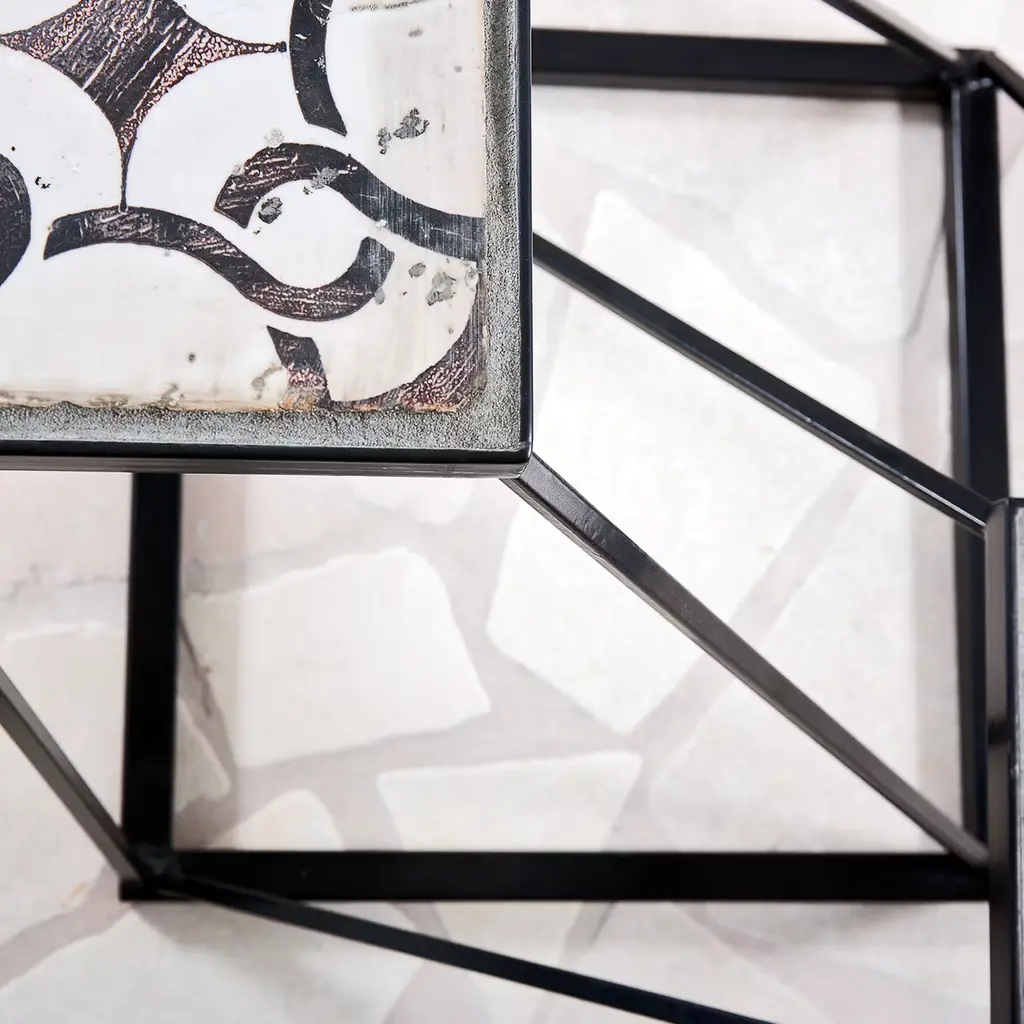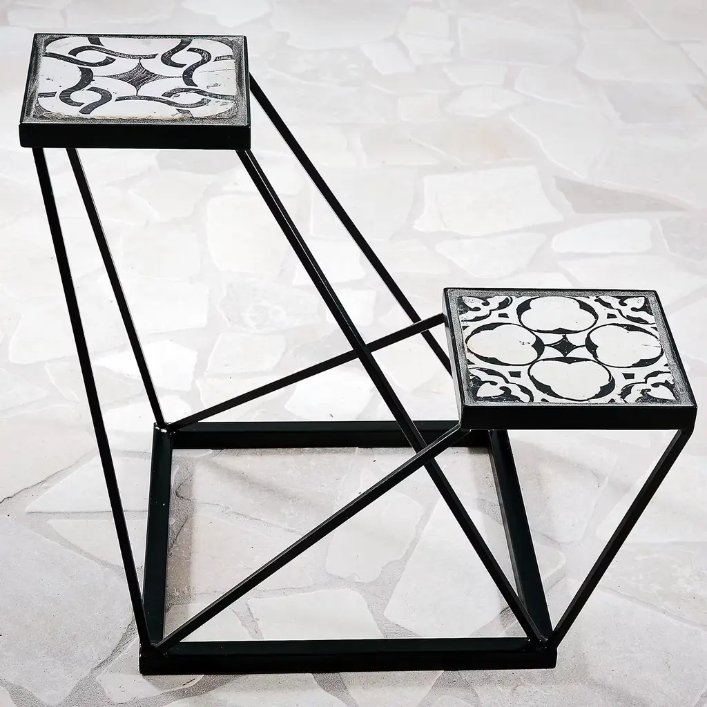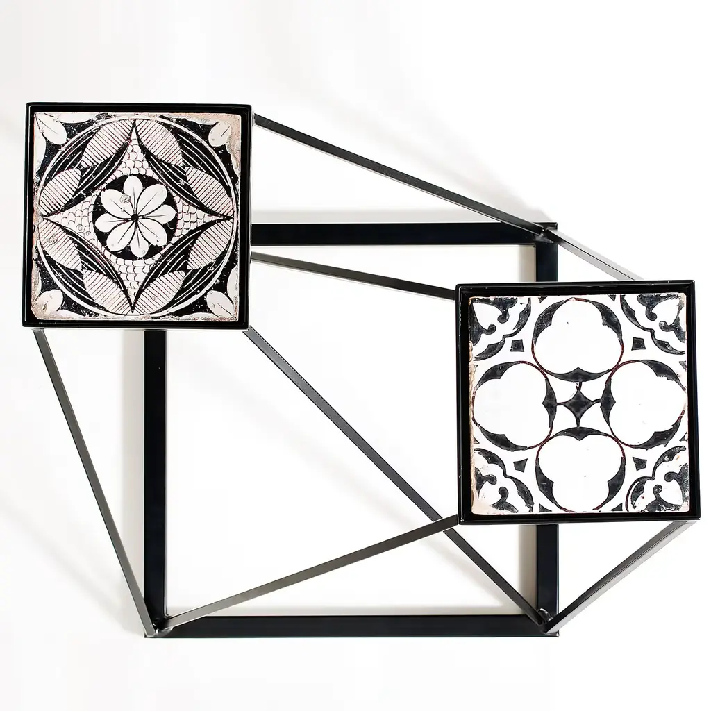 Two hand-painted antique black and white tiles, retrieved from an old ceramic workshop, serve as shelves or table tops in this original dynamic structure by Neapolitan designer Francesco Della Femina. Modern design is complemented by the traditional technique of crafting wrought iron, executed by skilled artisans in Italy.