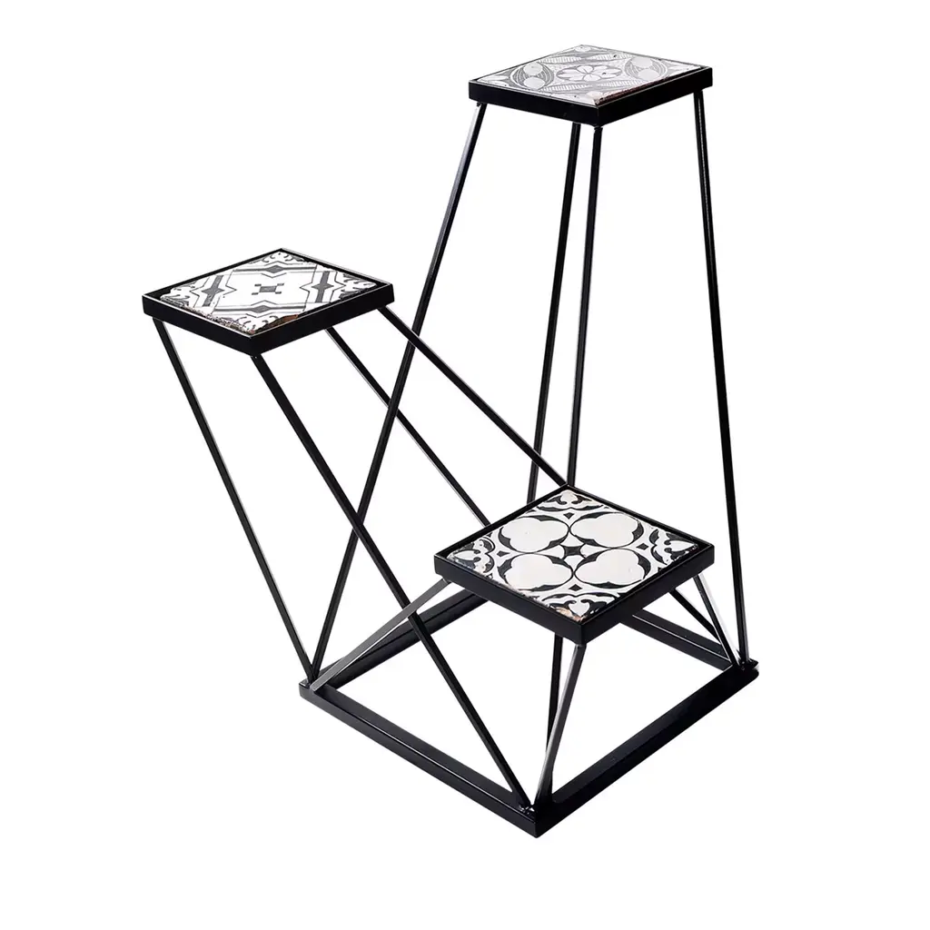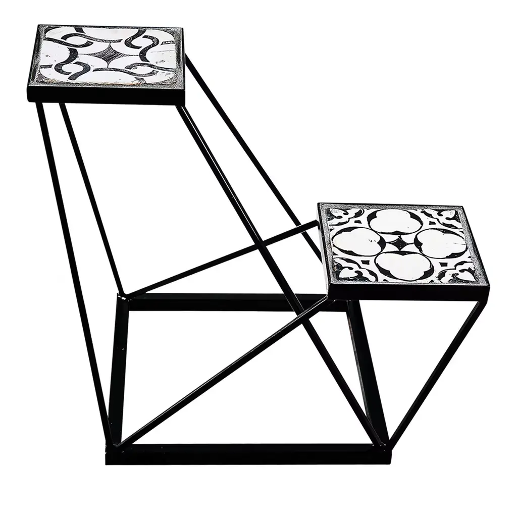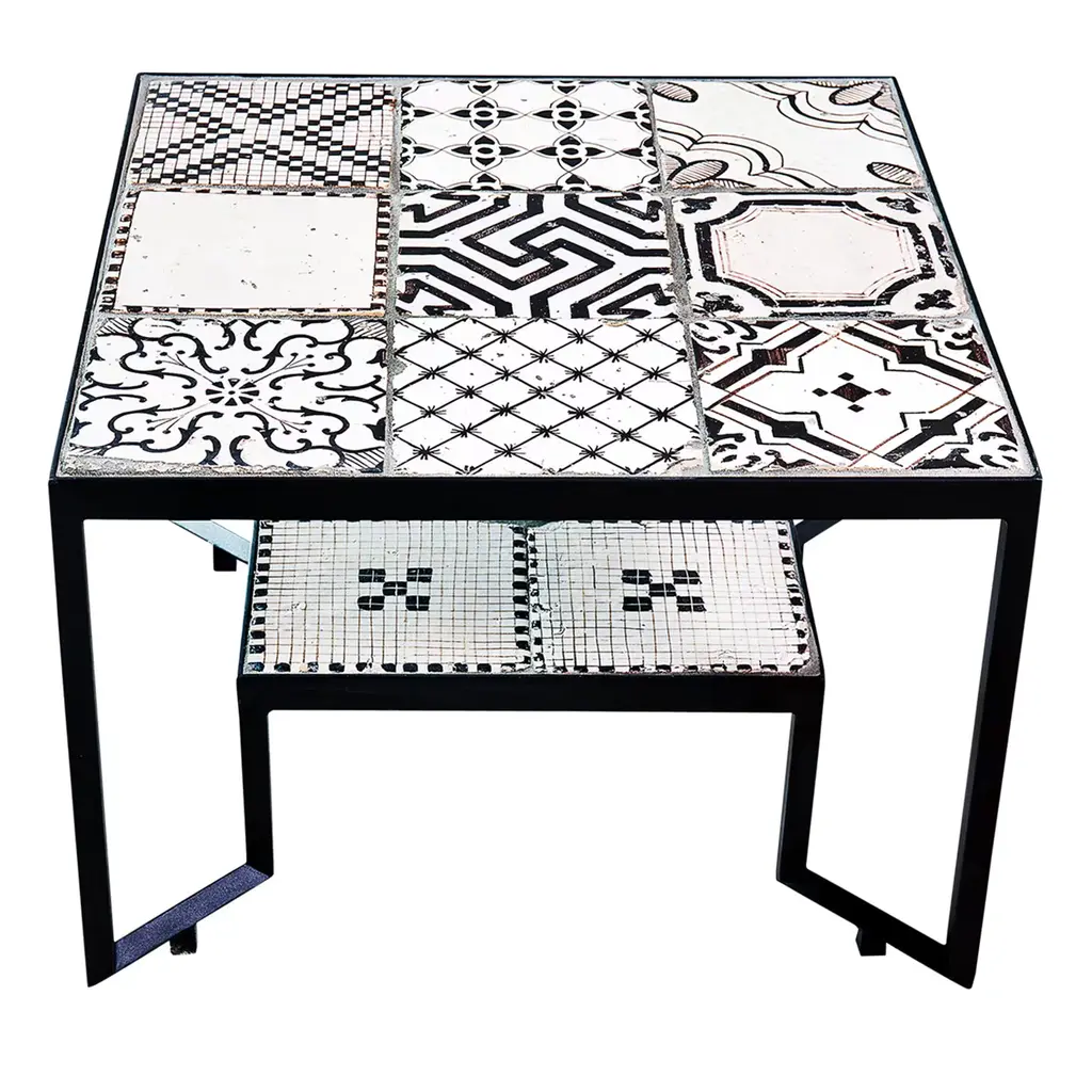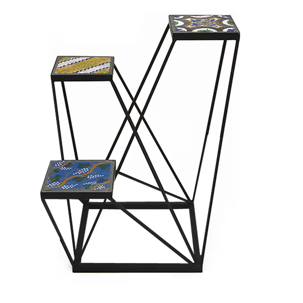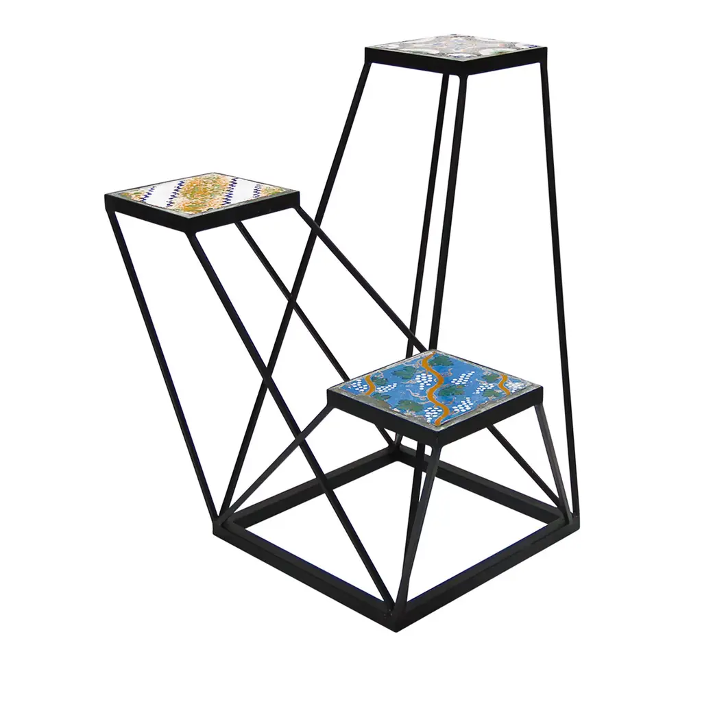 Two hand-painted antique tiles serve as shelves or table tops in this original dynamic structure by Neapolitan designer Francesco Della Femina. Modern design is complemented by the traditional technique of handcrafting wrought iron, used by skilled artisans around Naples for the piece.
