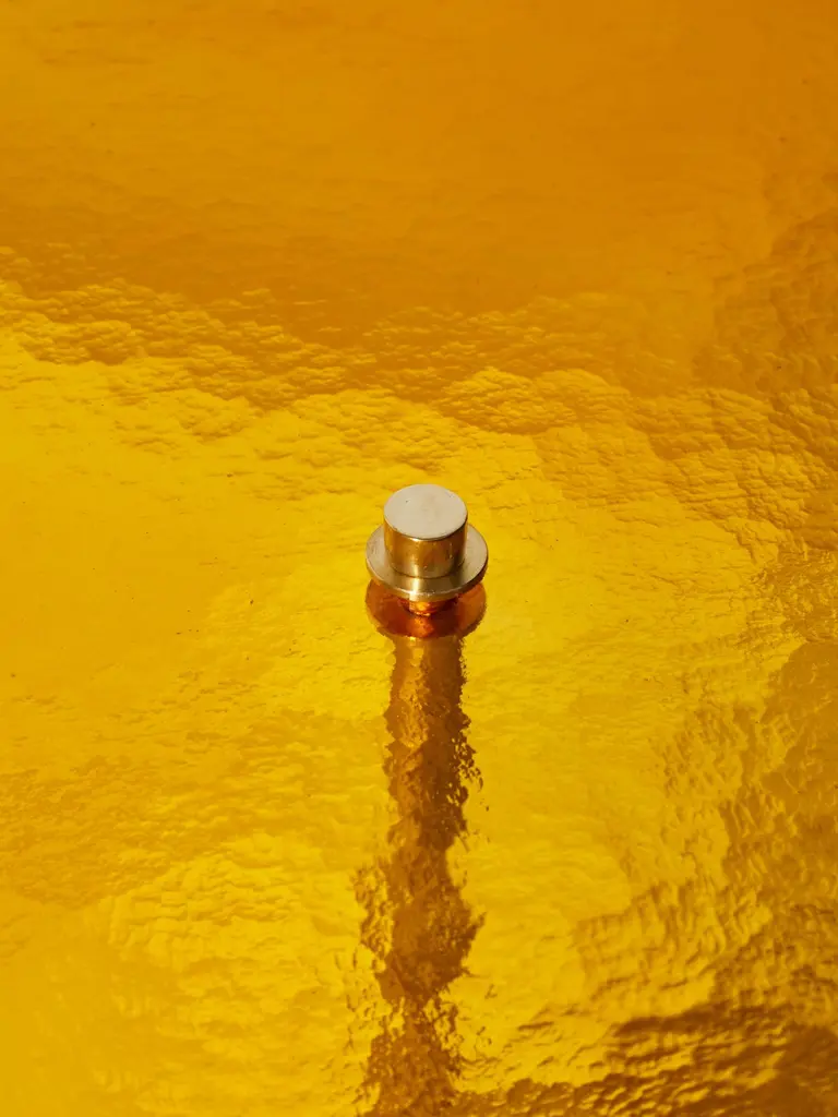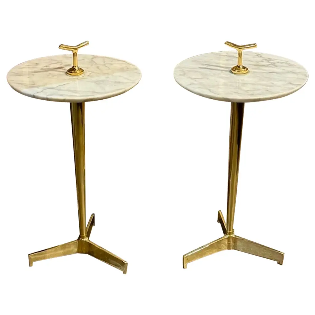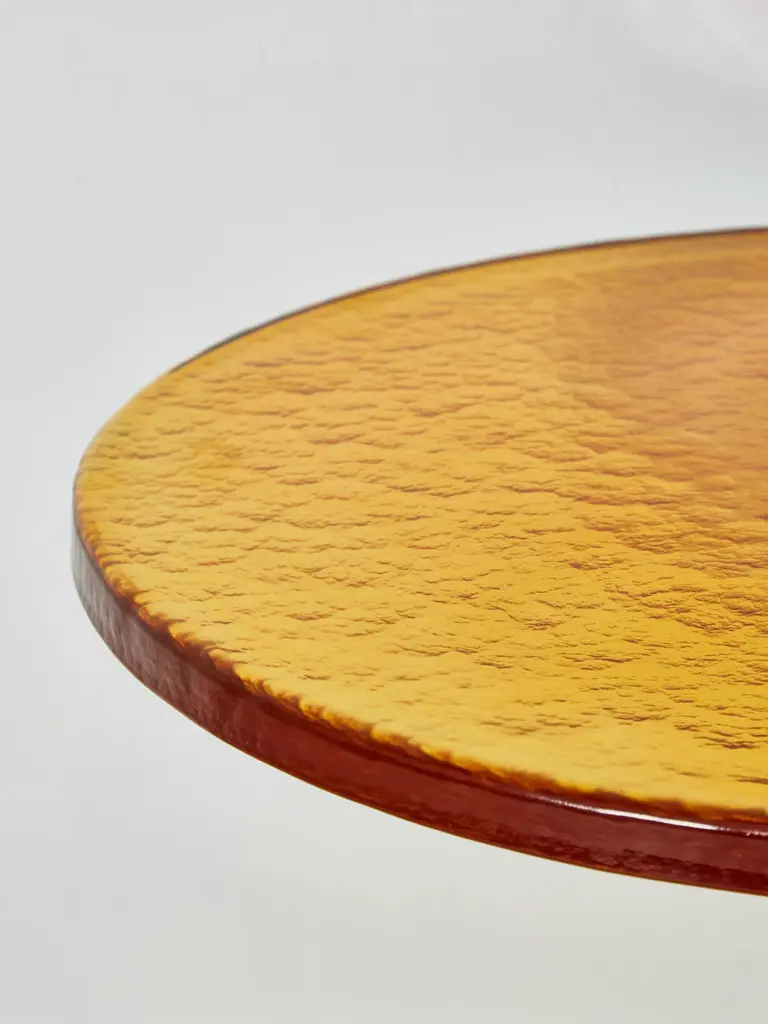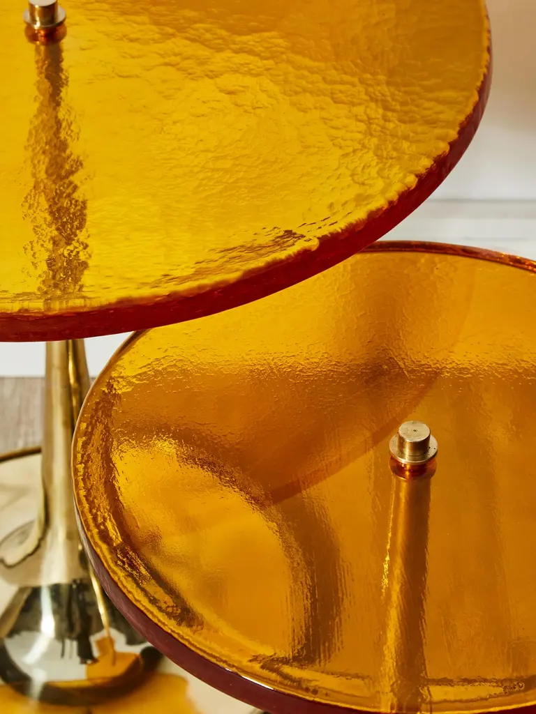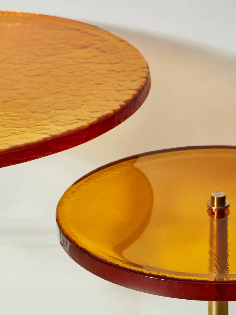 Superb pair of brass pedestals with 2 different heights, with tops in amber tainted Murano glass.Creation by Studio Glustin.Dimensions: - Ø 60 x H 62 cm- Ø 40 x H 52 cm.