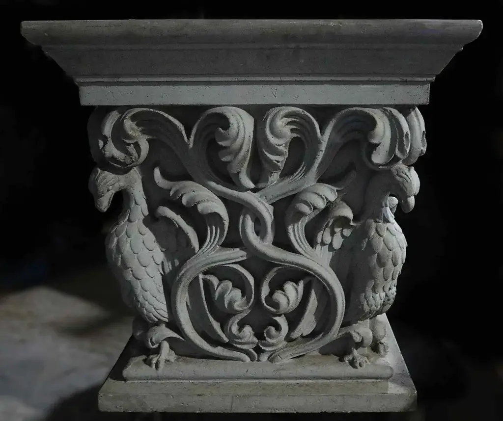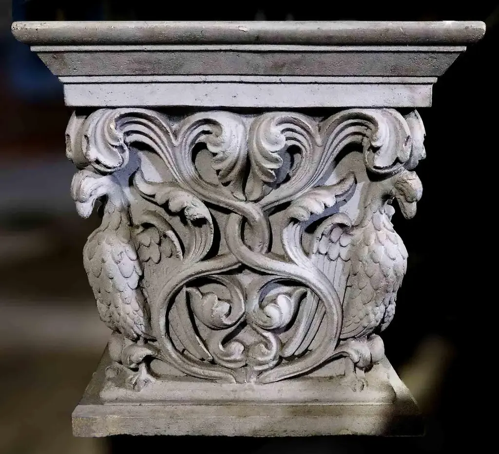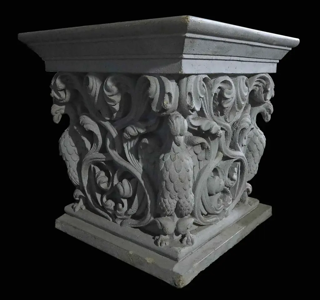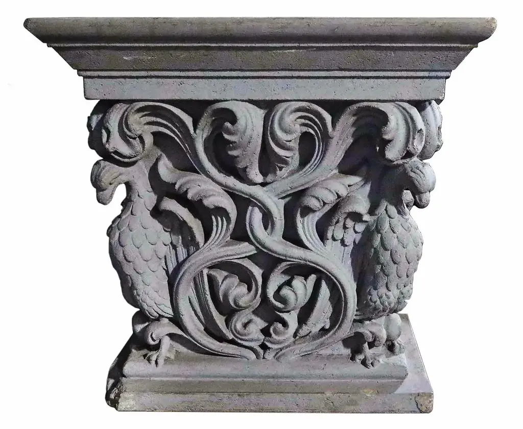 Early 20th century elaborate Neo-Romanesque style cast stone table or pedestal base. Foliate and fowl design. Circa 1920's.