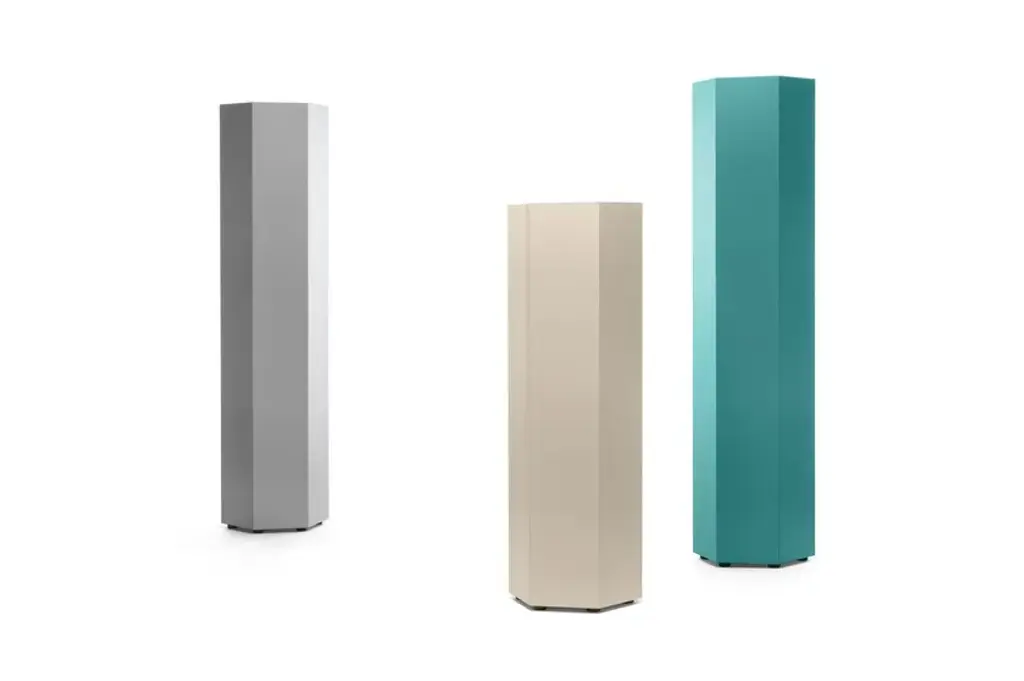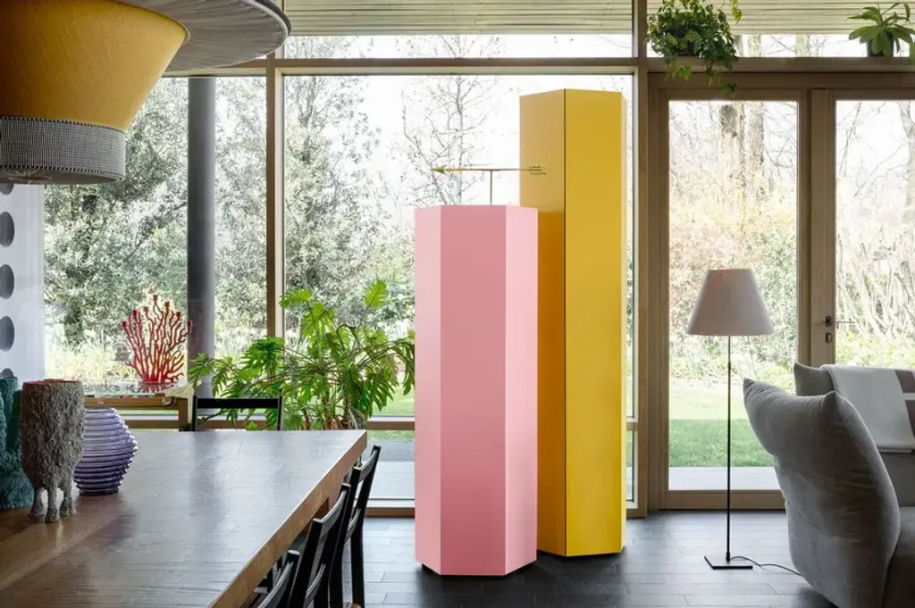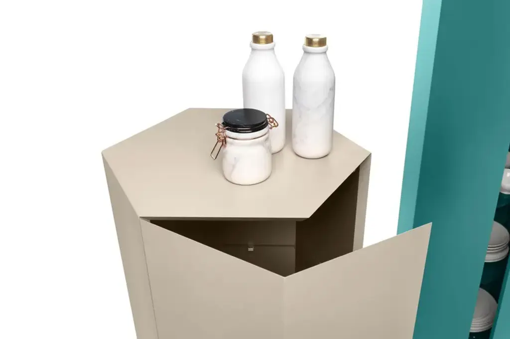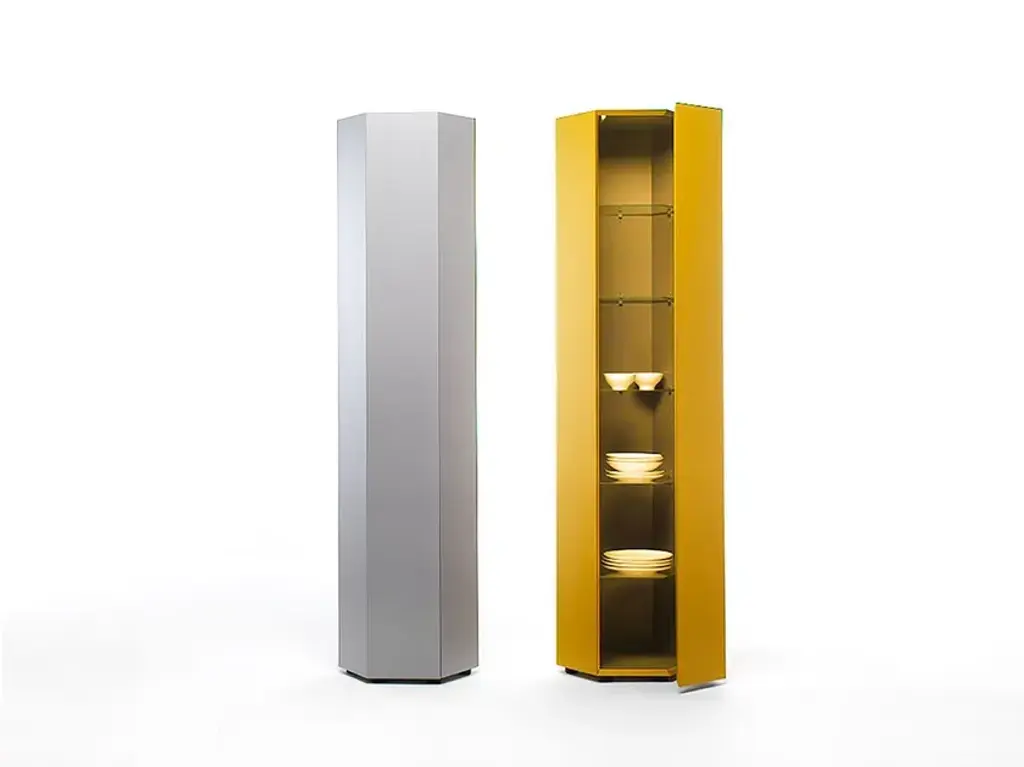 Exagon is a self-supporting container with 1 door and 3 internal glass shelves, featuring a hexagonal MDF base with a textured lacquer finish.