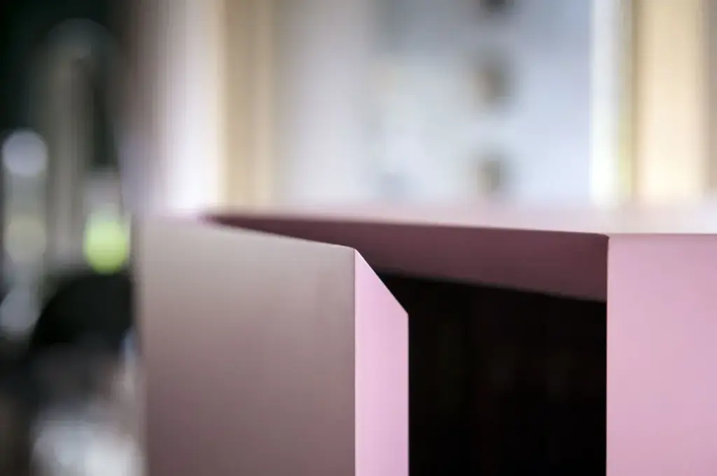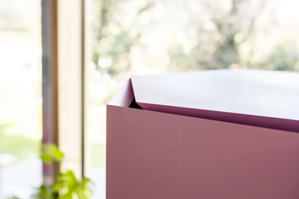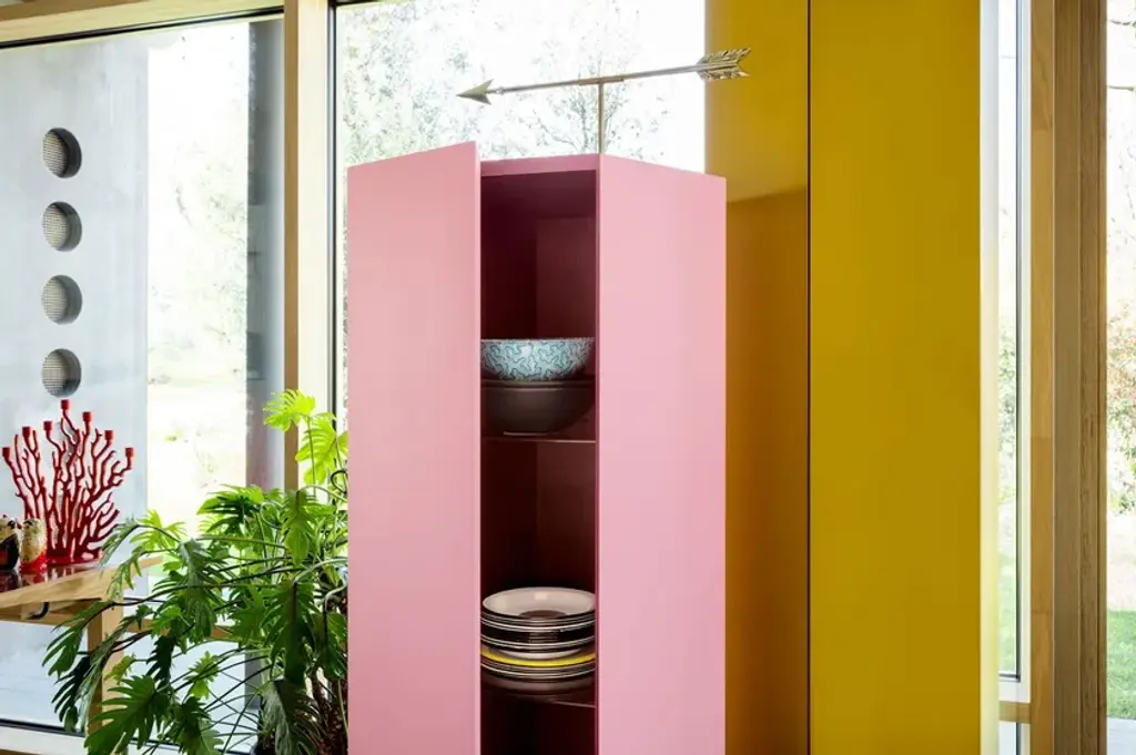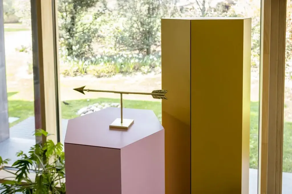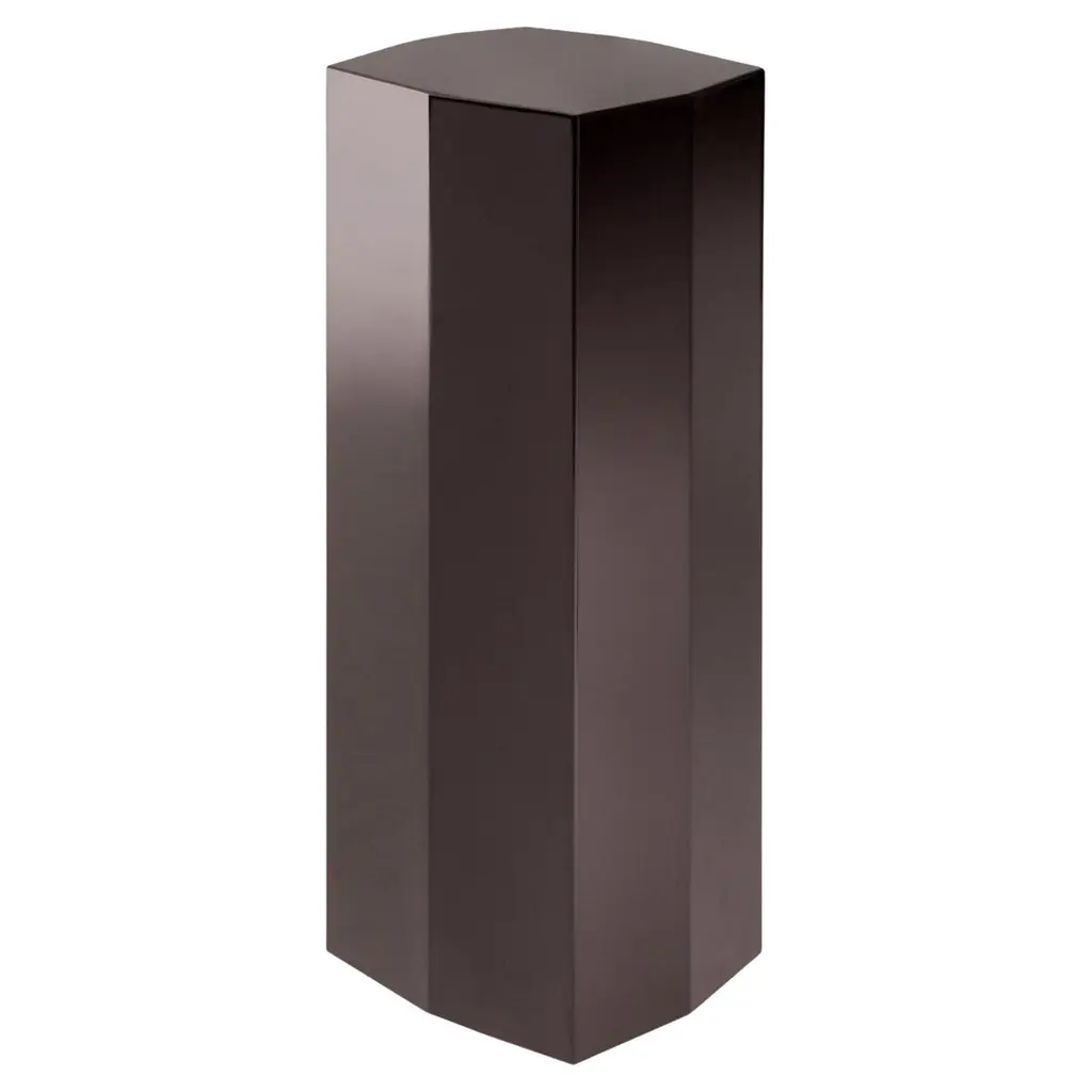 Exagon is a self-supporting container with 1 door and 3 internal glass shelves, featuring a hexagonal MDF base with a textured lacquer finish.