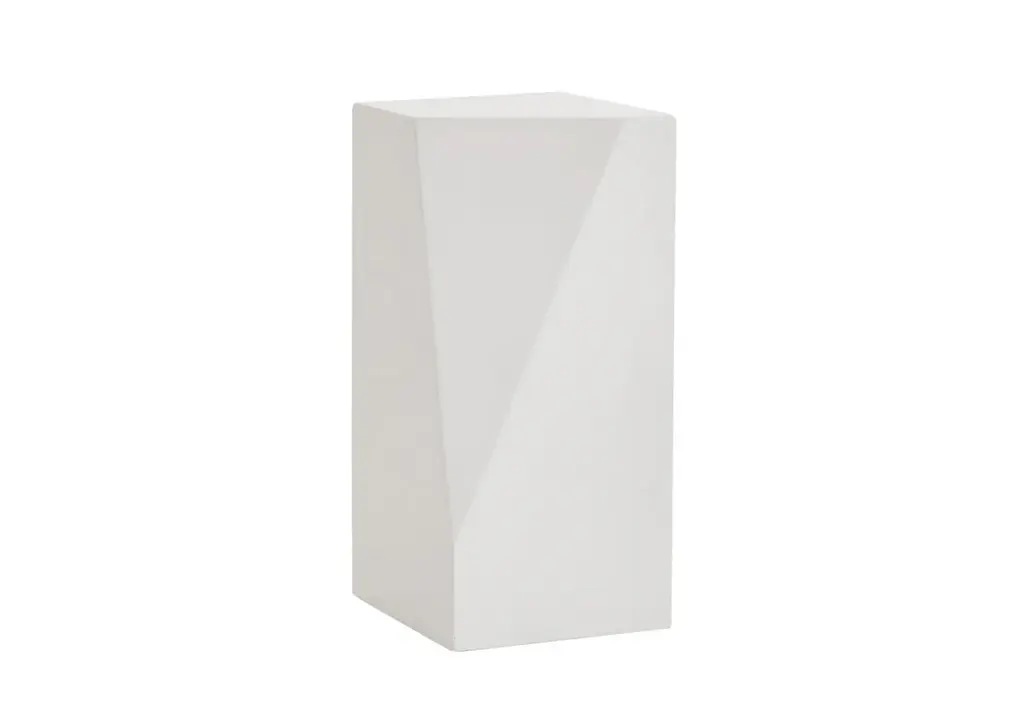 This geometric pedestal lends dimension and texture with its elongated rectangular form contrasted by one long, deep facet. Its versatile, interesting form styles effortlessly in living rooms or entryways and pairs well with vases and sculptural art.