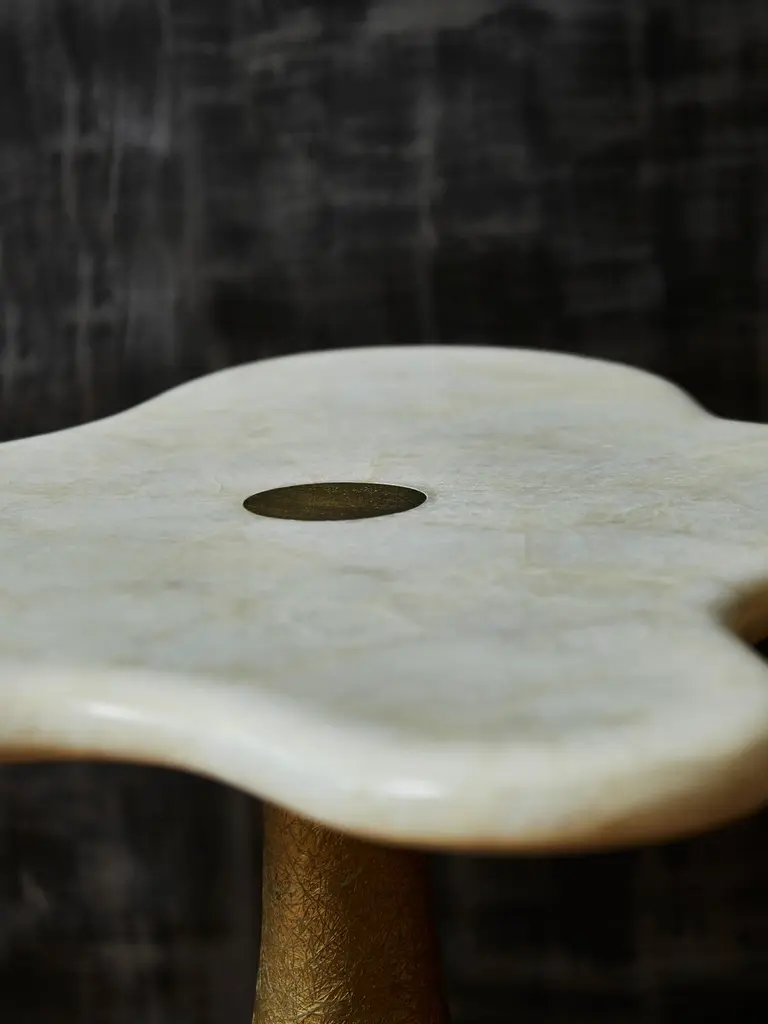 Elegant "Flower" pedestal in patinated brass and rock crystal top. Creation by Studio Glustin.