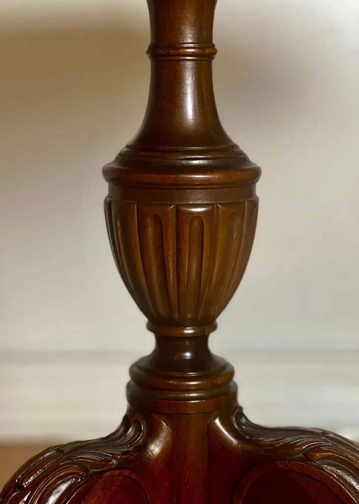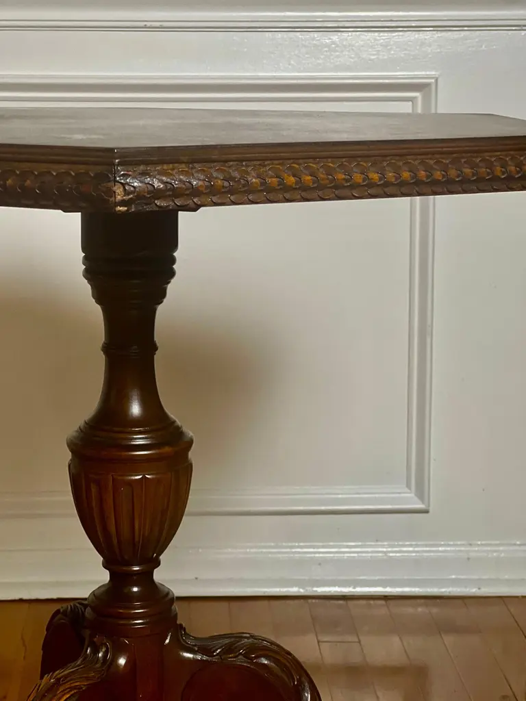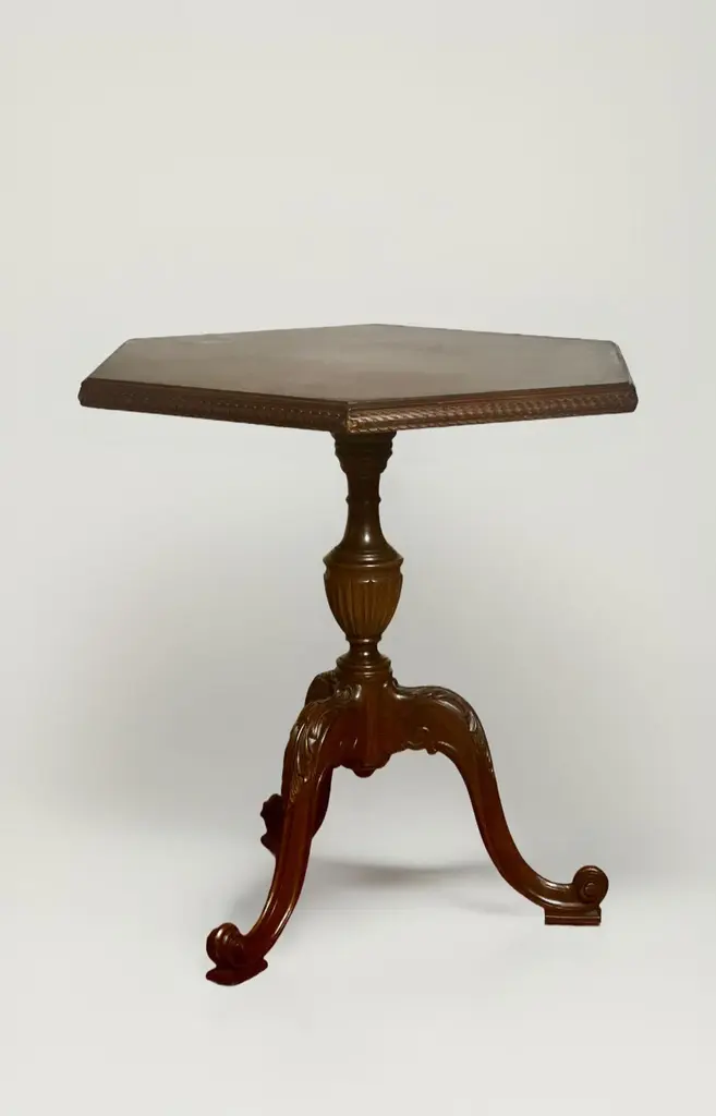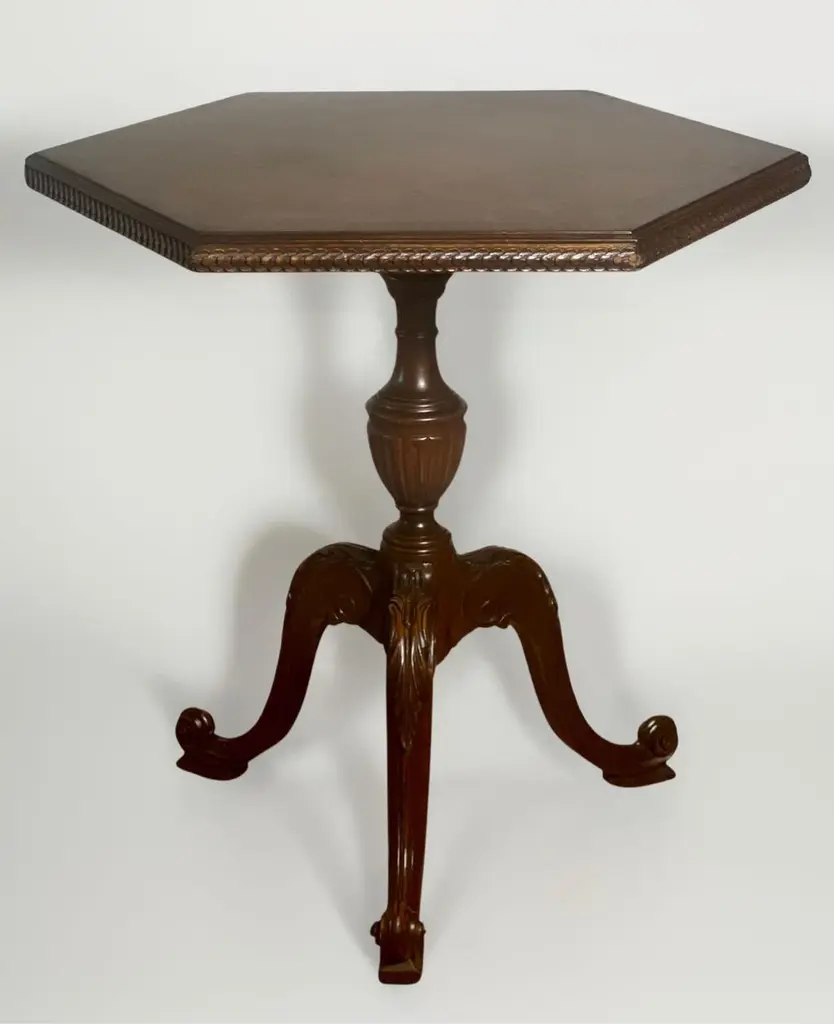 Exceptional French walnut burl hexagon shaped occasional, center hall or side pedestal table on a tripod base, circa 1930s. Richly carved with a book-matched and banded top with intricate stylized floral edge detail supported by an urn decorated pedestal on three cabriole legs with carved large acanthus leaves ending in scrolled feet. This is a gorgeous table with fabulous attention to detail boasting all the hallmarks of fine French craftsmanship and style. A versatile piece which will suit a variety of settings.29"h x 30"w x 28"d