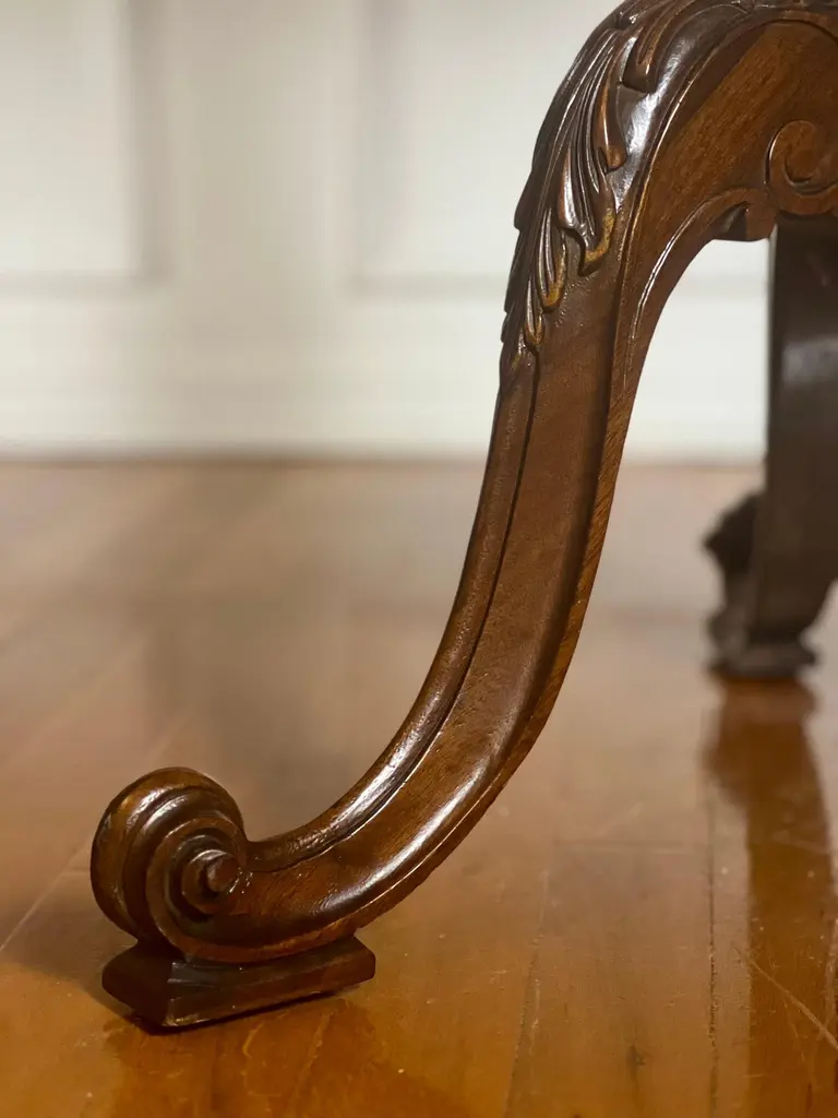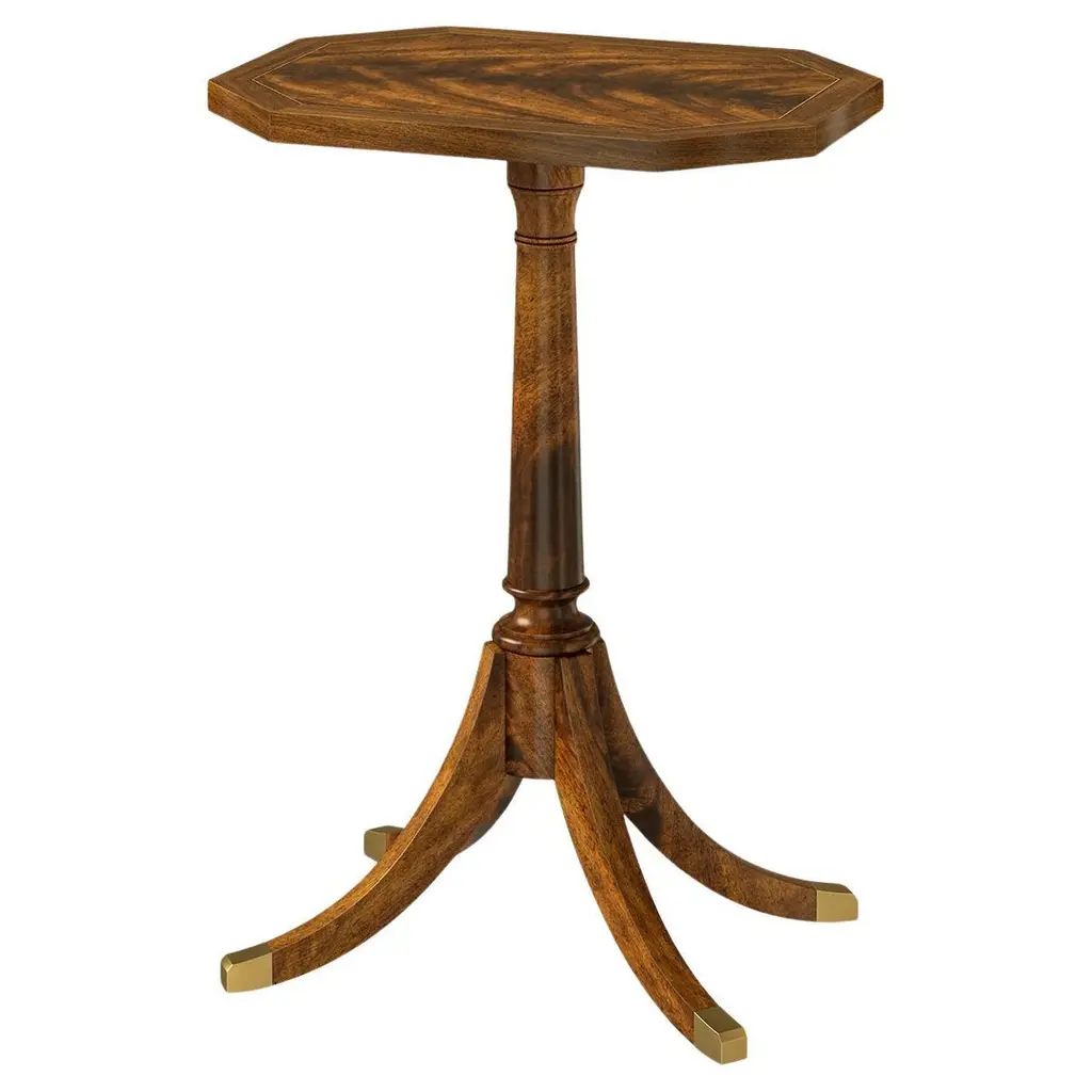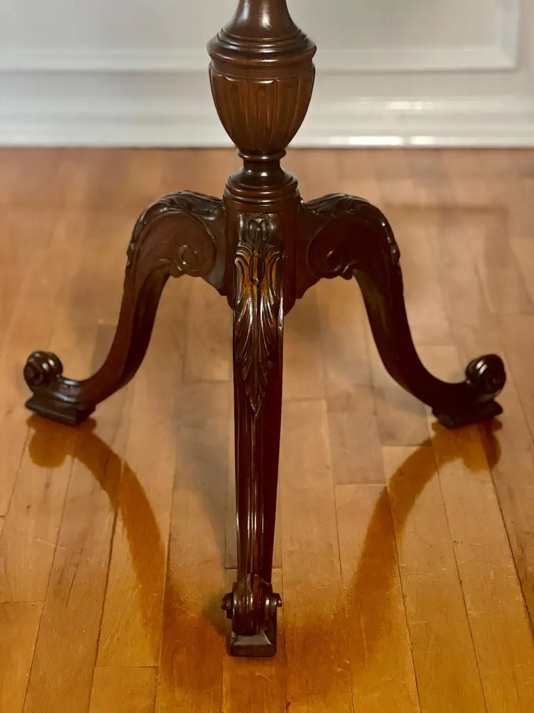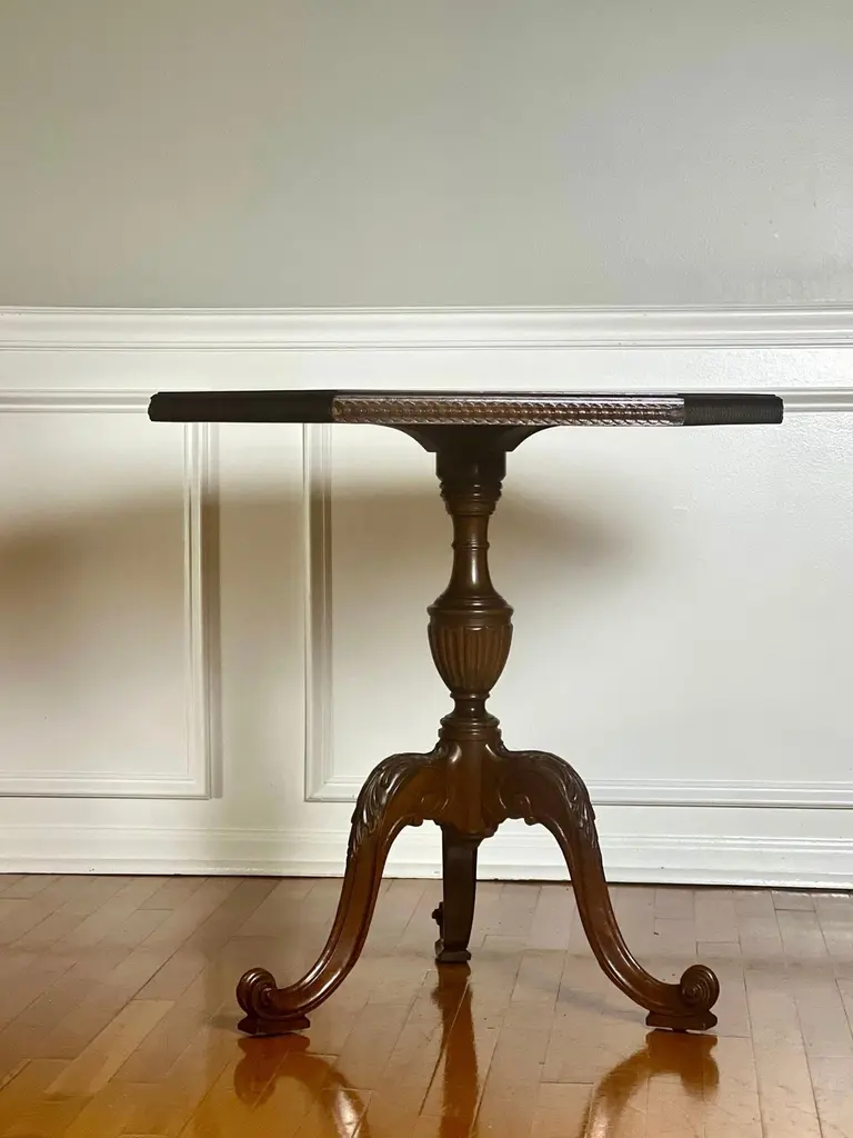 Exceptional French walnut burl hexagon shaped occasional, center hall or side pedestal table on a tripod base, circa 1930s. Richly carved with a book-matched and banded top with intricate stylized floral edge detail supported by an urn decorated pedestal on three cabriole legs with carved large acanthus leaves ending in scrolled feet. This is a gorgeous table with fabulous attention to detail boasting all the hallmarks of fine French craftsmanship and style. A versatile piece which will suit a variety of settings.29"h x 30"w x 28"d