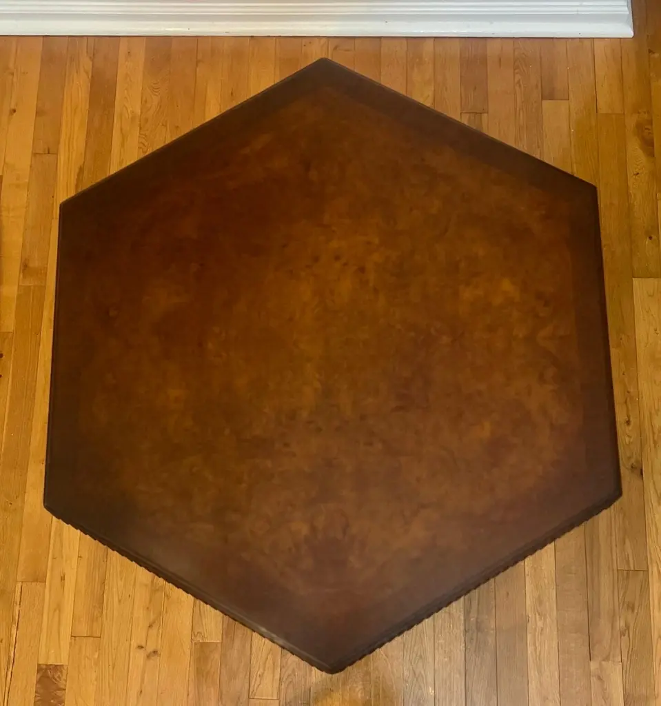 French Carved And Book-Matched Walnut Burl Hexagonal Pedestal Table