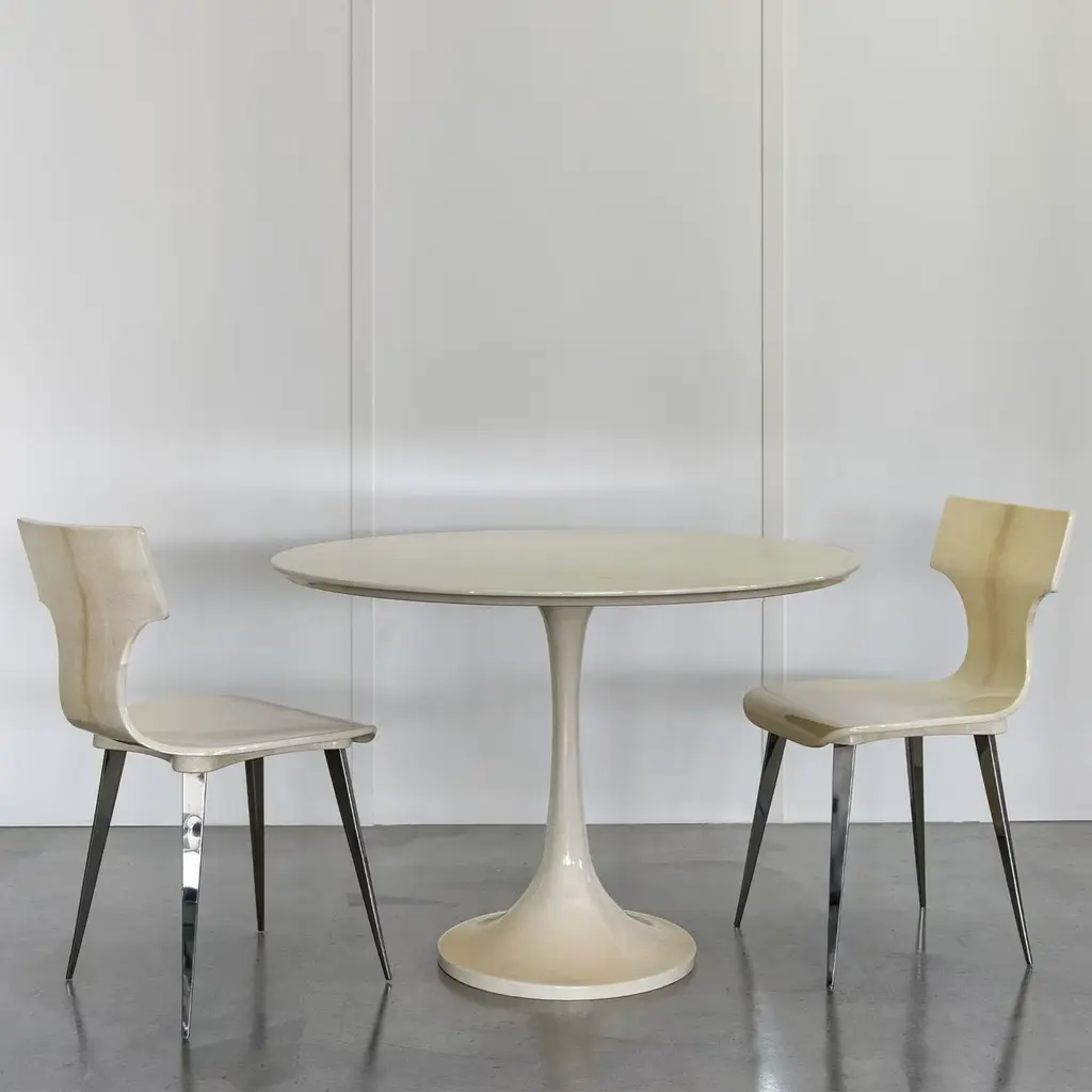 Echoing the harmonious and sleek design of Saarinen's pedestal table, this design rewrites its simplicity through a superb complete covering in natural parchment. A stunning high gloss finish seals the piece, making it waterproof and enhancing every unique detail of its extra-thin goatskin cover. This piece will surely elevate refined dining rooms or lounge areas.