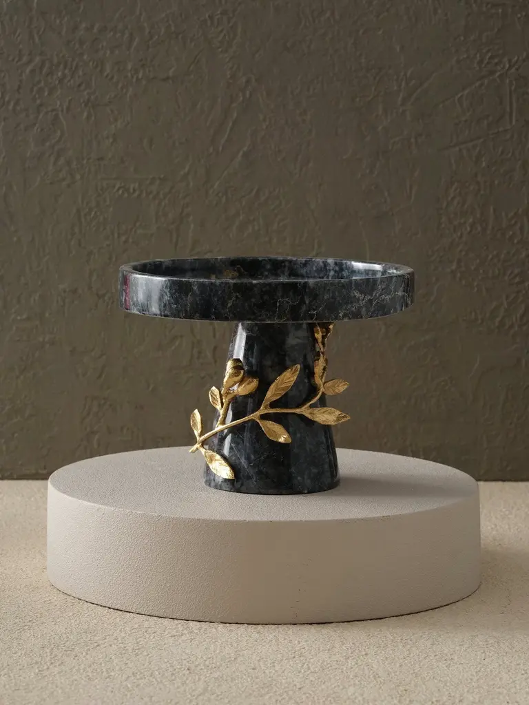Elegant and grounded in nature, the Grey Marble Pedestal Stand With Gold Leaf Detail combines timeless materials with sculptural artistry. Carved from richly veined grey marble, the round top is elevated by a solid conical base adorned with delicate gold-finish leaf accents that wrap gracefully around the structure. The contrast of natural stone and metallic detailing brings refined sophistication to any space.Ideal for displaying cakes, tarts, fruits, or even candles and decor objects, this stand transforms everyday presentation into a curated moment of beauty.